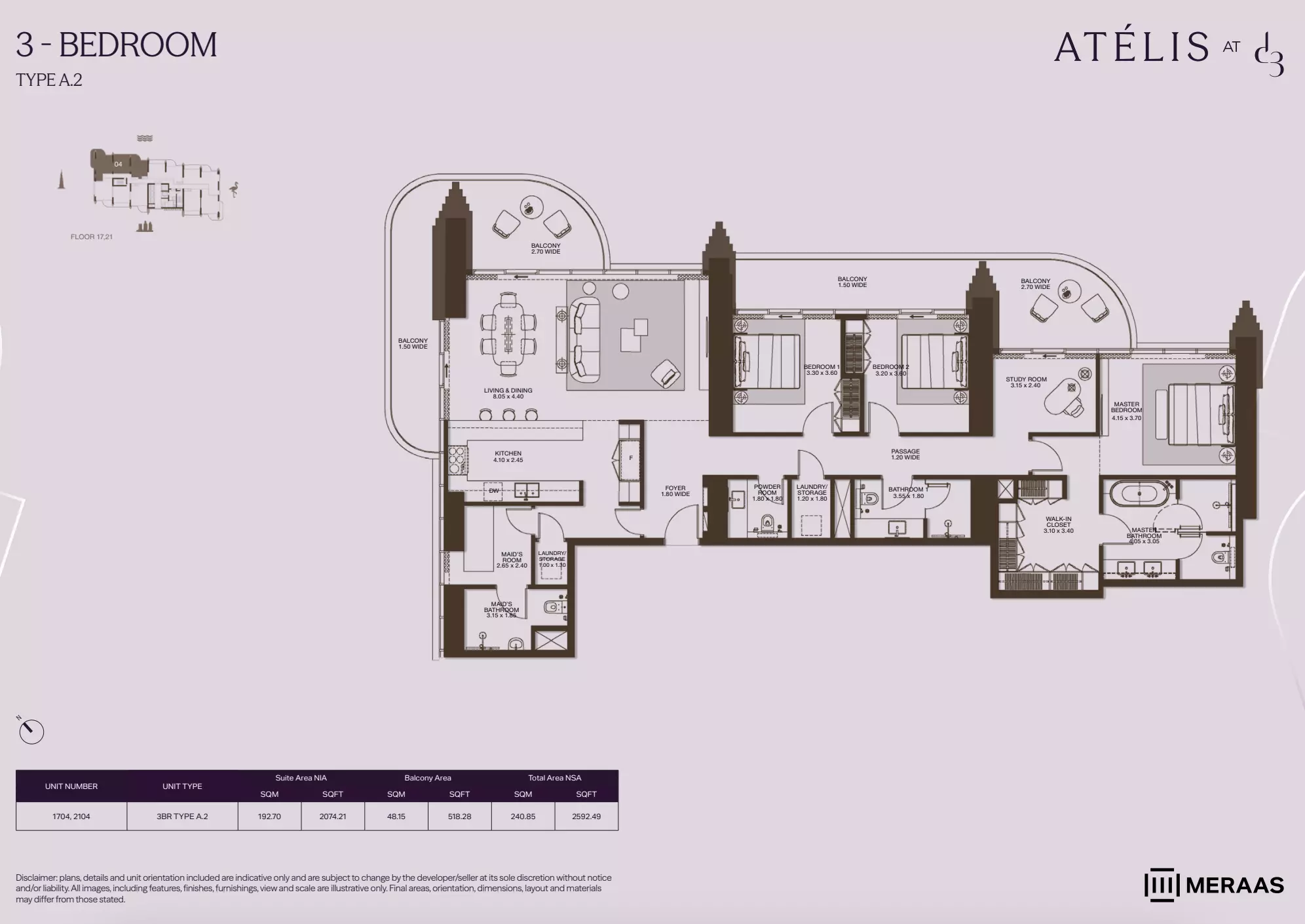 Atelis offers a variety of premium housing options, including apartments, penthouses, and villas, catering to a range of preferences and budgets. The apartment units start with 1-bedroom layouts, priced from AED 2.1 million, and range in size from 749 to 1,139 square feet. The 2-bedroom apartments are available from AED 3.8 million, with sizes between 1,341 and 2,032 square feet. For larger families or those needing more space, 3-bedroom apartments begin at AED 7.4 million and span 2,124 to 2,592 square feet. The 4-bedroom apartments are priced from AED 10 million, offering spacious interiors ranging from 2,859 to 3,367 square feet. At the top end of the apartment offerings, 5-bedroom penthouses are available from AED 22 million, with generous floor areas ranging between 6,252 and 7,277 square feet, offering expansive views and luxury finishes. For those seeking a standalone home, Atelis also provides 4-bedroom villas starting from AED 13 million, with unit sizes between 6,044 and 6,535 square feet. These options make Atelis a premium residential destination for buyers seeking spacious, high-end living spaces.