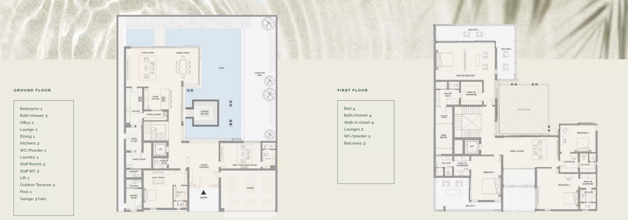 • 5-Bedroom Villas: Size: 6,670 to 8,820 sqft, Design Elements: Features spacious living areas, sunken lounges, expansive verandas, and integrated pools that seamlessly merge indoor and outdoor spaces.