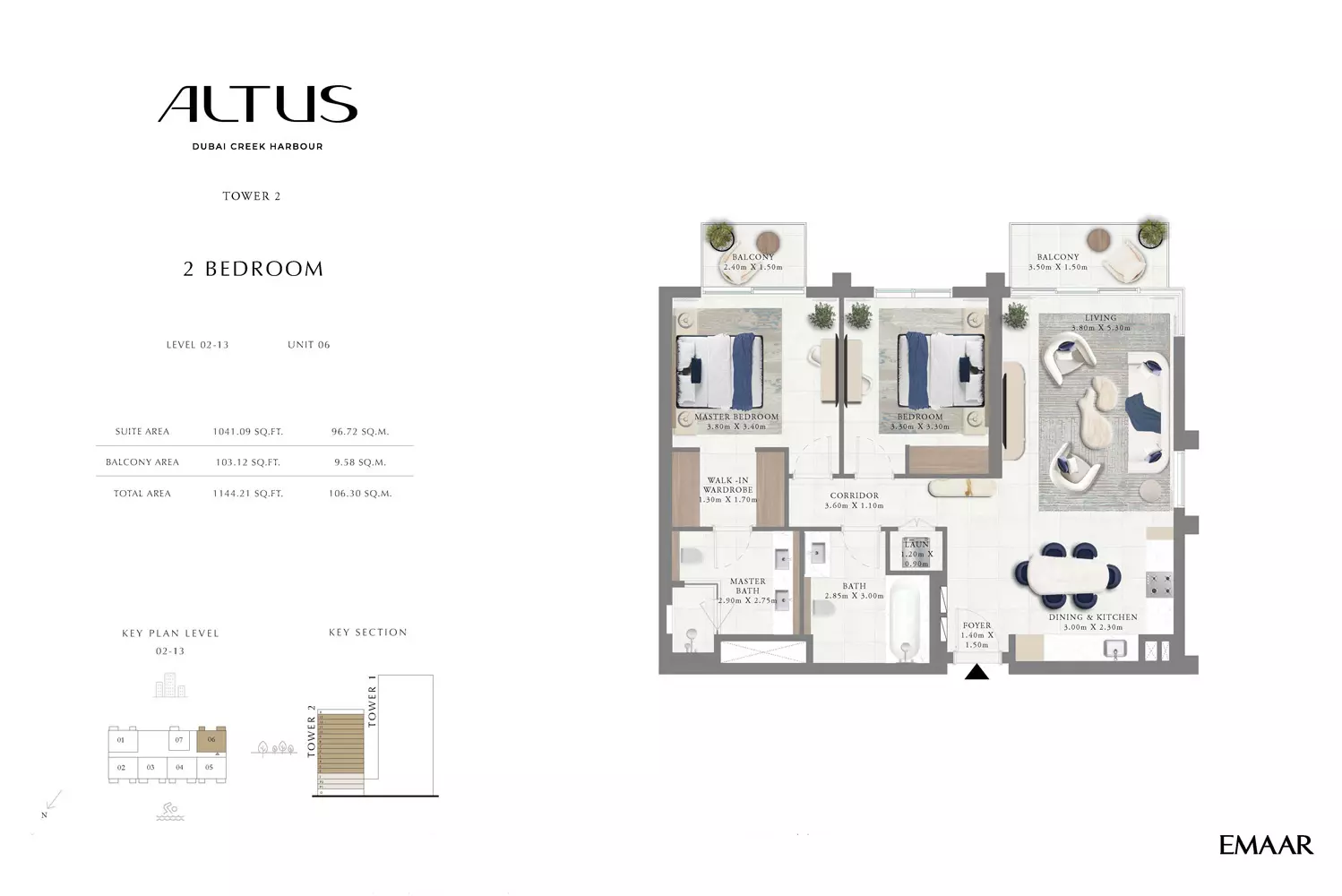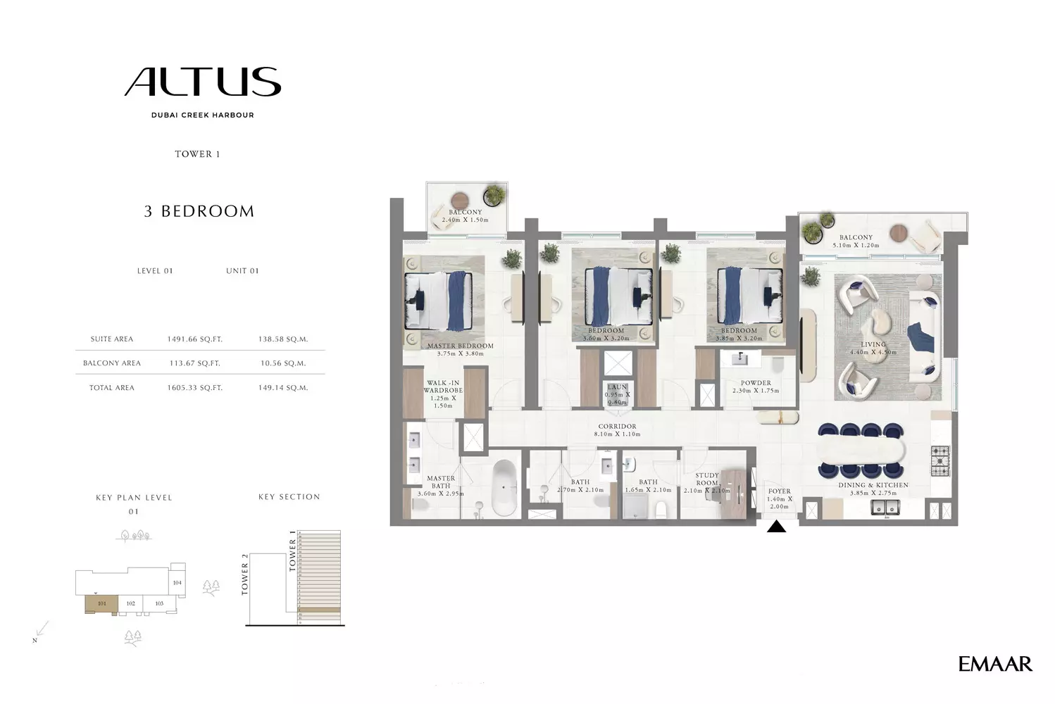 Emaar Altus offers a variety of apartment options in Tower 1: 1 Bed apartments, ranging from 664 to 822 sqft. 2 Beds apartments, with sizes from 1163 to 1408 sqft. 3 Beds apartments, spanning from 1596 to 1927 sqft. Tower 2 offers modern apartment options with spacious layouts: 1 Bed apartments, with a size of 765 sqft. 2 Beds apartments, ranging from 1138 to 1453 sqft. These apartments are designed to provide a luxurious living experience, featuring contemporary finishes and ample space. Tower 2's strategic location in Dubai Creek Harbour offers residents stunning views and access to world-class amenities, making it an ideal choice for those seeking a blend of comfort and style in a prime location. Prices may vary depending on unit size and availability.