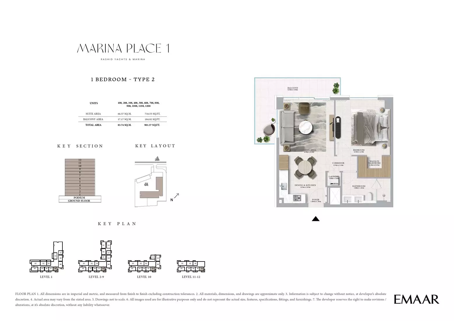 Marina Place offers a variety of modern apartments and townhouses: • 1 Bedroom Apartments: Sizes ranging from 817 to 944 sqft, starting from 2,100,000 AED. • 2 Bedroom Apartments: Sizes ranging from 1,164 to 1,661 sqft, starting from 3,100,000 AED. • 3 Bedroom Apartments: Sizes ranging from 1,722 to 2,099 sqft, starting from 4,300,000 AED. • 3 Bedroom Townhouses: Size of 2,660 sqft, starting from 9,000,000 AED.