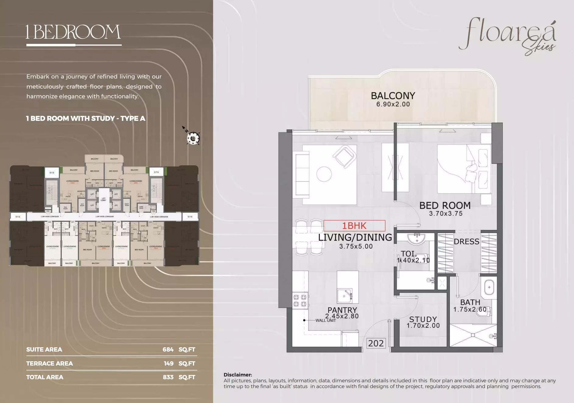 Floarea Skies offers the following housing options: • Studio: Ranging from 398 sq. ft., with prices between AED 666,000. • 1 Bedroom: With sizes ranging from 717 sq. ft. to 836 sq. ft., priced between AED 1.05 million and AED 1.2 million. • 2 Bedroom + Study: Sizes range from 1,105 sq. ft. to 1,170 sq. ft., with a price of AED 1.5 million. These options provide a variety of living spaces catering to different preferences and budget ranges within Floarea Skies.