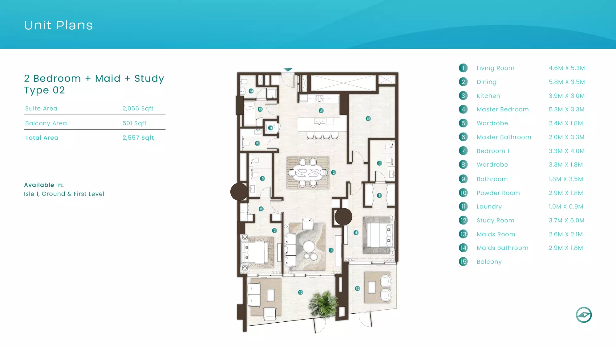 La Mer by Elie Saab offers luxurious apartments in various configurations: 1 Bed apartments, with sizes ranging from 1,019 to 2,026 sqft, starting from 1.9M AED. 2 Bed apartments, with sizes between 1,108 to 2,638 sqft, starting from 3.1M AED. 3 Bed apartments starting from 5.2M AED (specific sizes not mentioned). 4 Bed apartments with a size of 3,337 sqft. These properties are designed with high-end finishes and offer a premium lifestyle in the sought-after location of Al Marjan Island, Ras Al Khaimah.