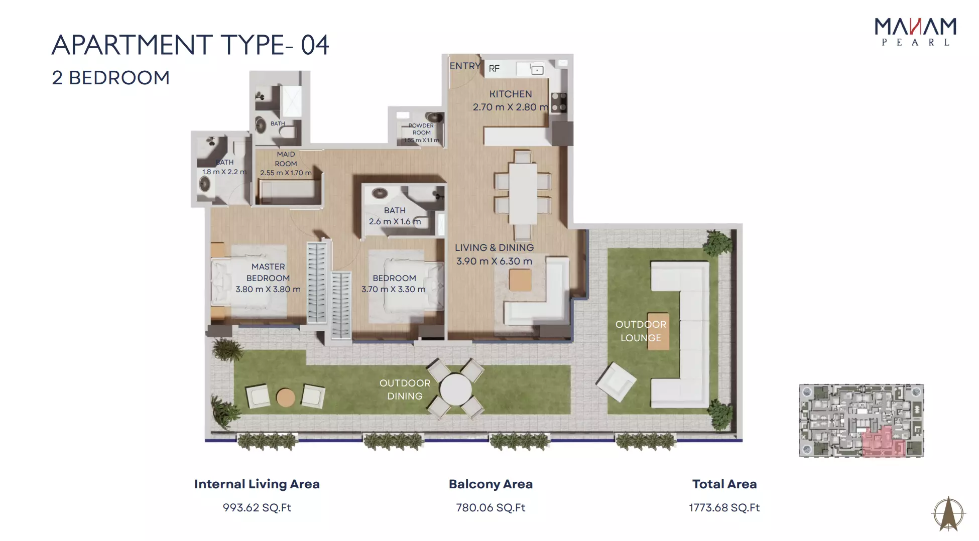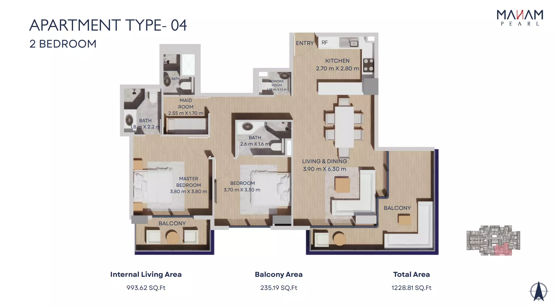 Manam Pearl offers a range of spacious apartment units designed for modern living. The housing options include one-bedroom, two-bedroom, and three-bedroom apartments. One-bedroom units start from AED 1.1 million and range in size from 821 to 1,092 square feet. Two-bedroom apartments are priced from AED 1.7 million, with sizes between 1,228 and 2,398 square feet. Three-bedroom units begin at AED 2.4 million and offer expansive living spaces ranging from 1,697 to 3,181 square feet. Each unit is designed with high-quality finishes, functional layouts, and ample natural light, making Manam Pearl an appealing option for end-users and investors alike.