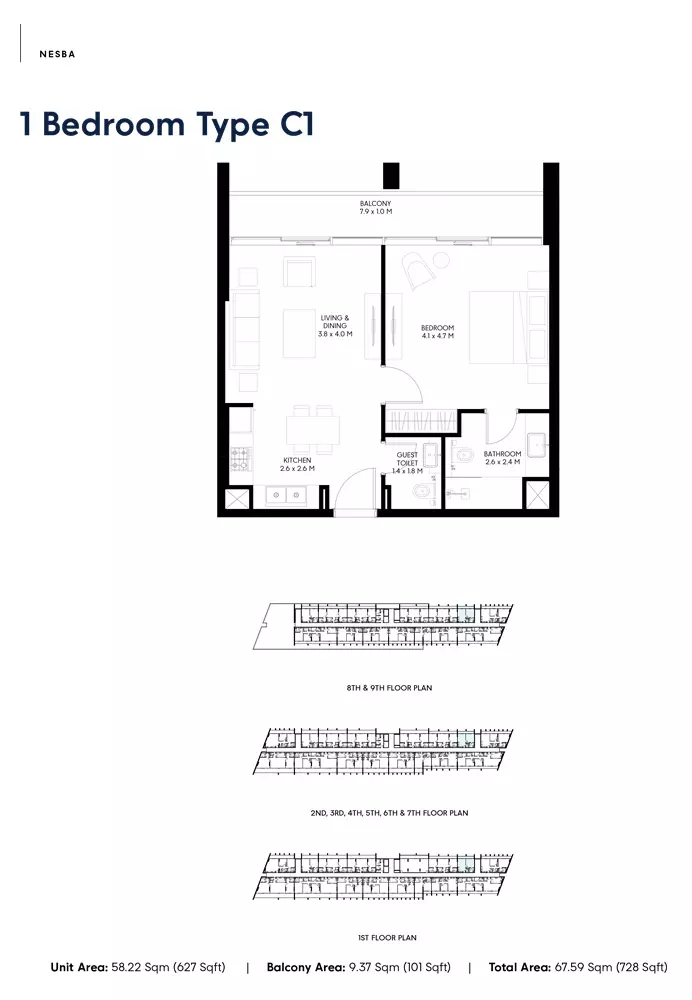Nesba 3 offers a selection of well-designed apartments with various sizes to cater to different needs. The available housing options include: 1-bedroom apartments, with sizes ranging from 717 to 811 square feet, ideal for individuals or couples seeking a compact living space. 2-bedroom apartments, ranging from 1081 to 1927 square feet, perfect for small families or those needing additional space for work and relaxation. 3-bedroom apartments, sized between 1795 to 2252 square feet, offering more spacious living areas for larger families or those seeking more luxury. These apartments offer modern living spaces within Sharjah’s vibrant Aljada community.