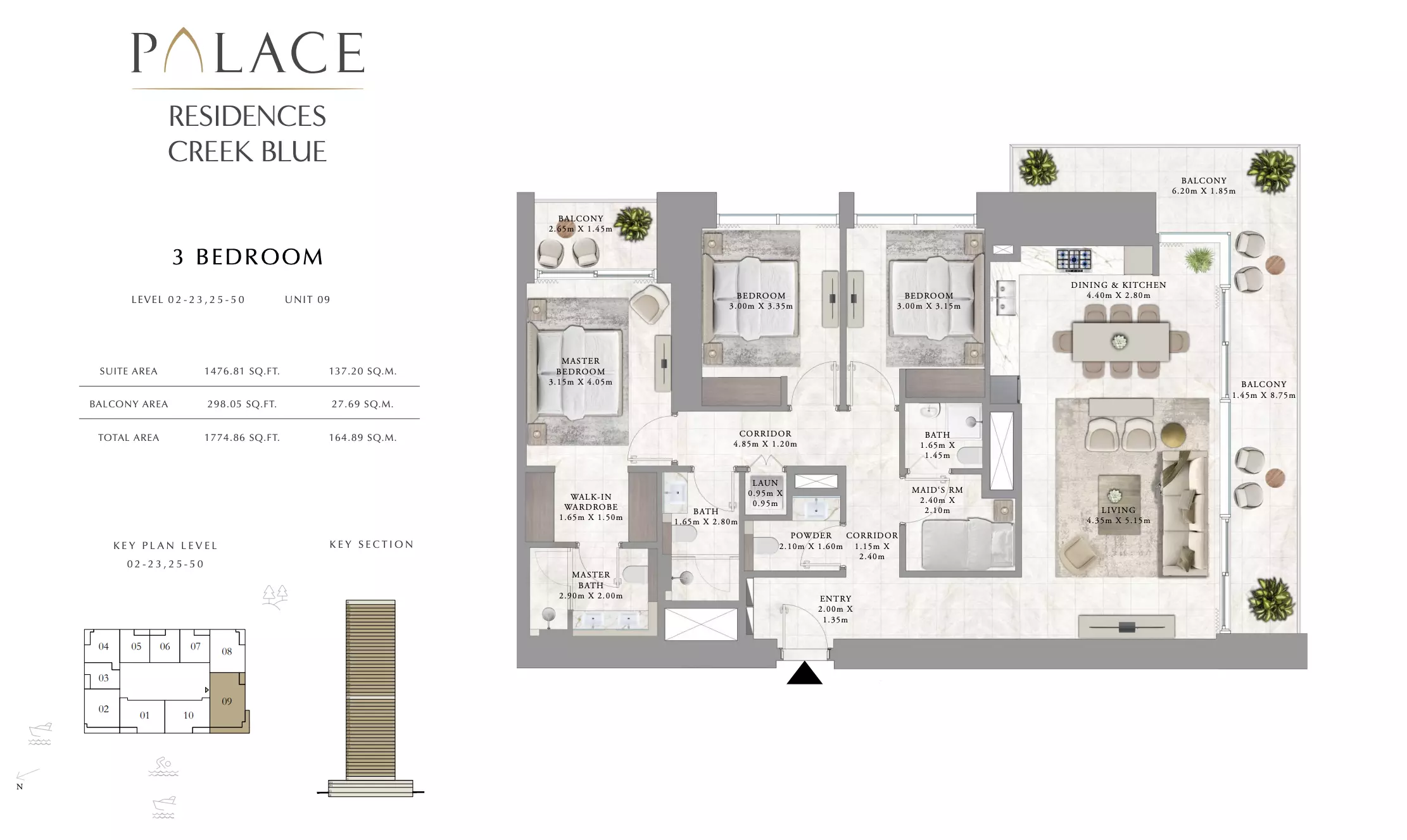 Palace Residences Creek Blue offers a range of apartments in different sizes and price points: 1-bedroom apartments start from 1.9 million AED, with sizes ranging from 727 to 910 square feet, ideal for individuals or couples. 2-bedroom apartments start from 2.9 million AED, with sizes ranging from 1,119 to 1,233 square feet, suitable for small families or those requiring more space. 3-bedroom apartments start from 4.9 million AED, with a fixed size of 1,774 square feet, offering spacious living for larger families. These apartments are designed to provide modern living spaces with luxury finishes in a sought-after location.