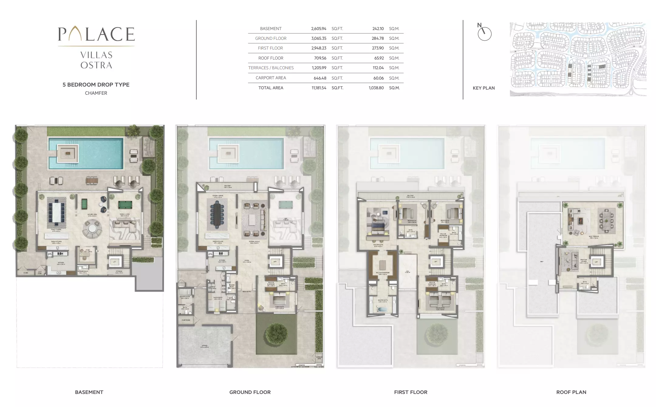 Palace Villas Ostra offers a premium selection of luxury villas designed to meet the needs of high-end buyers seeking space, comfort, and exclusivity. The development includes 4, 5, and 6-bedroom villas, each set on expansive plots with refined architectural finishes. • 4-Bedroom Villas start from AED 13,000,000, with sizes ranging between 7,268 to 7,301 sq ft. • 5-Bedroom Villas are priced from AED 15,000,000, offering living spaces between 7,922 to 11,181 sq ft. • 6-Bedroom Villas begin at AED 24,000,000, with unit sizes from 12,777 to 12,958 sq ft. All villas are designed to deliver seamless indoor-outdoor living, featuring private gardens, pools, and high-end interiors that reflect modern luxury.