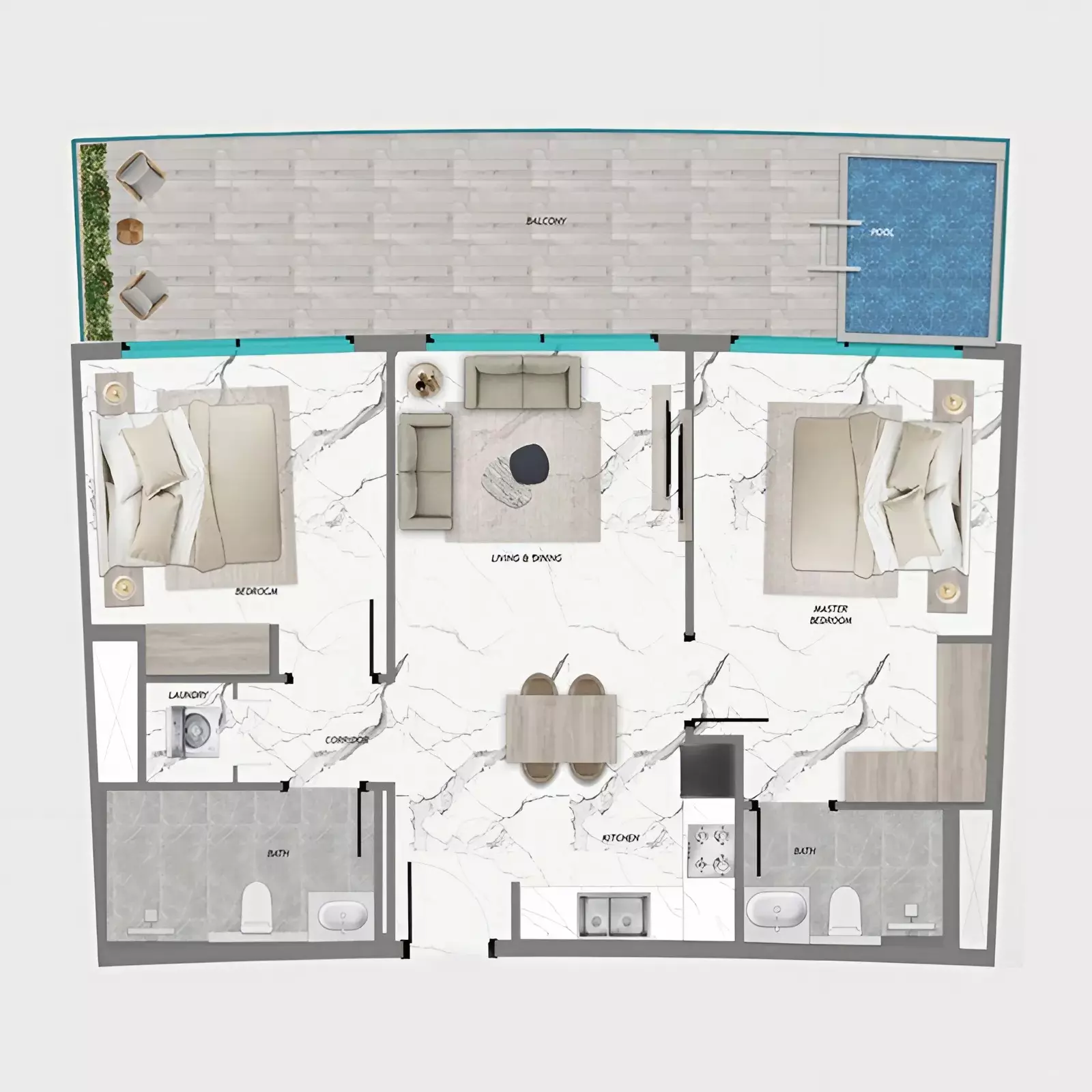 | Type A | 2 bedroom + pool | 1,074.00 | View |