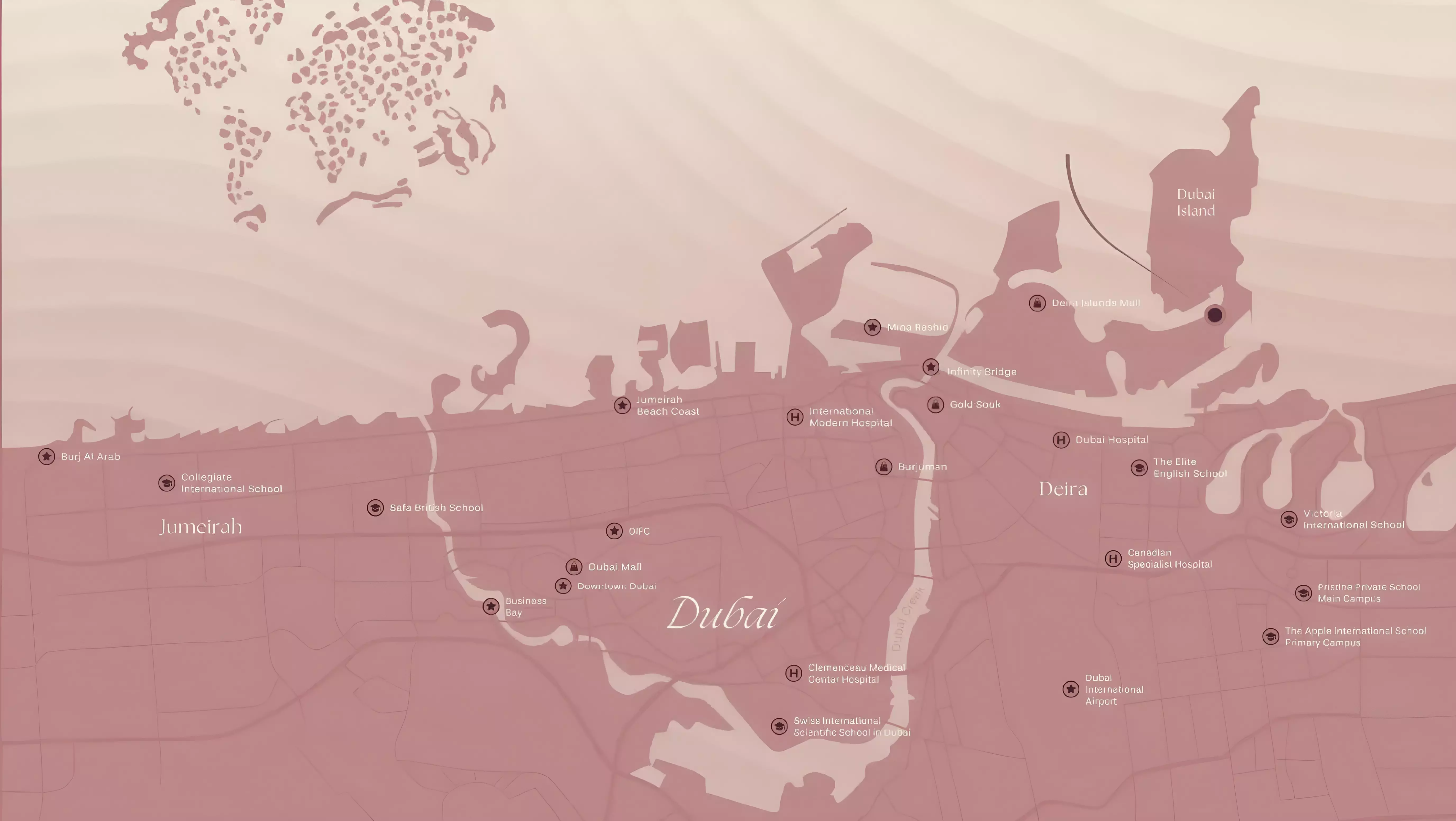 Selina at Dubai Islands is located on Dubai Islands, Deira, Dubai, United Arab Emirates, near the northern coastline of the city.