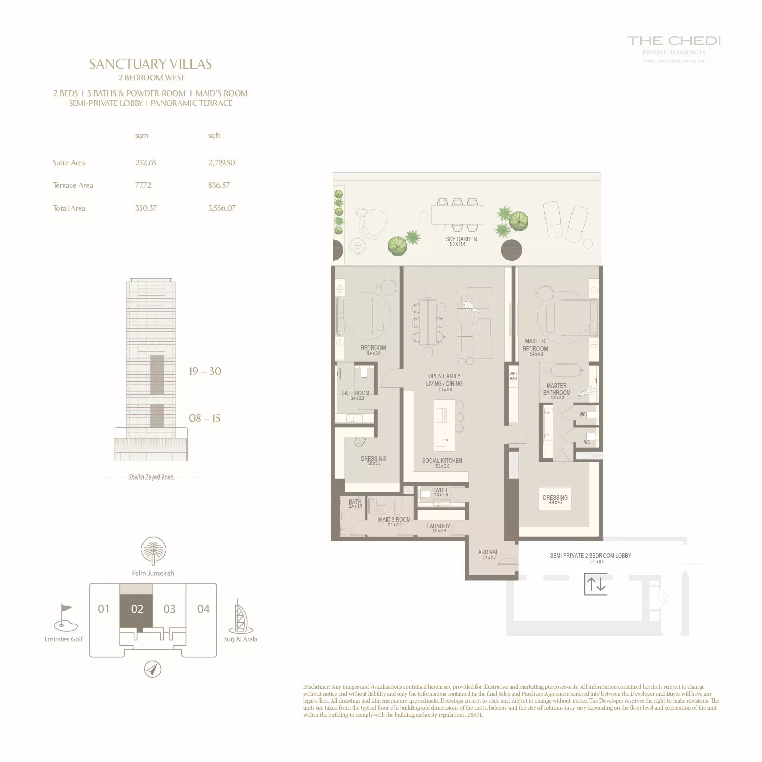 A dreamlike experience occurs here because extensive sky gardens stretch out from private terraces to create flawless spaces between home and outdoors. Privacy comes first at this development because each home is equipped with semi-private as well as elevator lobbies that create a private arrival experience. Every sky villa or sky Mansions, presents itself as a masterpiece offering residents exceptional private havens located above the city. Under Dubai sunshine, the signature architecture shows its glass exterior which depicts the city built by ambitious innovators. The Pinnacle Mansion alongside Sanctuary Villas form part of an exceptional residential lineup at the tower that includes the majestic duplex and triplex within the buildings.