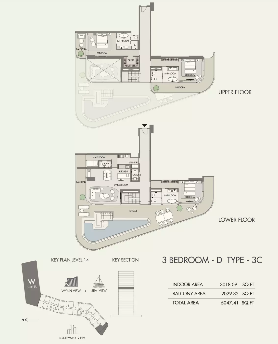 W Hotel & Residences offers a variety of luxurious living options, ranging from one-bedroom apartments to expansive multi-bedroom duplexes. One-bedroom apartments start from 4.1 million AED, with sizes between 1,087 and 1,600 square feet, offering stylish and functional layouts for singles or couples. Two-bedroom units are available from 6.6 million AED, spanning 1,606 to 1,984 square feet, providing ample space for families. Larger four-bedroom apartments cover 4,339 square feet, delivering generous living areas and premium finishes. The development also features duplex options, including two-bedroom units from 12 million AED measuring 1,865 to 3,051 square feet, and three-bedroom duplexes starting at 19 million AED with sizes ranging from 4,514 to 6,830 square feet, ideal for residents seeking unparalleled space and luxury.