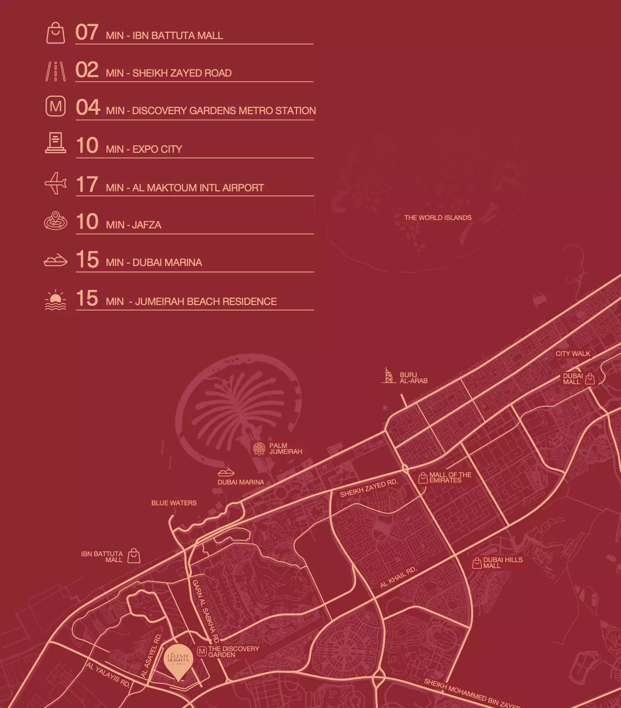 سلست هایتس در الفرجان، دبی واقع شده است و دسترسی راحت به گزینههای متنوع خرید، غذاخوری و مدارس را برای ساکنان فراهم میکند، همه در محیطی سرسبز و دلنشین.
