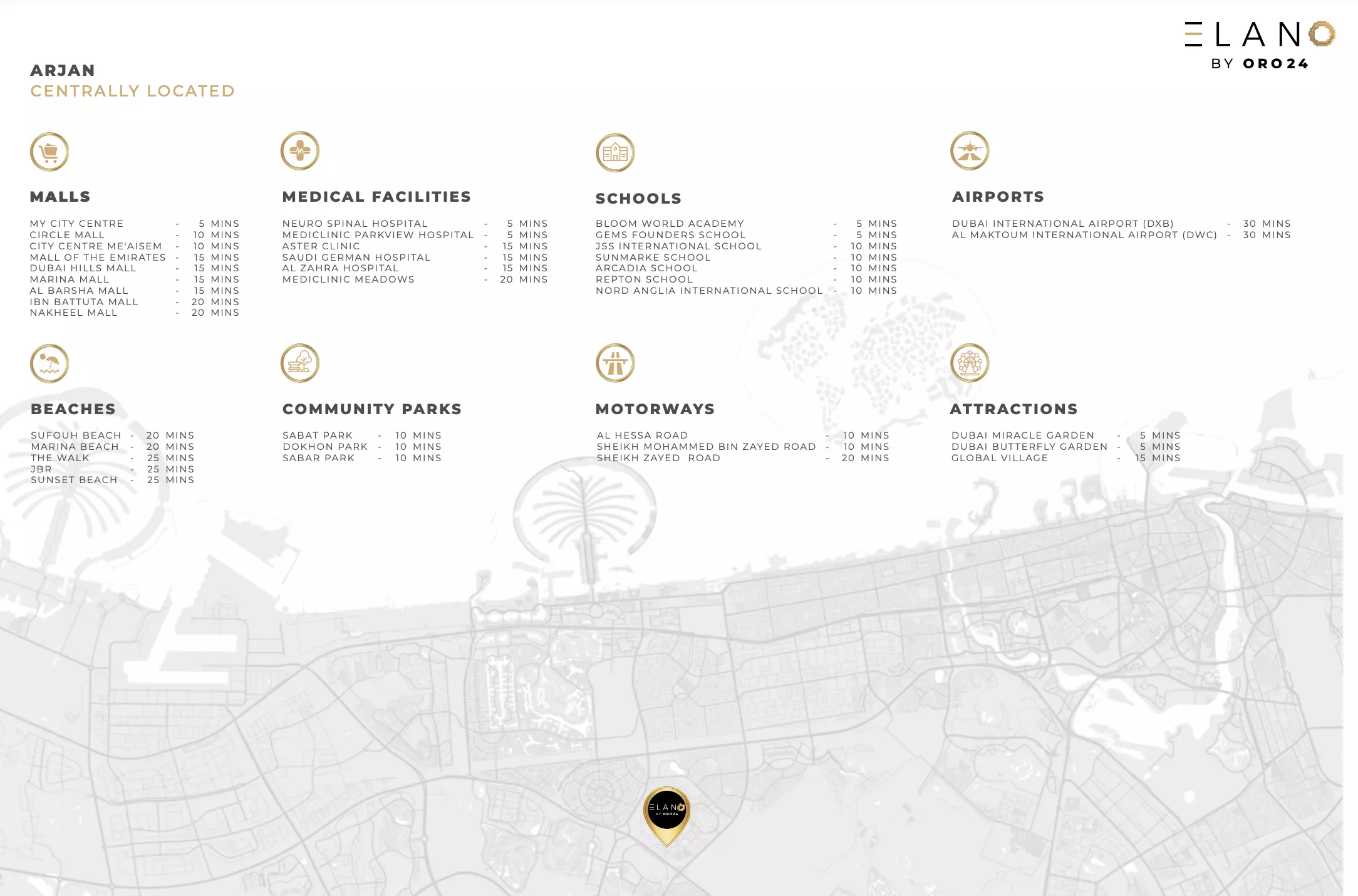 الانو بای اورو 24 موقعیت مکانی ممتازی را در ارجان با مناظر استثنایی و امکانات رفاهی مدرن ارائه میدهد. نزدیکی این پروژه به نقاط دیدنی کلیدی دبی، همراه با ارزش آپارتمانهای سطح بالا، آن را به یک گزینه سرمایه گذاری جذاب تبدیل میکند.