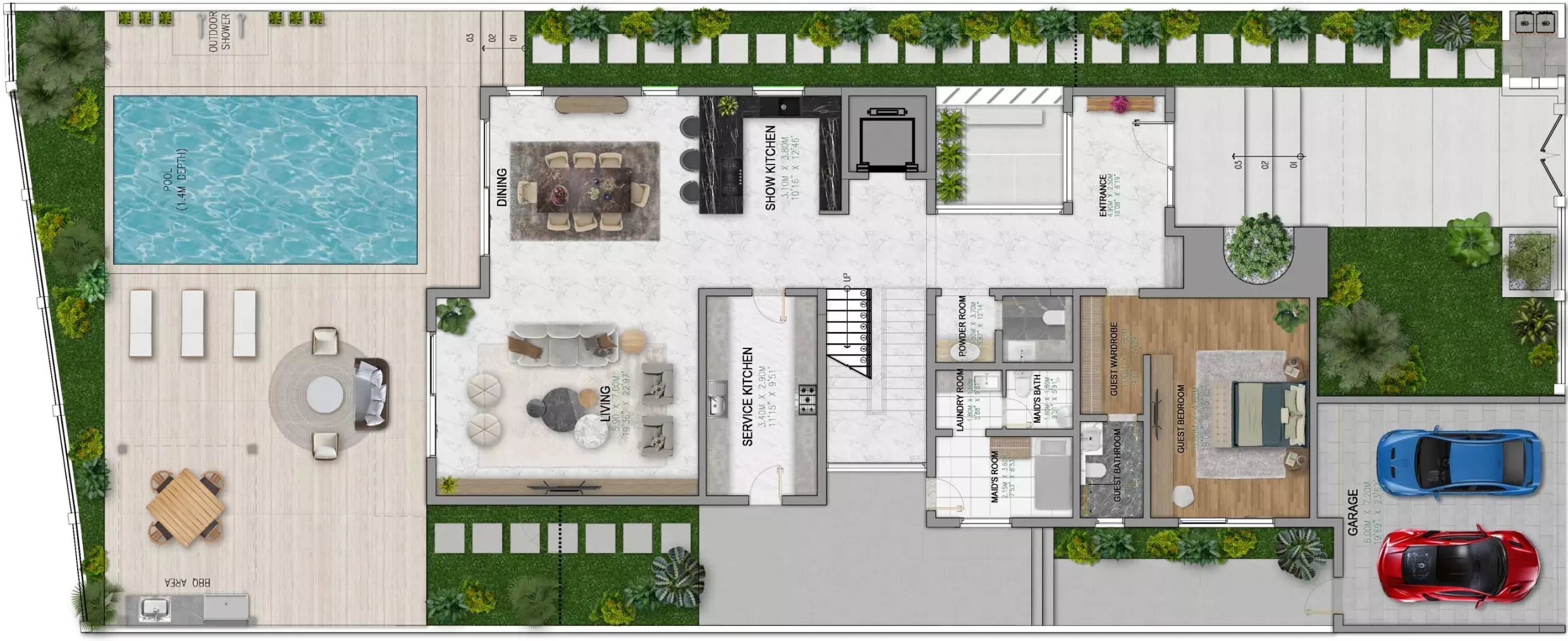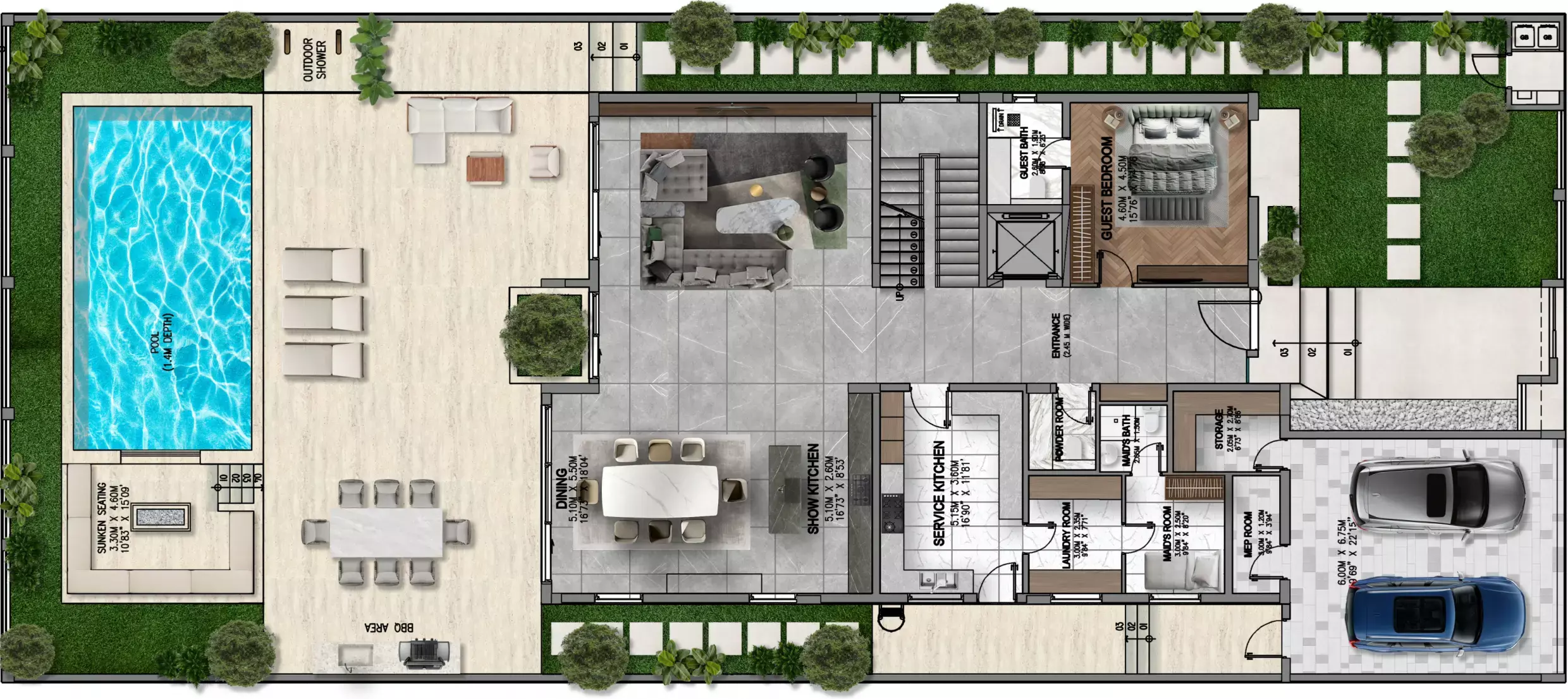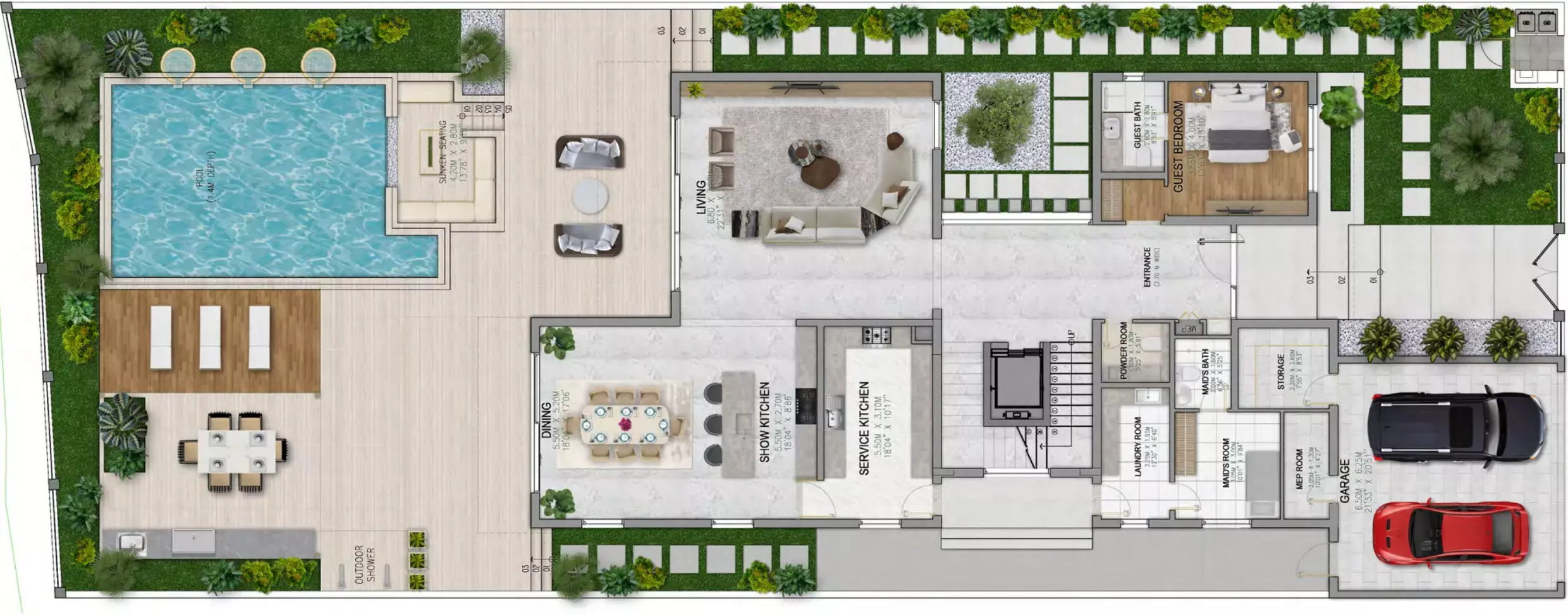 The villas feature adaptable spaces that can be used as home gyms, entertainment rooms, or kid-friendly play areas. The well-planned design guarantees the ideal balance between communal areas for entertaining guests and private retreats.