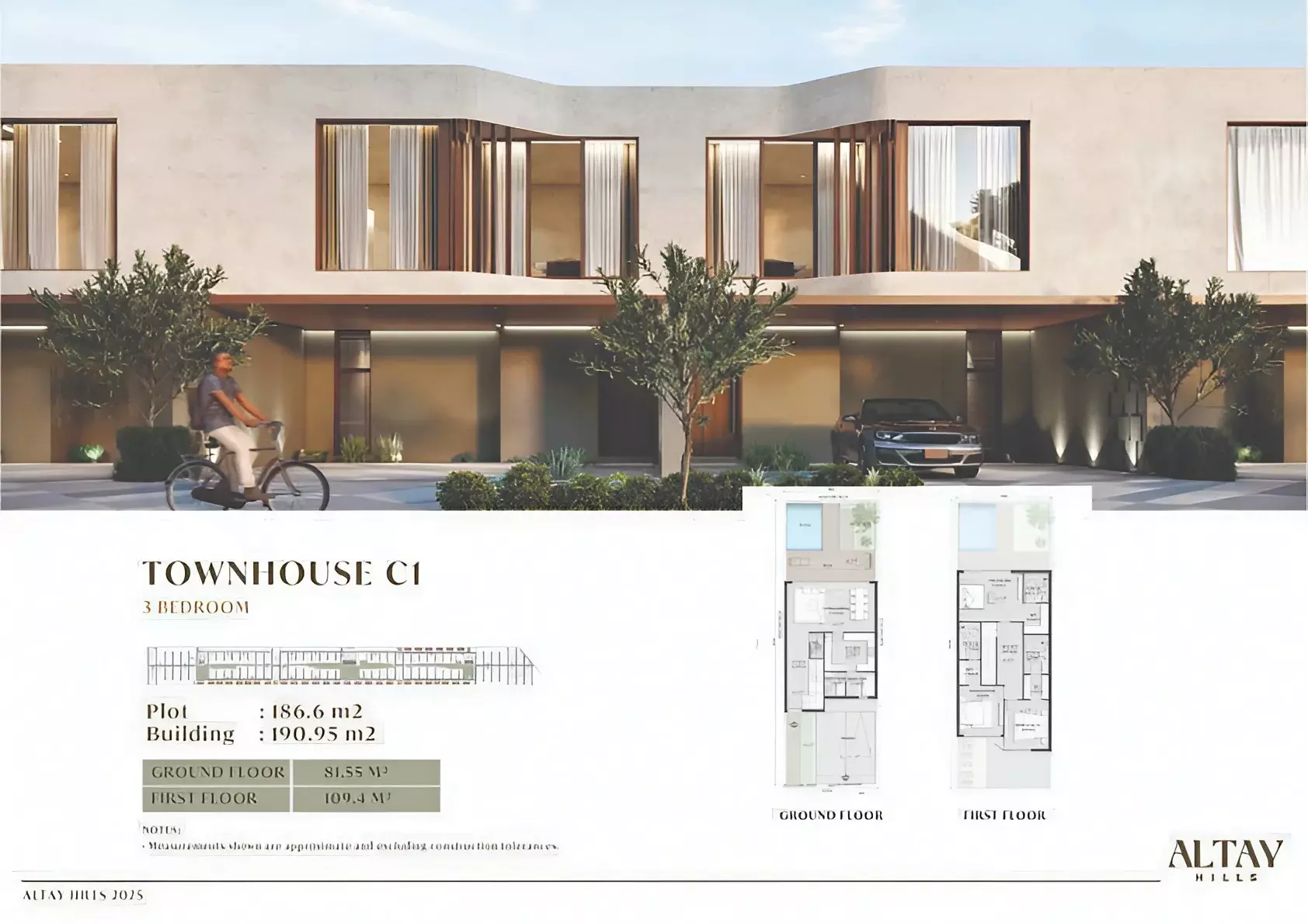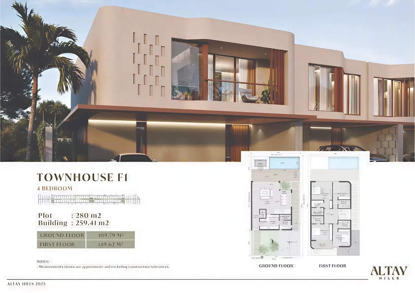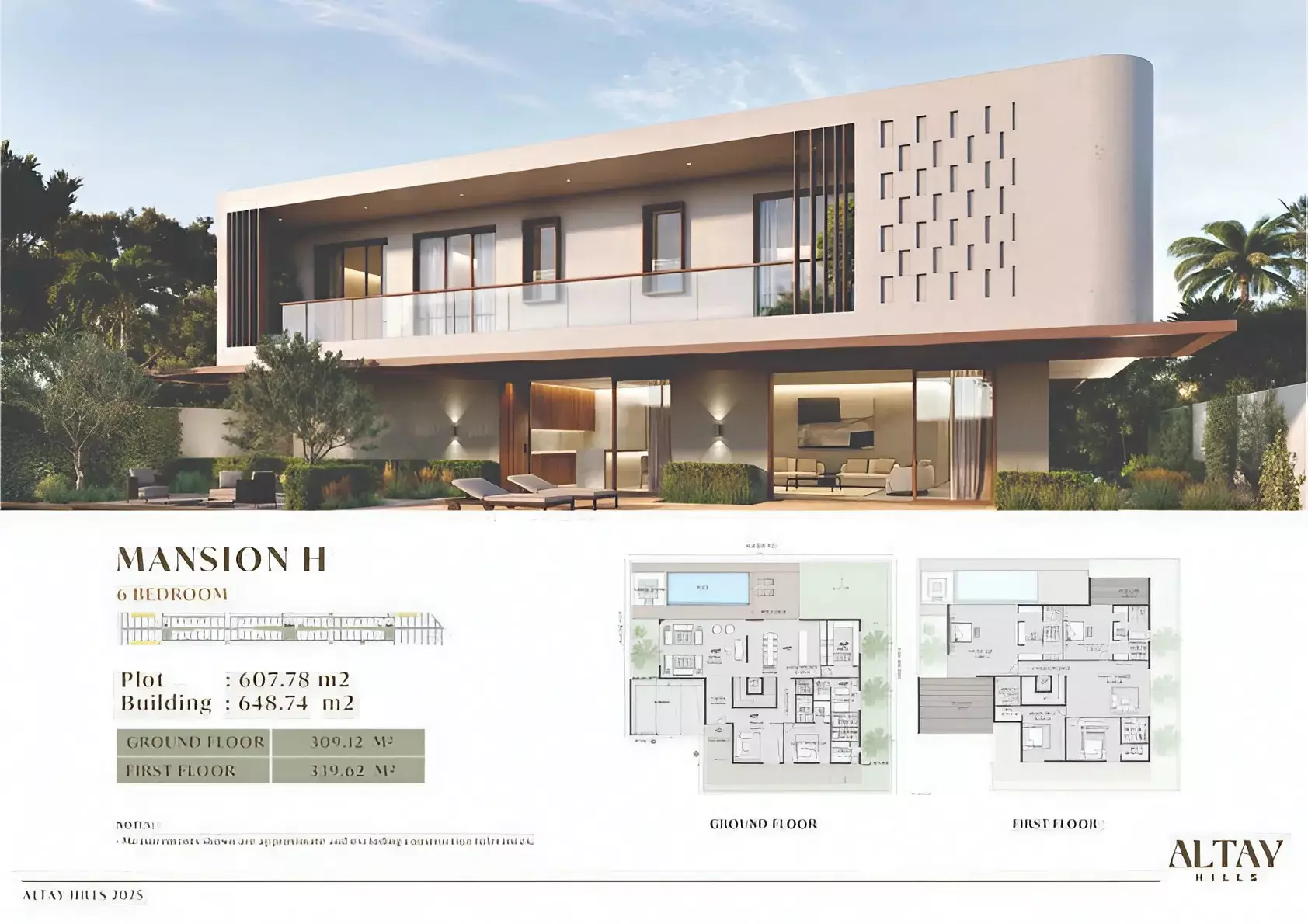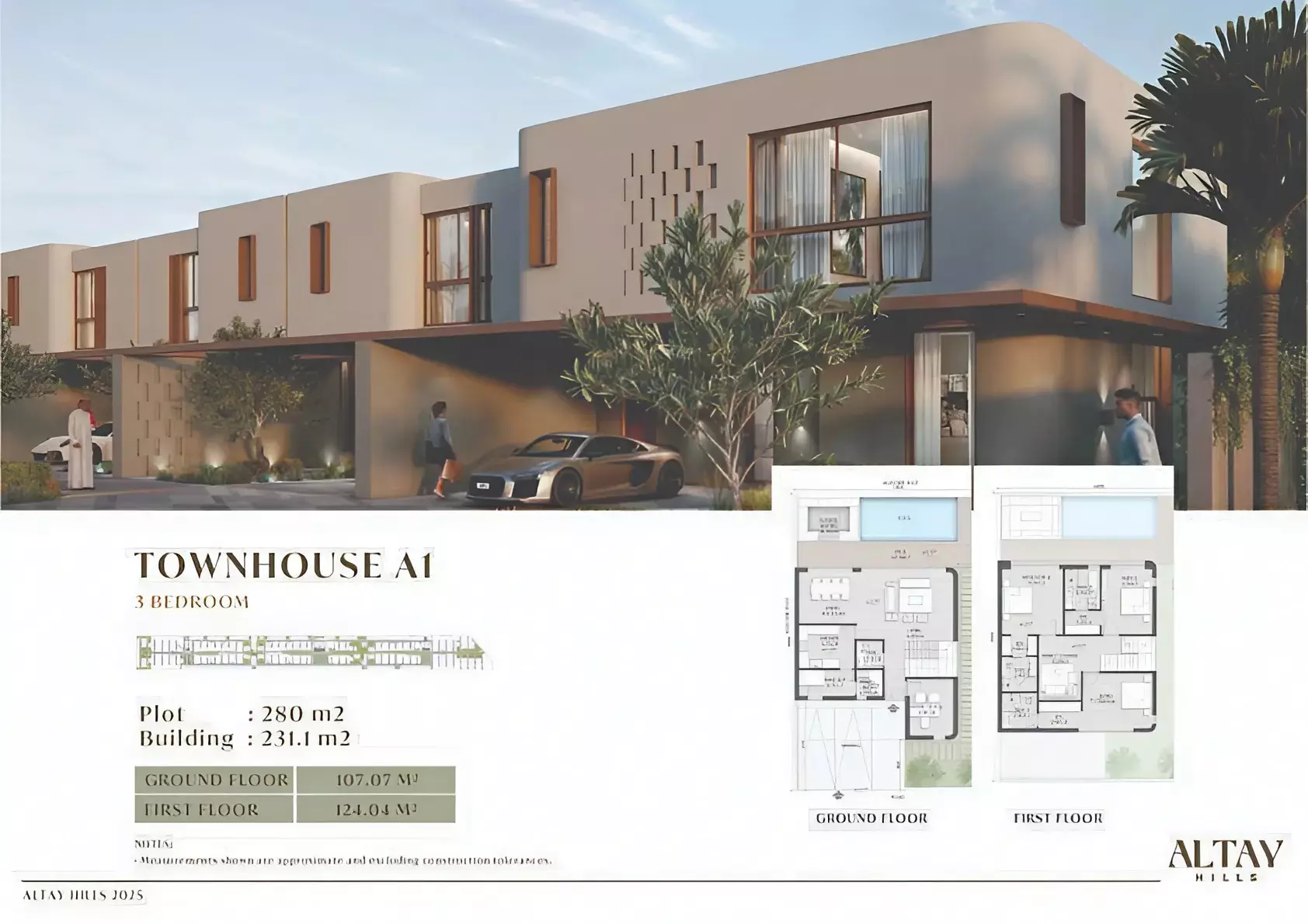 Altay Hills offers a variety of housing options, including townhouses and villas, with different sizes and price points: Townhouses: • 2 Bedrooms: 7,654 sqft • 3 Bedrooms: Starting from AED 1.8M, ranging from 2,023 to 3,013 sqft • 4 Bedrooms: Starting from AED 2.4M, with sizes of 3,013 sqft Villas: • 4 Bedrooms: Starting from AED 3.3M, with sizes between 4,144 and 5,328 sqft • 5 Bedrooms: Starting from AED 5.3M, with sizes of 6,149 sqft • 6 Bedrooms: Starting from AED 7.2M, ranging from 6,982 to 8,542 sqft These spacious units provide a variety of options for buyers seeking upscale living in a prime location.