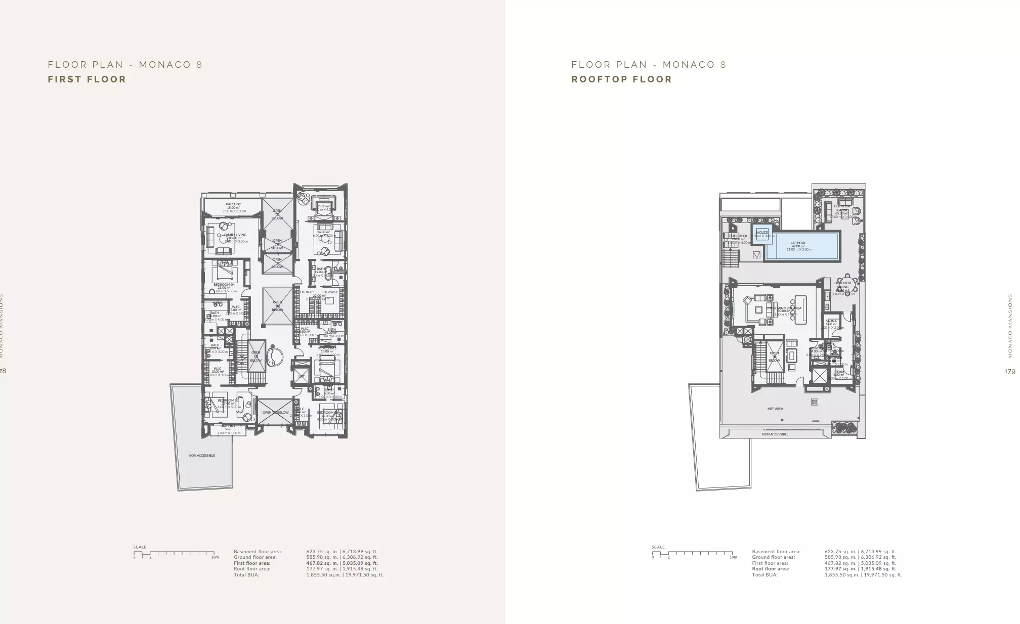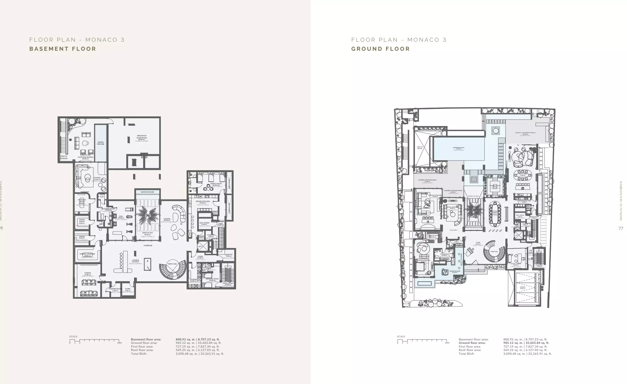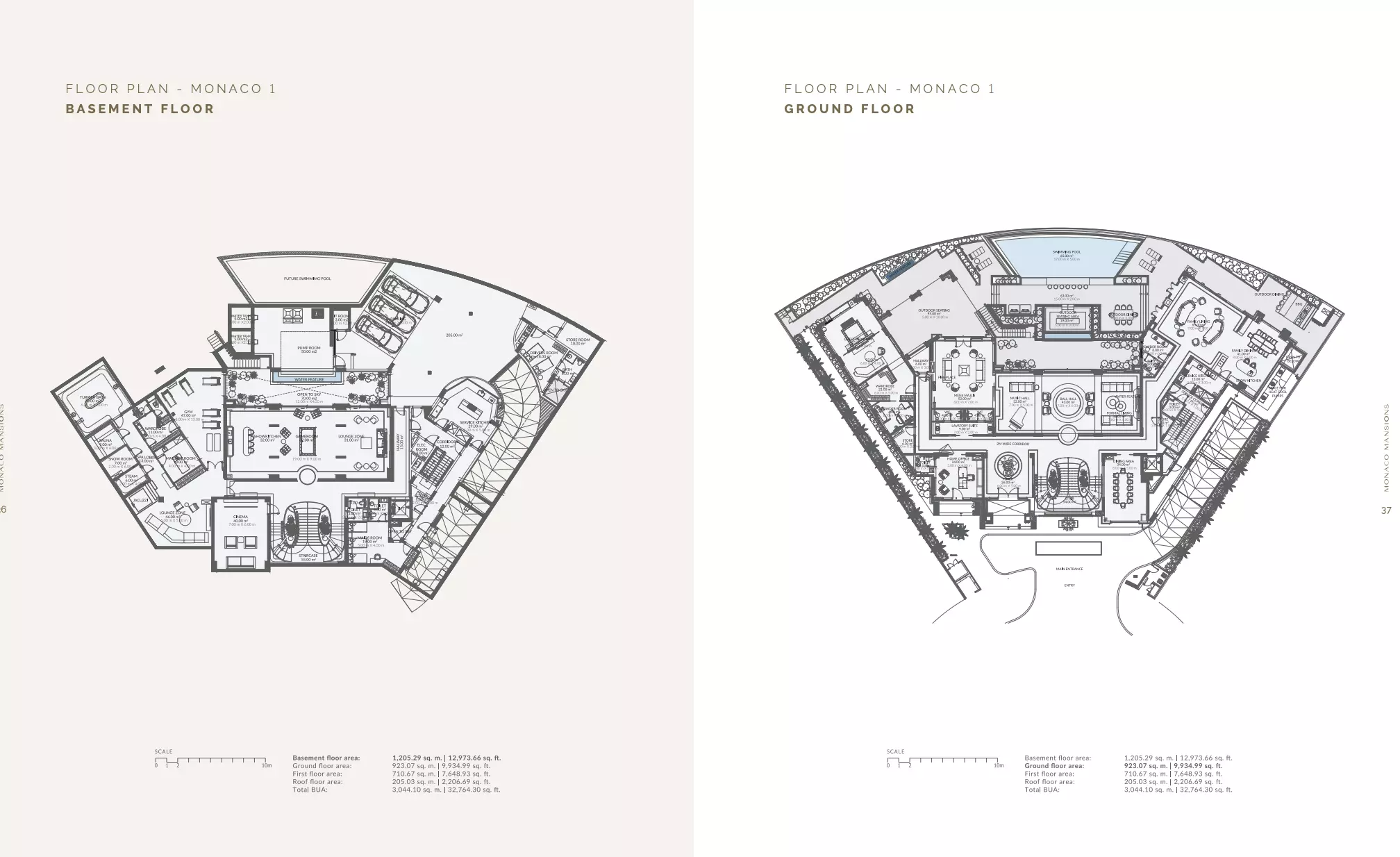 Monaco Mansions offers ultra-luxury villas with the following configurations: • 6-Bedroom Villas: Sizes ranging from 19,971 to 28,815 sqft • 7-Bedroom Villas: Approximately 35,845 sqft • 8-Bedroom Villas: Sizes ranging from 32,764 to 38,786 sqft