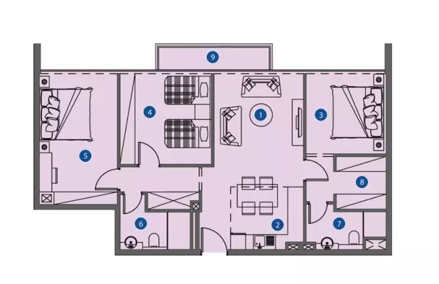 • Three-Bedroom Apartments (1310 sqft), These flats are designed for larger families, with spacious living areas and various bedrooms to ensure comfort and convenience.