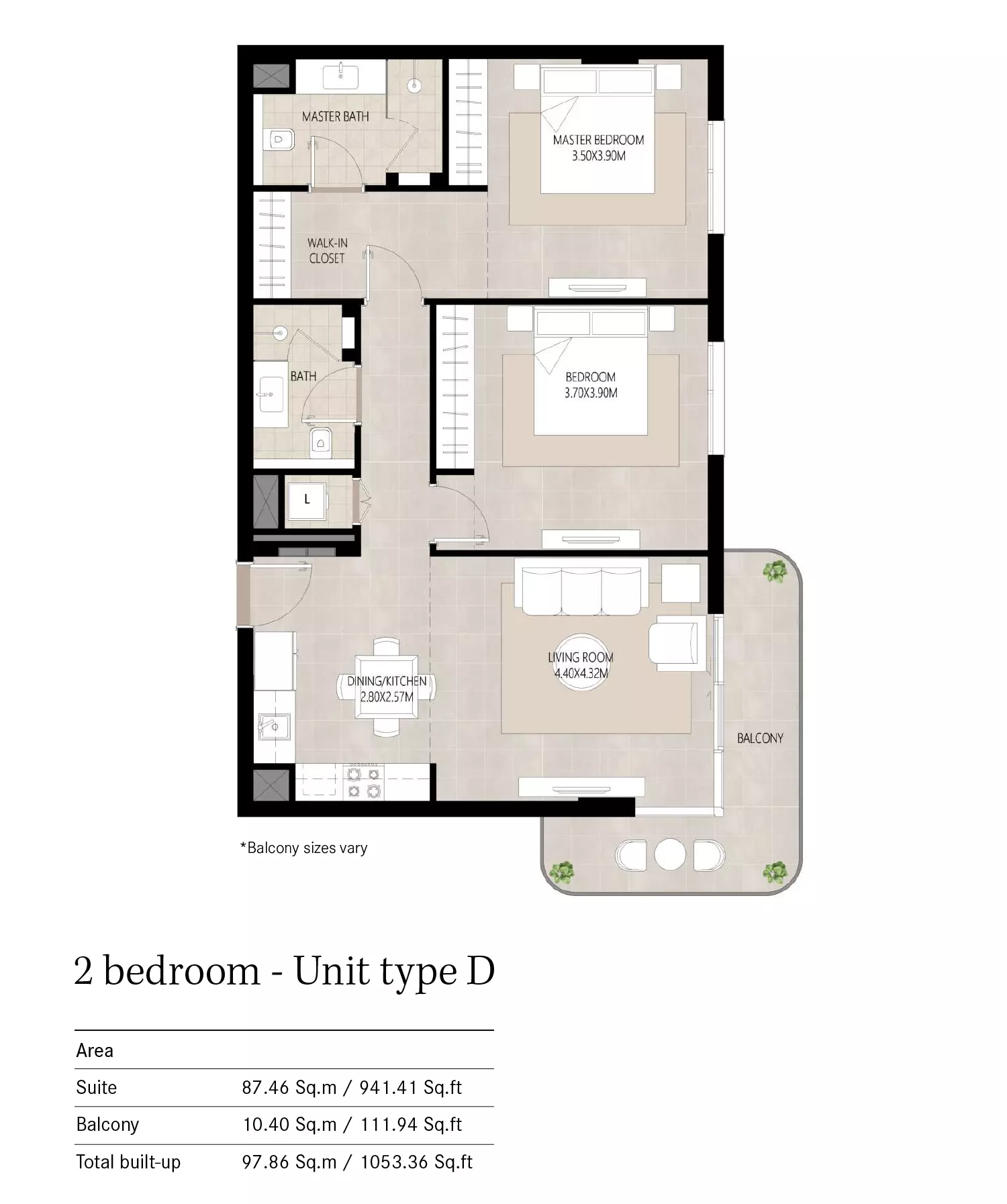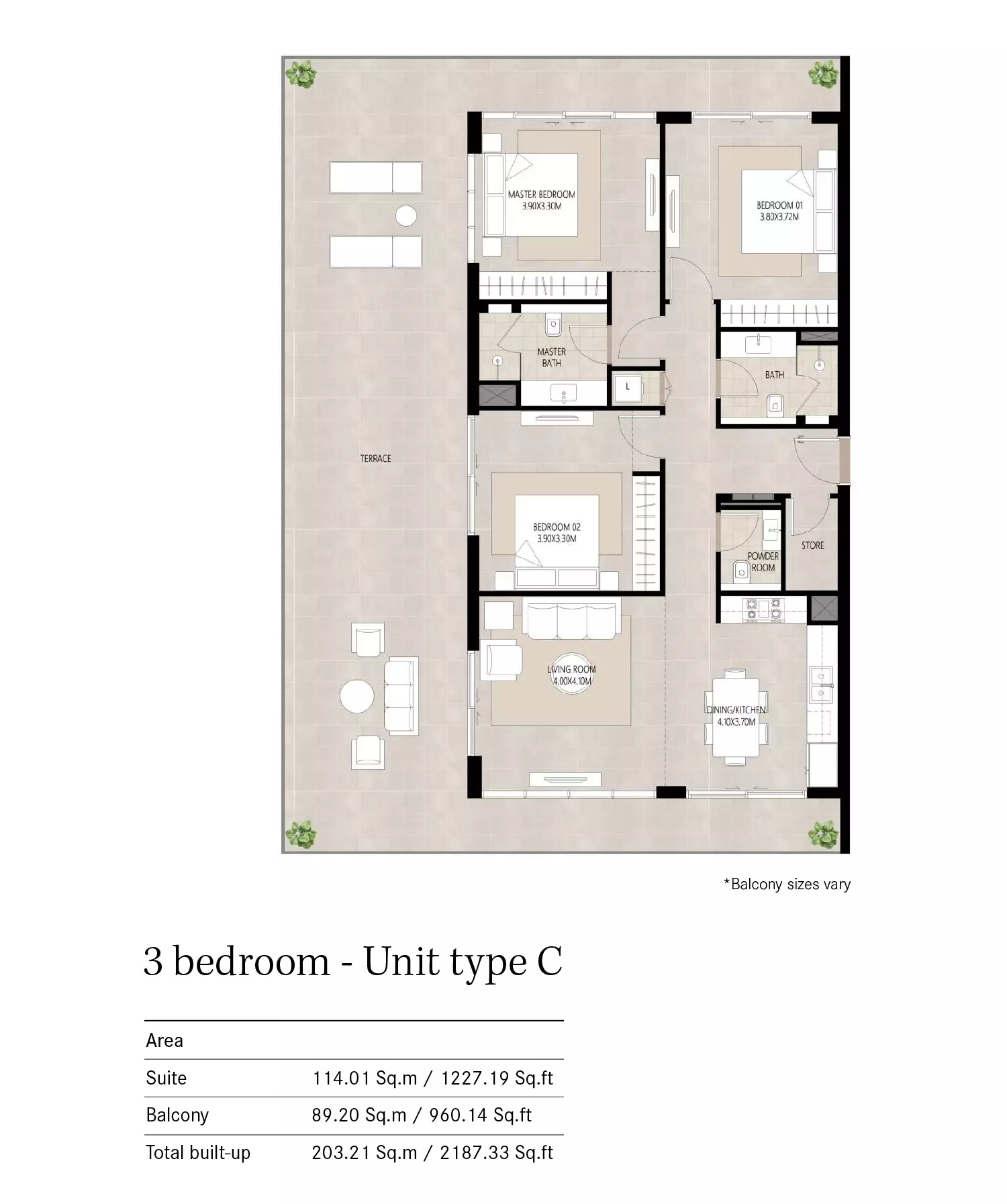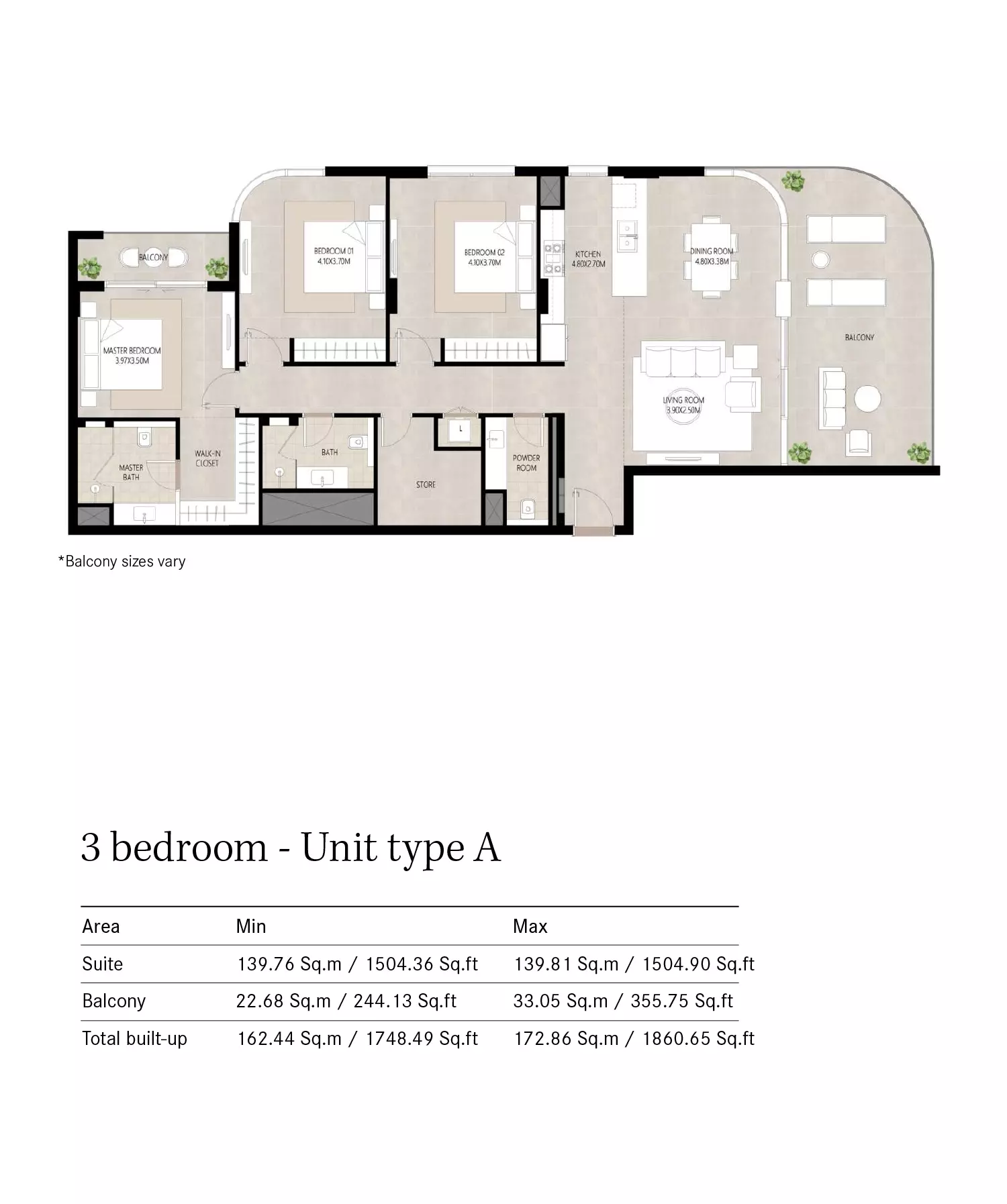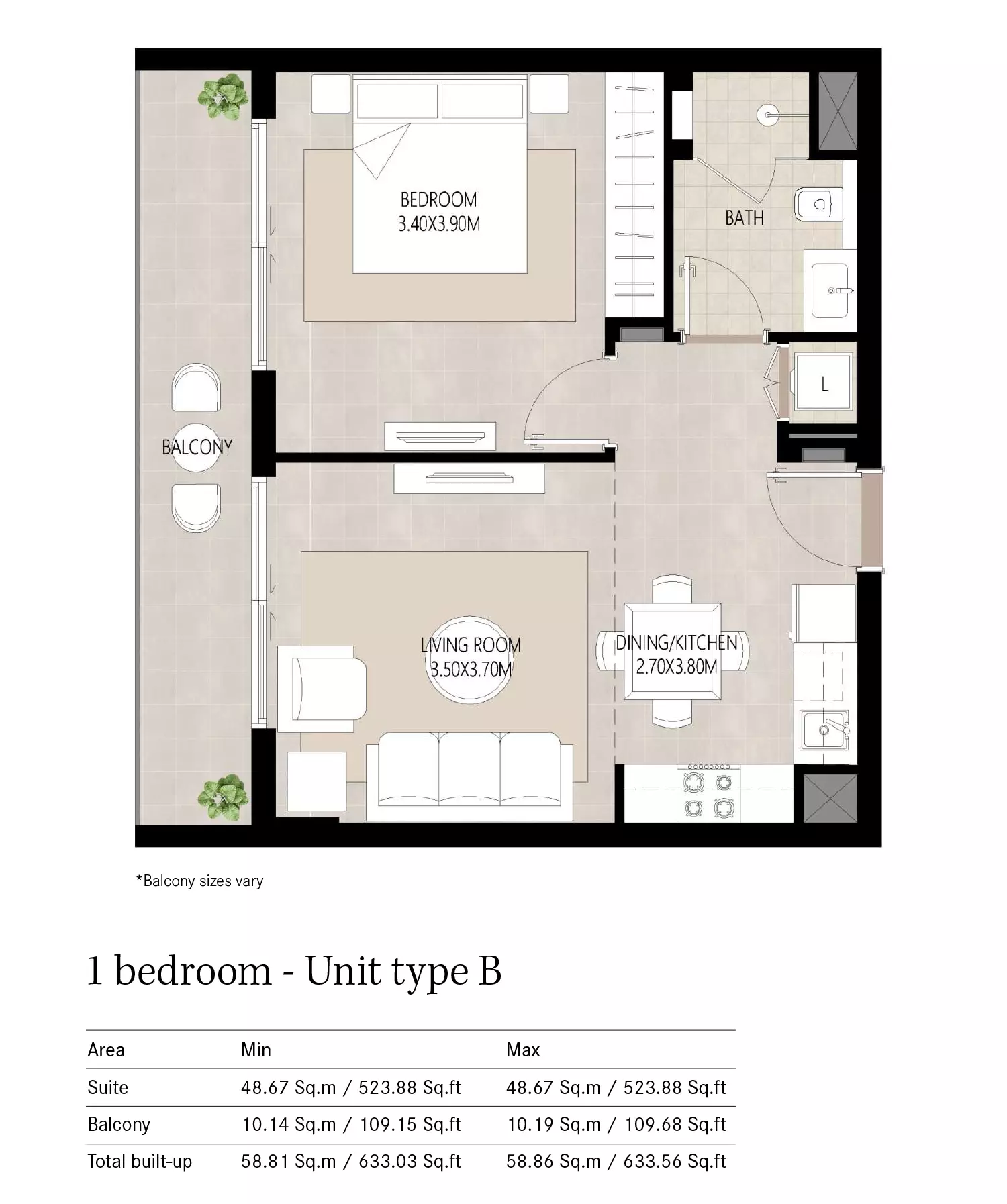 Berkshire Park offers a range of apartment options to cater to different needs: 1-bedroom apartments, starting from 926K AED, with sizes ranging from 633 to 665 sqft. 2-bedroom apartments, starting from 1.3M AED, with sizes between 951 and 1009 sqft. 3-bedroom apartments, starting from 2.5M AED, ranging from 1472 to 2187 sqft. These apartments are ideal for individuals, couples, or families looking for well-designed living spaces. Whether you're seeking a compact 1-bedroom or a spacious 3-bedroom unit, Berkshire Park provides a variety of sizes and options to suit different lifestyles.