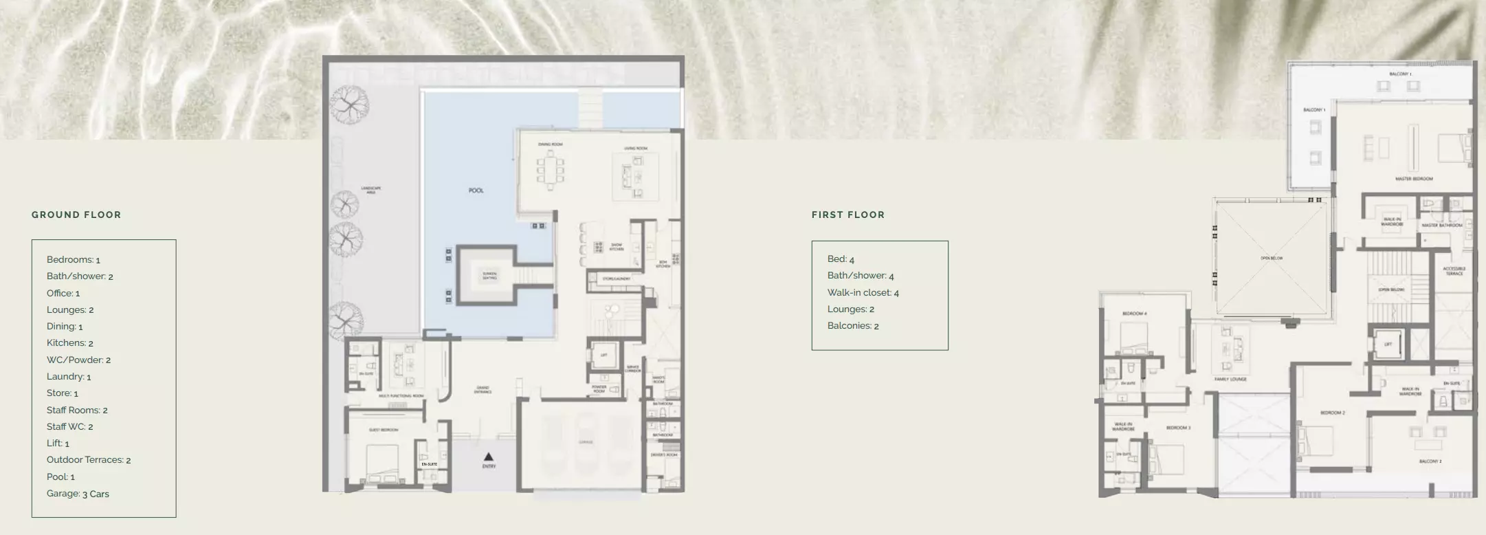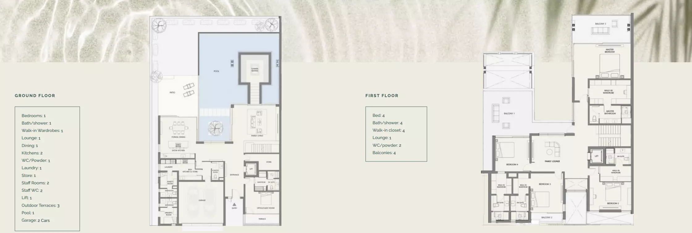 • 5-Bedroom Villas: Size: 6,670 to 8,820 sqft, Design Elements: Features spacious living areas, sunken lounges, expansive verandas, and integrated pools that seamlessly merge indoor and outdoor spaces.