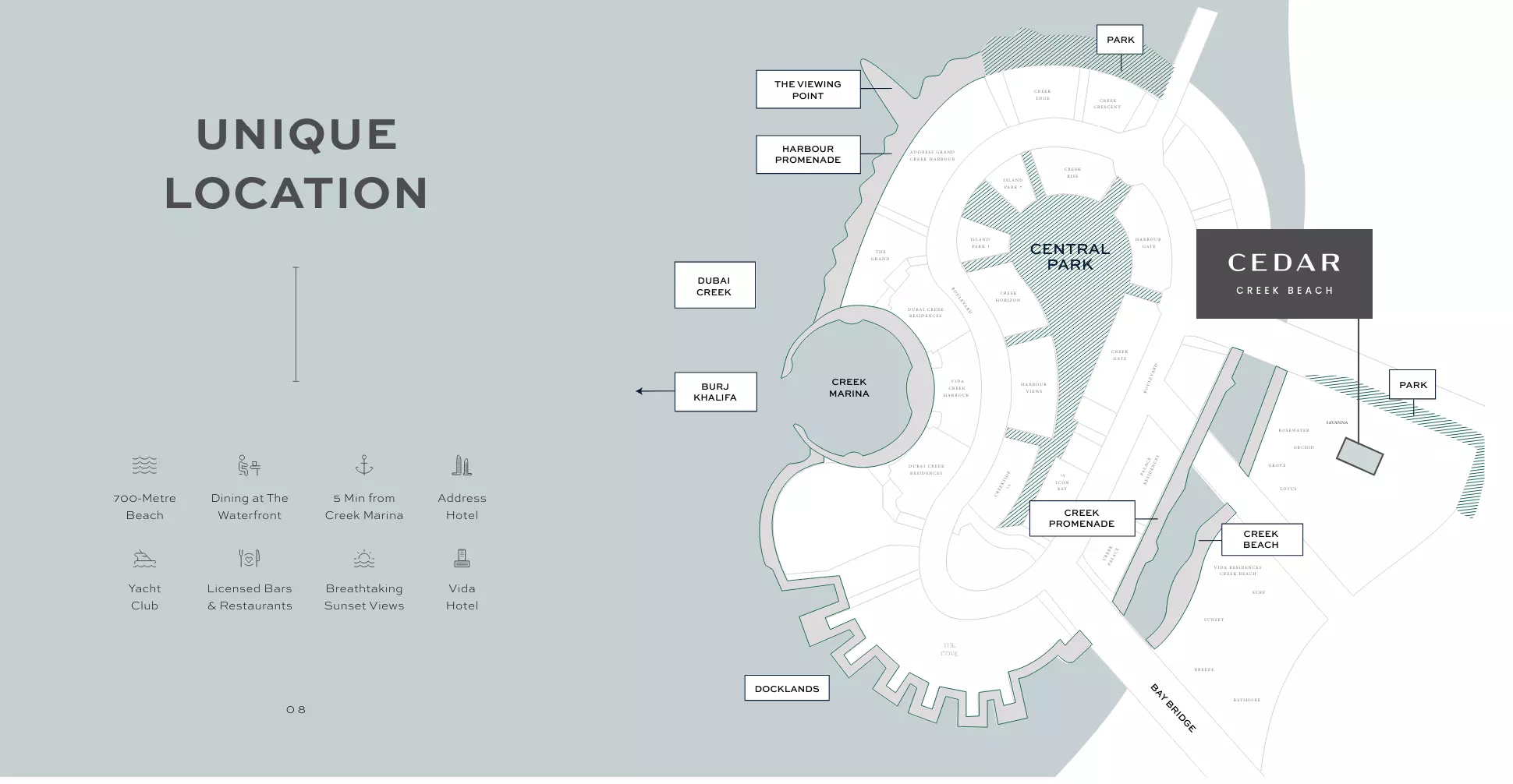 Cedar Creek Beach by Emaar Properties is a prime investment opportunity due to its exceptional location in Dubai Creek Harbour. With stunning views of the Dubai skyline and a vibrant, pedestrian-friendly community, it offers a perfect blend of natural beauty and urban convenience. The area boasts cafes, restaurants, and retail outlets, enhancing the lifestyle of residents. The development is thoughtfully designed to offer modern luxury living, making it ideal for those seeking a refined lifestyle. Given its prestigious developer, strategic location, and comprehensive residential offerings, Cedar Creek Beach represents a valuable investment in Dubai’s thriving real estate market.