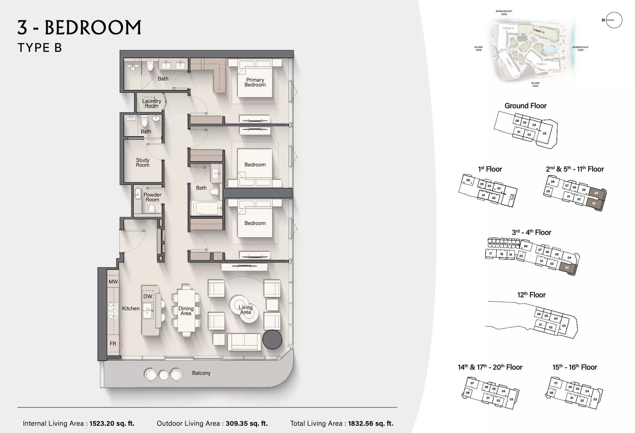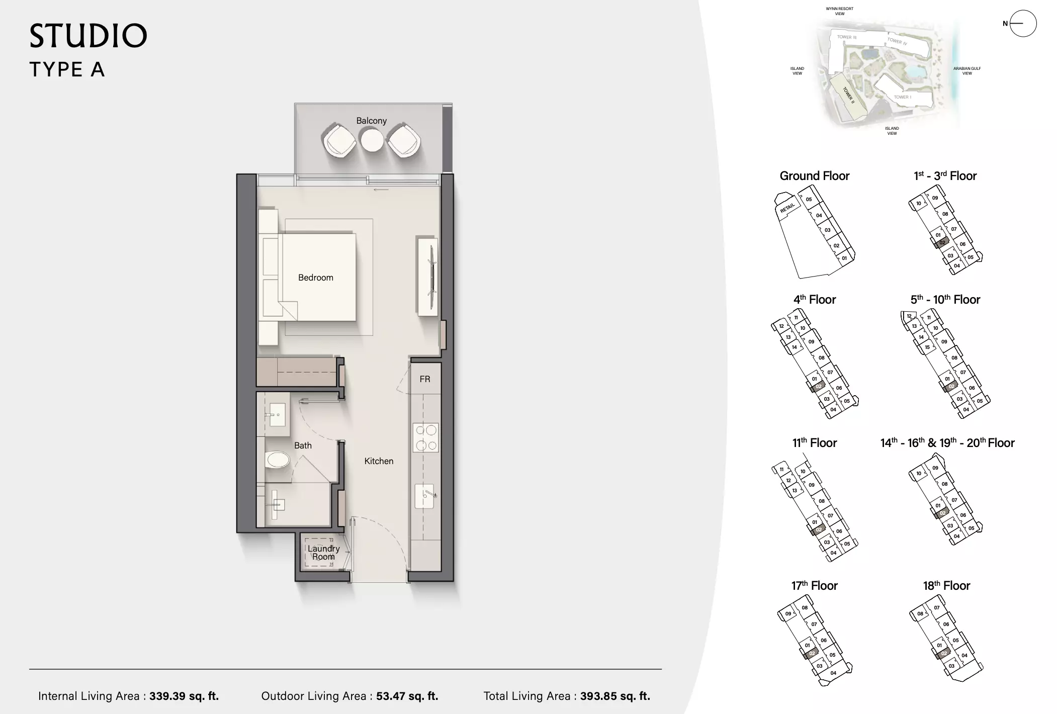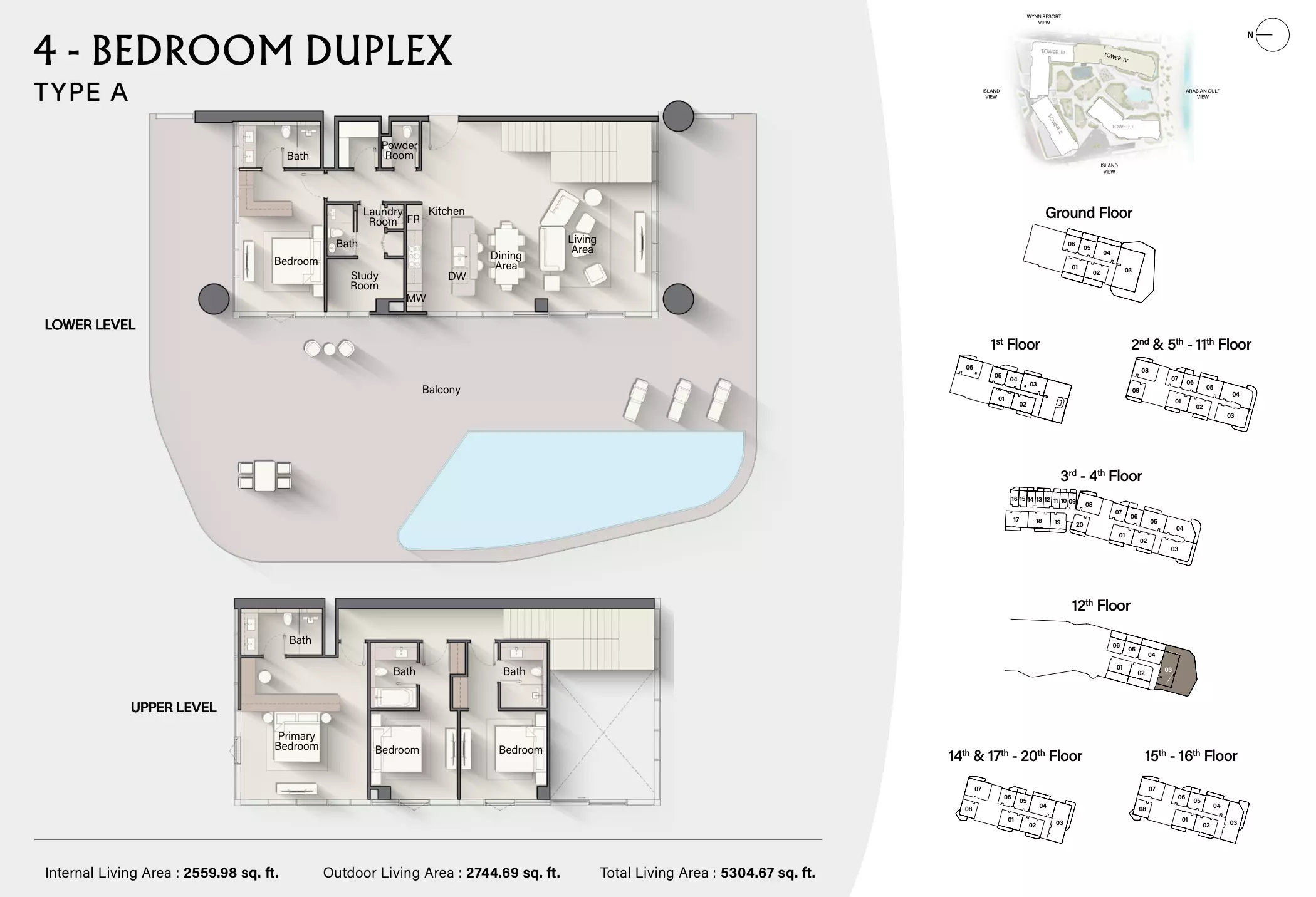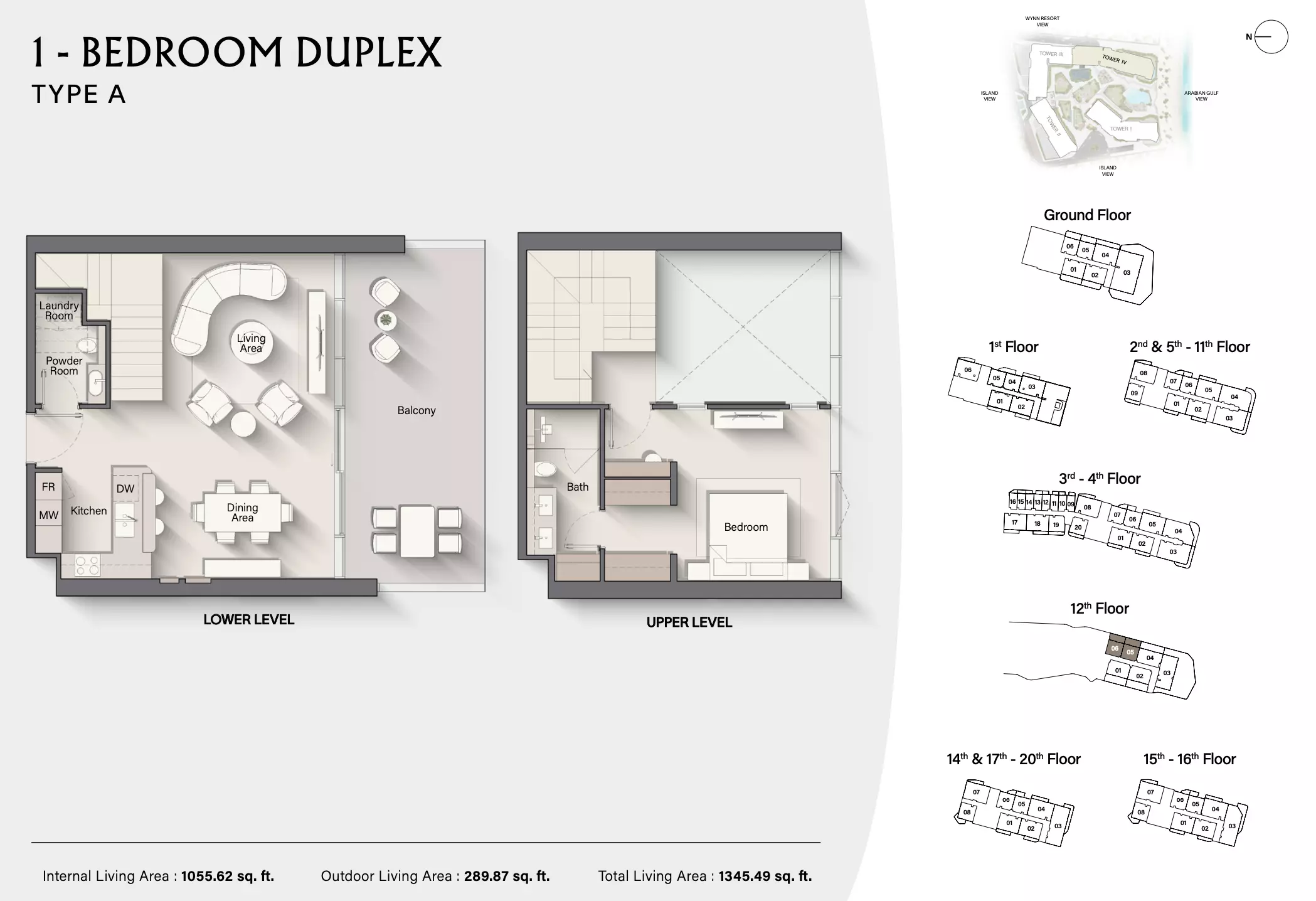 • Apartment Studio Apartments: from 385 sq ft to 606 sq ft 1-Bedroom Apartments: from 840 sq ft to 951 sq ft with starting price 2.8M AED 2-Bedroom Apartments: from 1,096 sq ft to 1,530 sq ft with starting price 3.4M AED 3-Bedroom Apartments: from 1.697 sq ft to 1982 sq ft • Duplex 1-bedroom Duplex: from 1,321 sq ft to 1,345 sq ft 2-Bedroom Duplex: from 2,025 to 2,149 sq ft 3-Bedroom Duplex: 5,471 sq ft 4-Bedroom Duplex: 5,471 sq ft • Penthouses 6 bedroom penthouses : 13,759 sq ft • Villas 5 bedroom villas : from 7,735 sq ft to 7,738