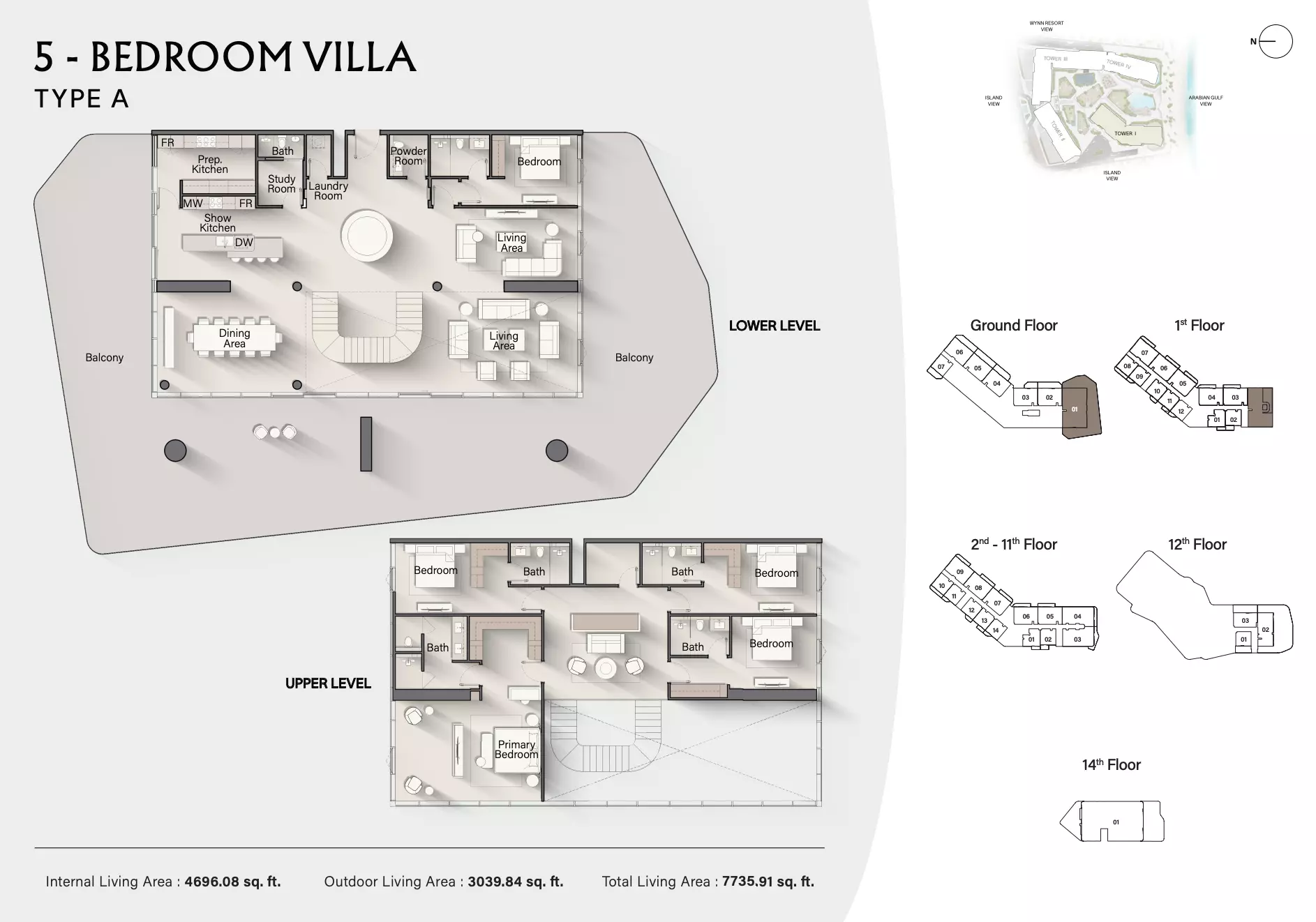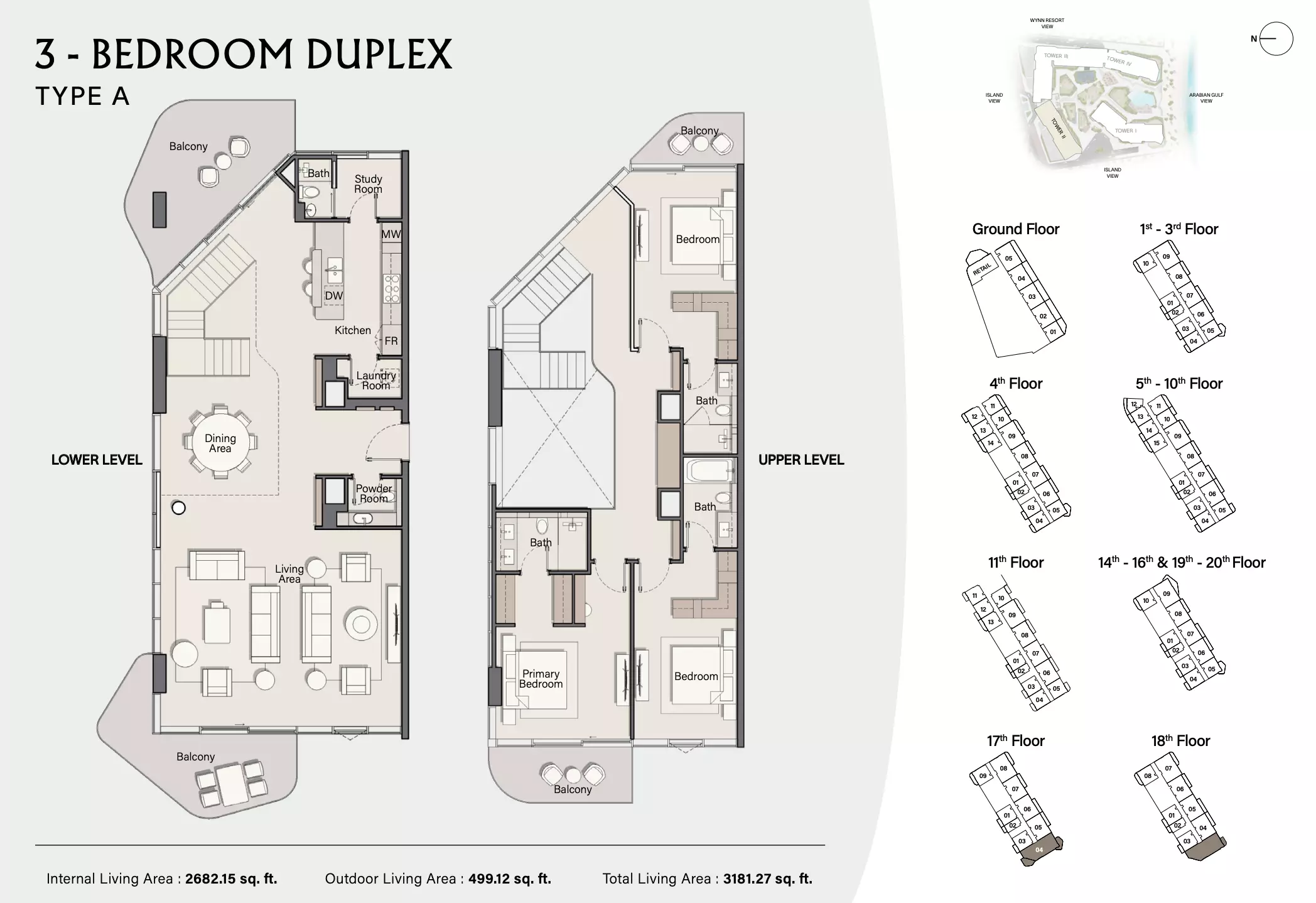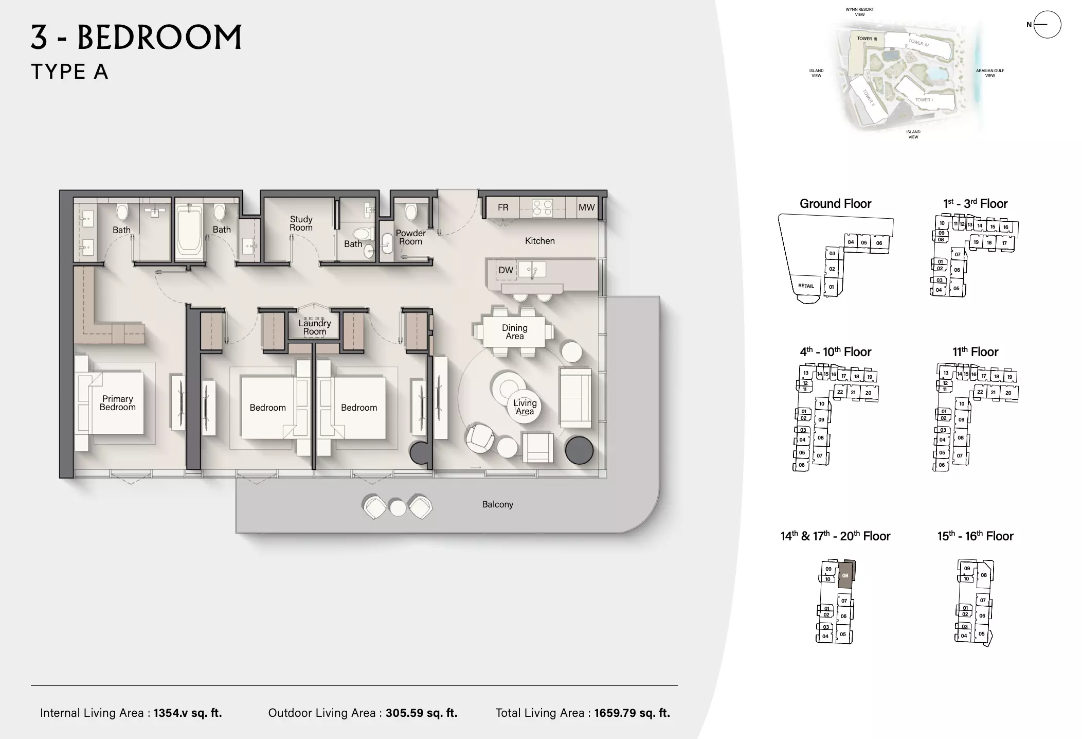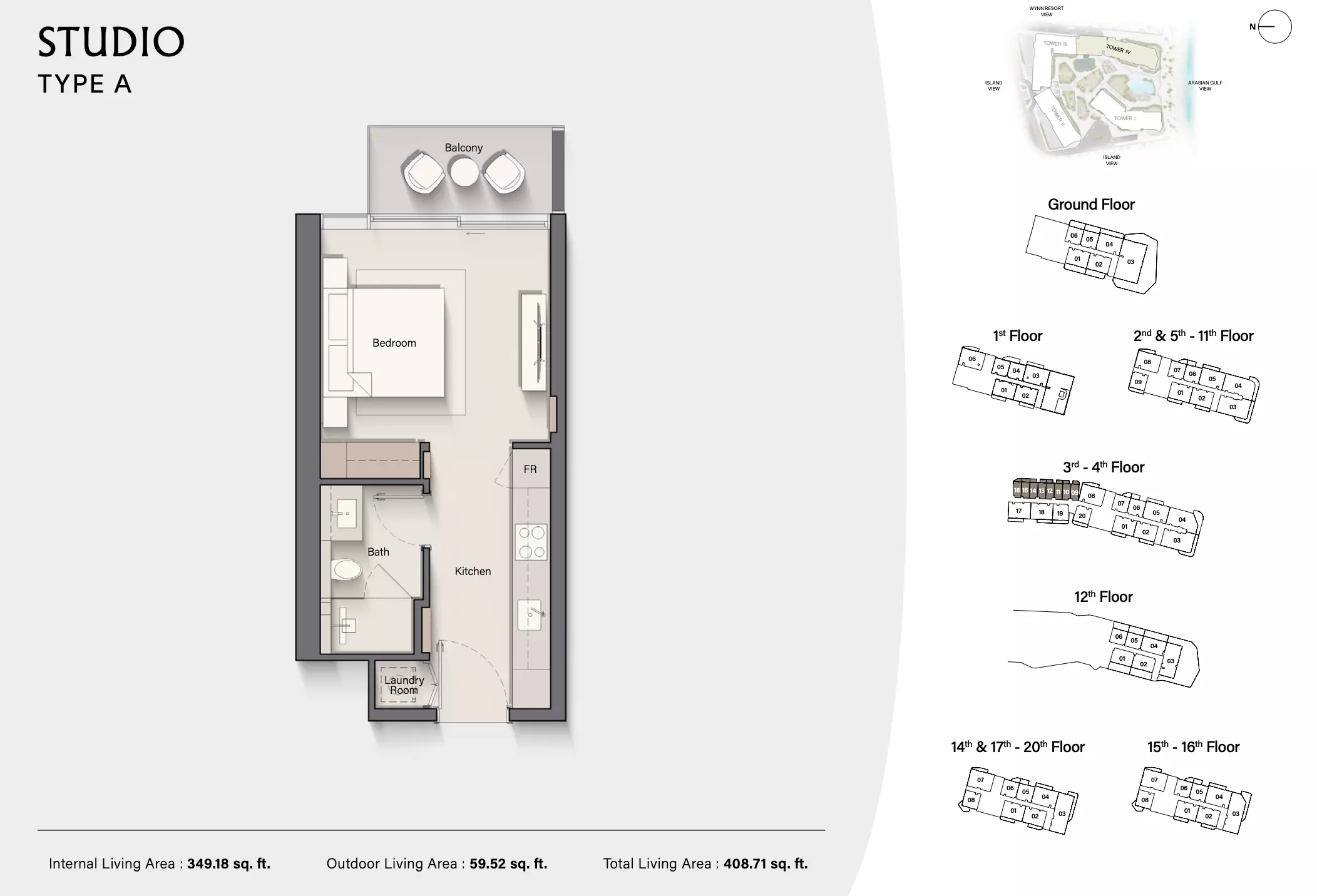 • Apartment Studio Apartments: from 385 sq ft to 606 sq ft 1-Bedroom Apartments: from 840 sq ft to 951 sq ft with starting price 2.8M AED 2-Bedroom Apartments: from 1,096 sq ft to 1,530 sq ft with starting price 3.4M AED 3-Bedroom Apartments: from 1.697 sq ft to 1982 sq ft • Duplex 1-bedroom Duplex: from 1,321 sq ft to 1,345 sq ft 2-Bedroom Duplex: from 2,025 to 2,149 sq ft 3-Bedroom Duplex: 5,471 sq ft 4-Bedroom Duplex: 5,471 sq ft • Penthouses 6 bedroom penthouses : 13,759 sq ft • Villas 5 bedroom villas : from 7,735 sq ft to 7,738
