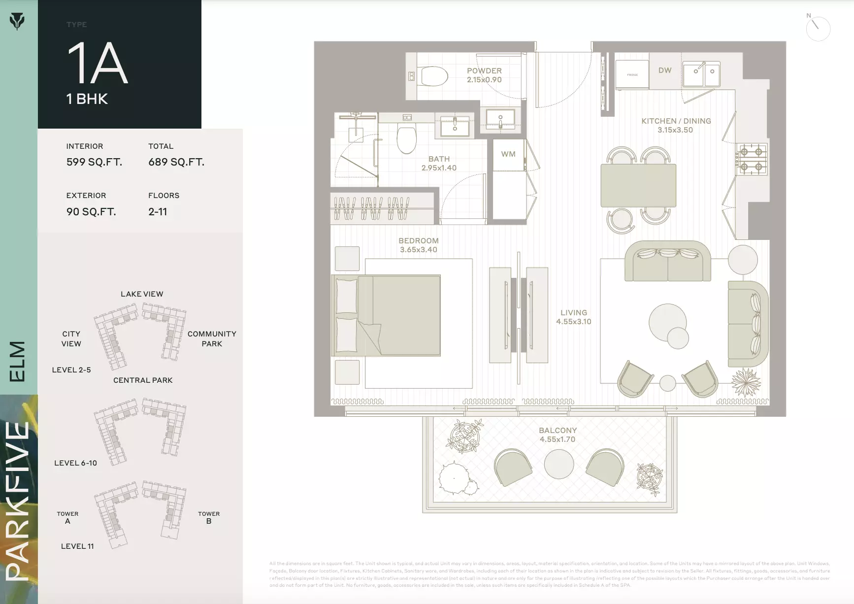 The payment plan for Park Five by Deyaar is as follows: 10%: Down payment at sales launch 40%: During construction 50%: On handover This payment structure is based on the key phases of the project's development.