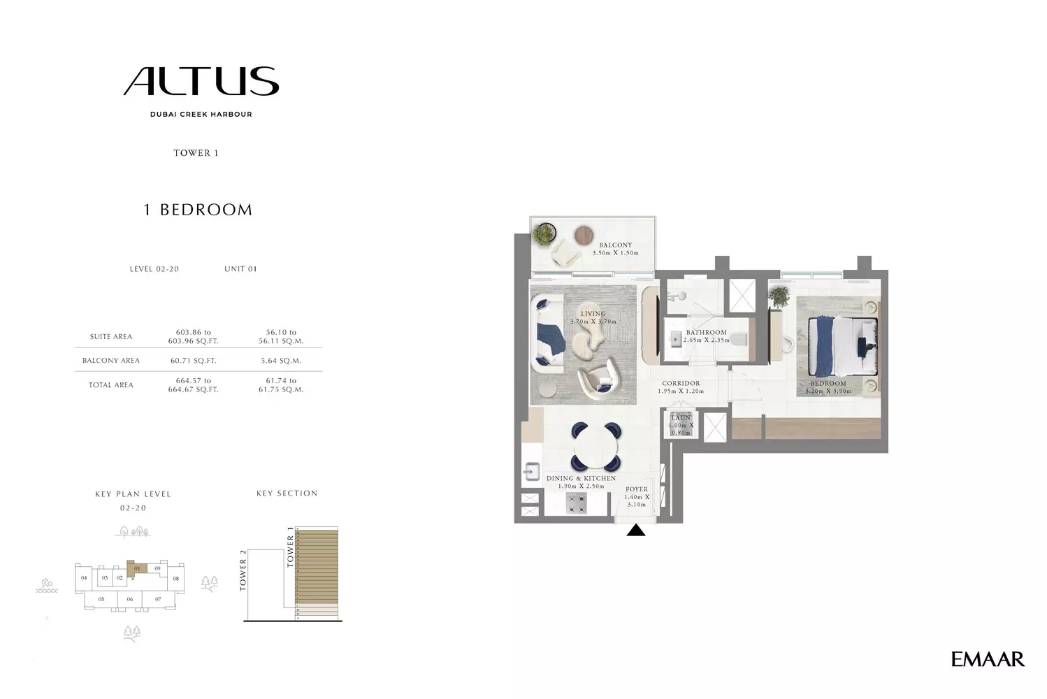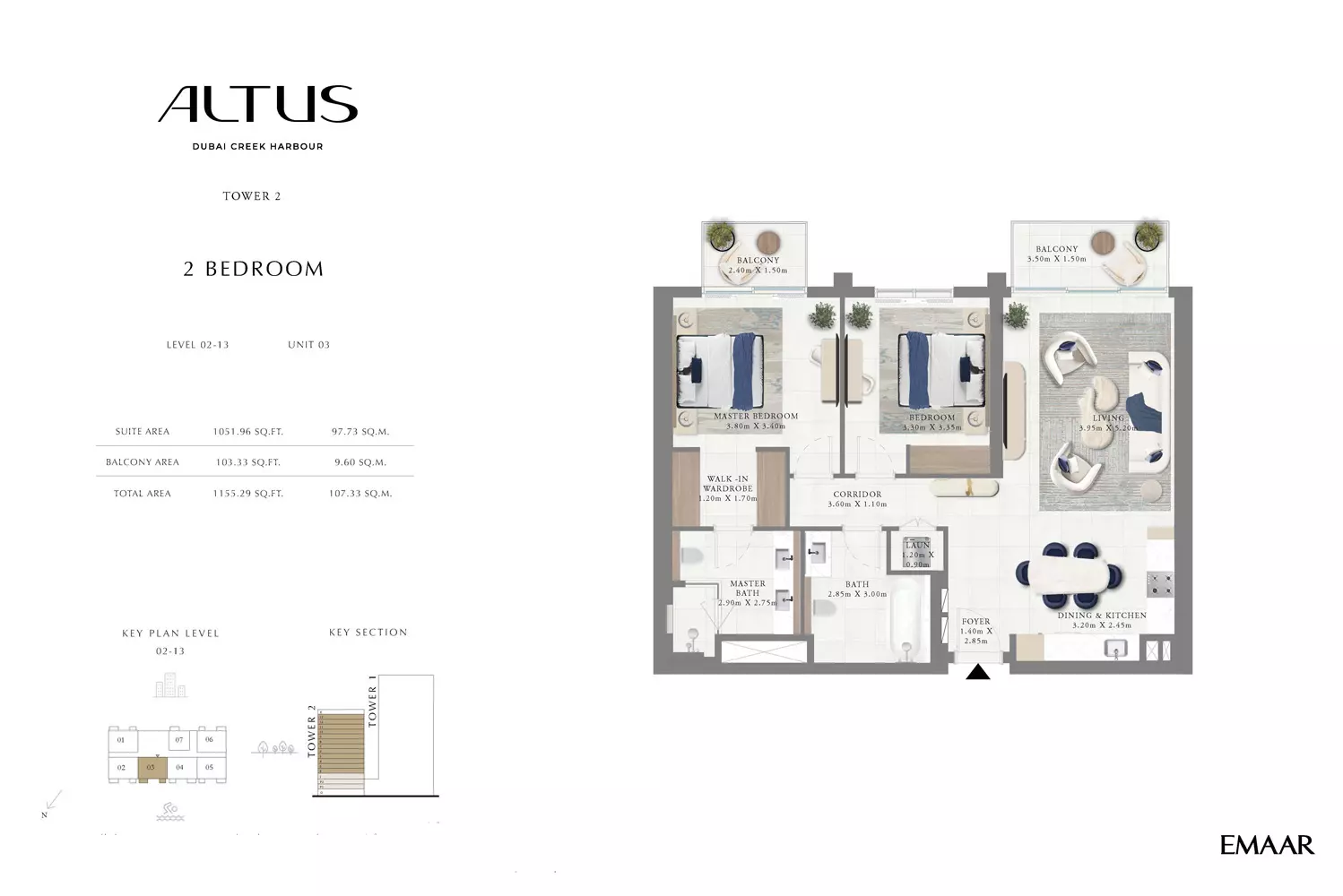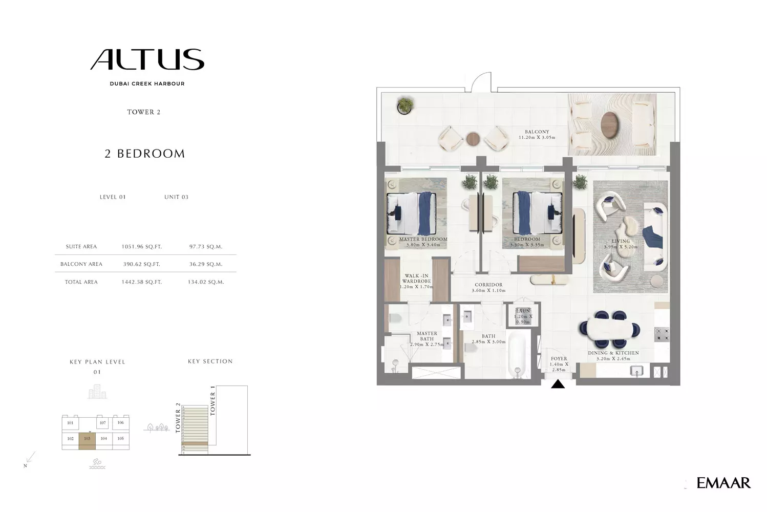 Emaar Altus offers a variety of apartment options in Tower 1: 1 Bed apartments, ranging from 664 to 822 sqft. 2 Beds apartments, with sizes from 1163 to 1408 sqft. 3 Beds apartments, spanning from 1596 to 1927 sqft. Tower 2 offers modern apartment options with spacious layouts: 1 Bed apartments, with a size of 765 sqft. 2 Beds apartments, ranging from 1138 to 1453 sqft. These apartments are designed to provide a luxurious living experience, featuring contemporary finishes and ample space. Tower 2's strategic location in Dubai Creek Harbour offers residents stunning views and access to world-class amenities, making it an ideal choice for those seeking a blend of comfort and style in a prime location. Prices may vary depending on unit size and availability.