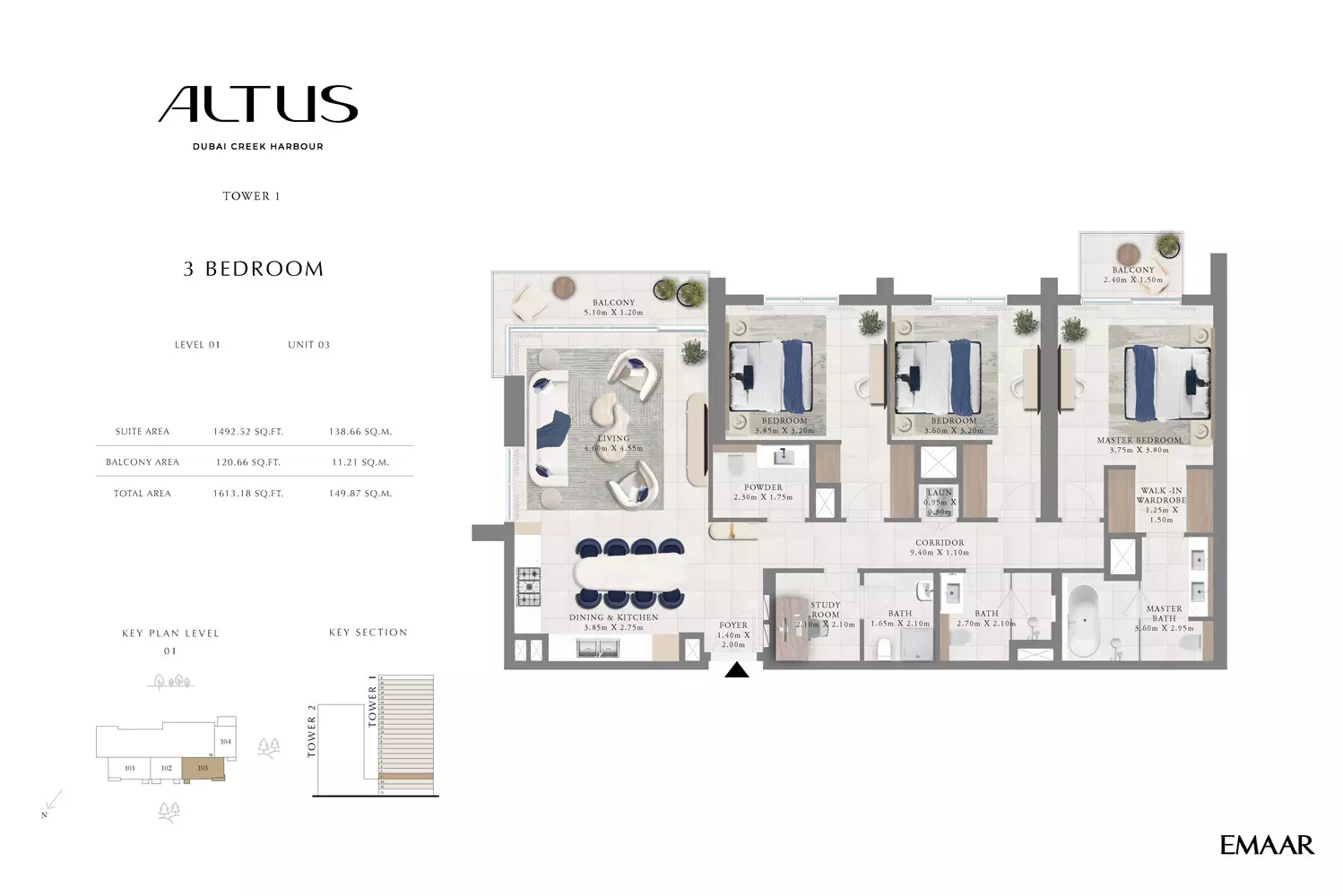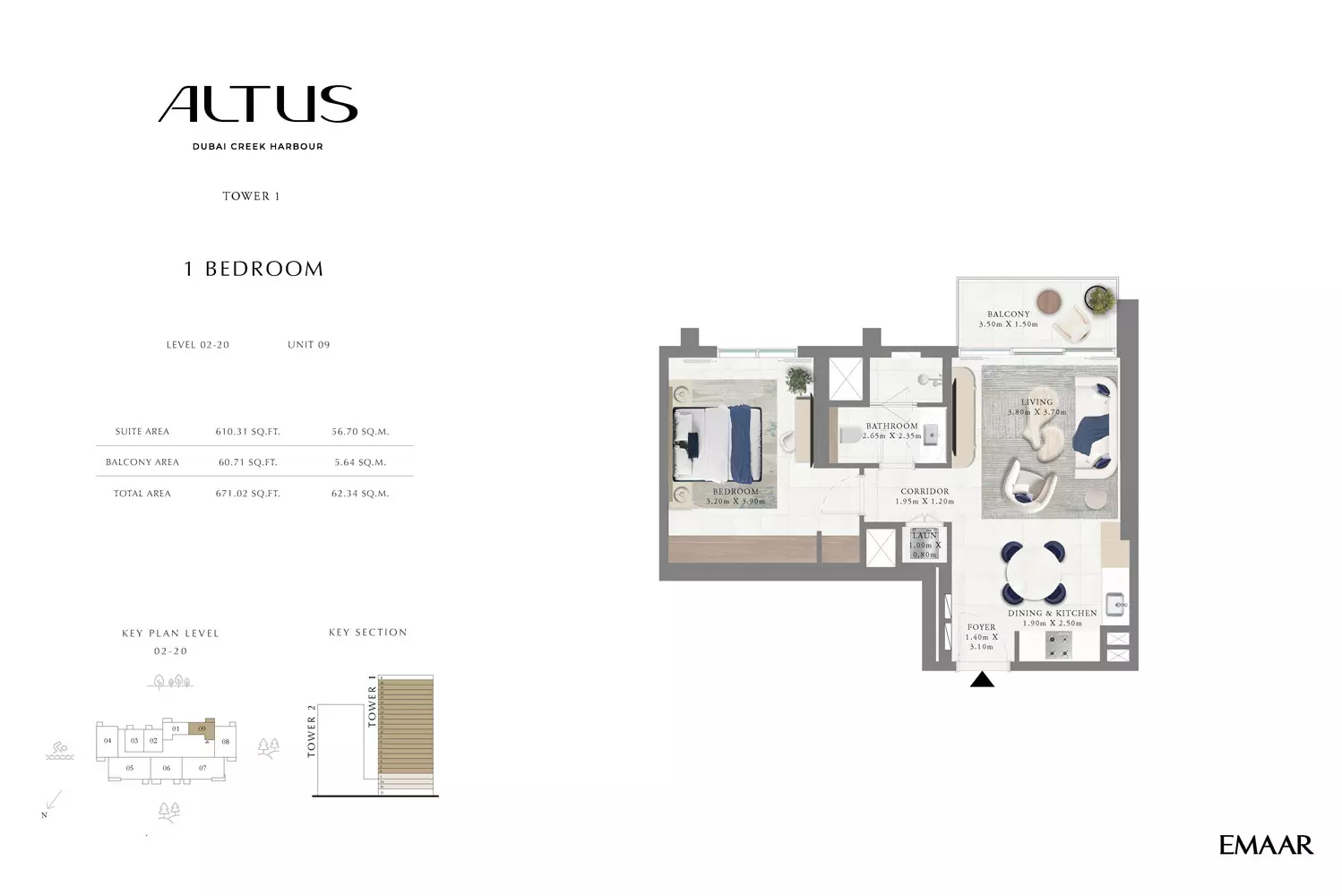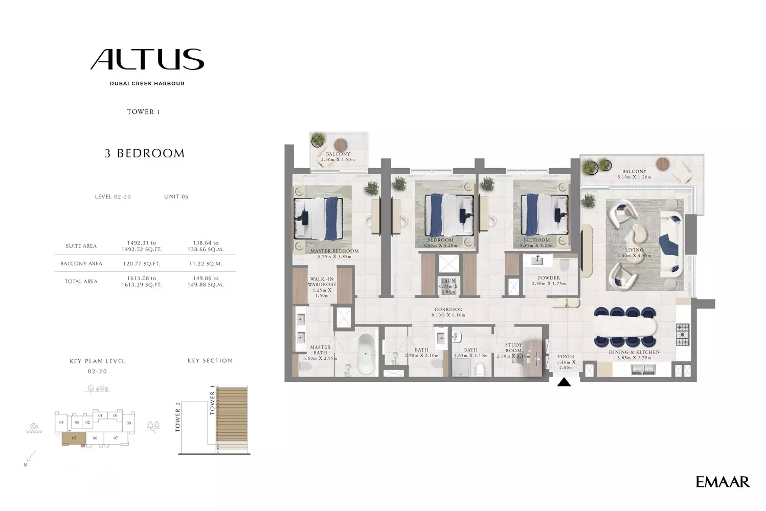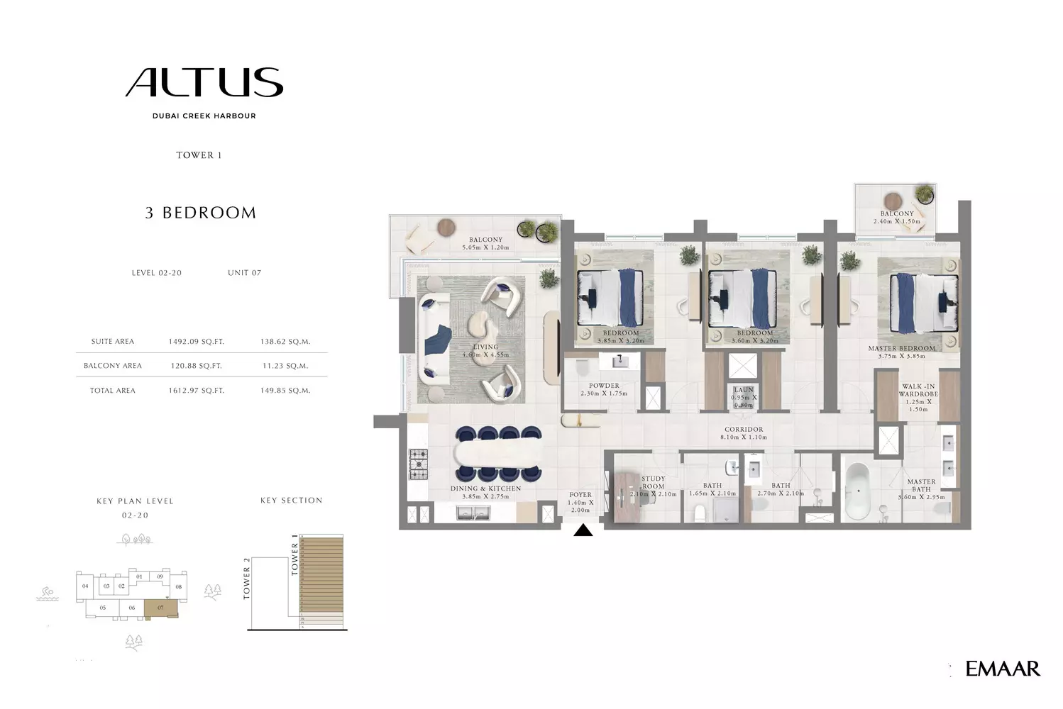 Emaar Altus offers a variety of apartment options in Tower 1: 1 Bed apartments, ranging from 664 to 822 sqft. 2 Beds apartments, with sizes from 1163 to 1408 sqft. 3 Beds apartments, spanning from 1596 to 1927 sqft. Tower 2 offers modern apartment options with spacious layouts: 1 Bed apartments, with a size of 765 sqft. 2 Beds apartments, ranging from 1138 to 1453 sqft. These apartments are designed to provide a luxurious living experience, featuring contemporary finishes and ample space. Tower 2's strategic location in Dubai Creek Harbour offers residents stunning views and access to world-class amenities, making it an ideal choice for those seeking a blend of comfort and style in a prime location. Prices may vary depending on unit size and availability.