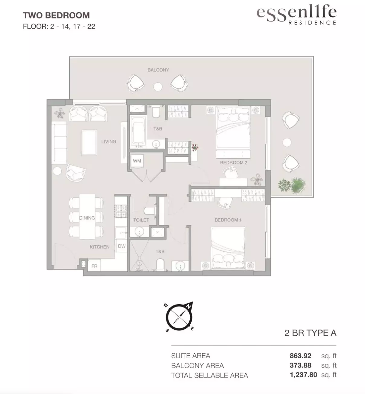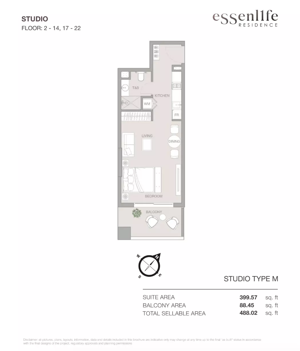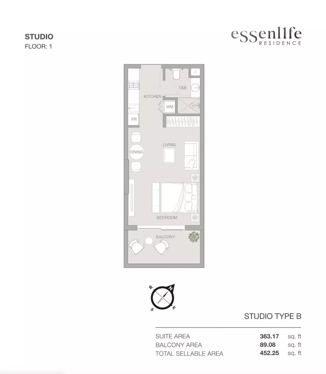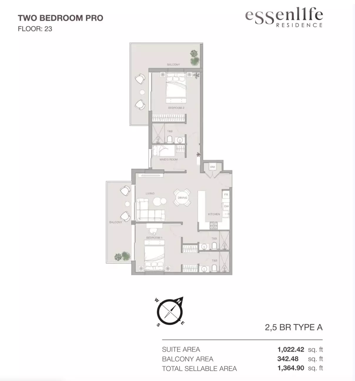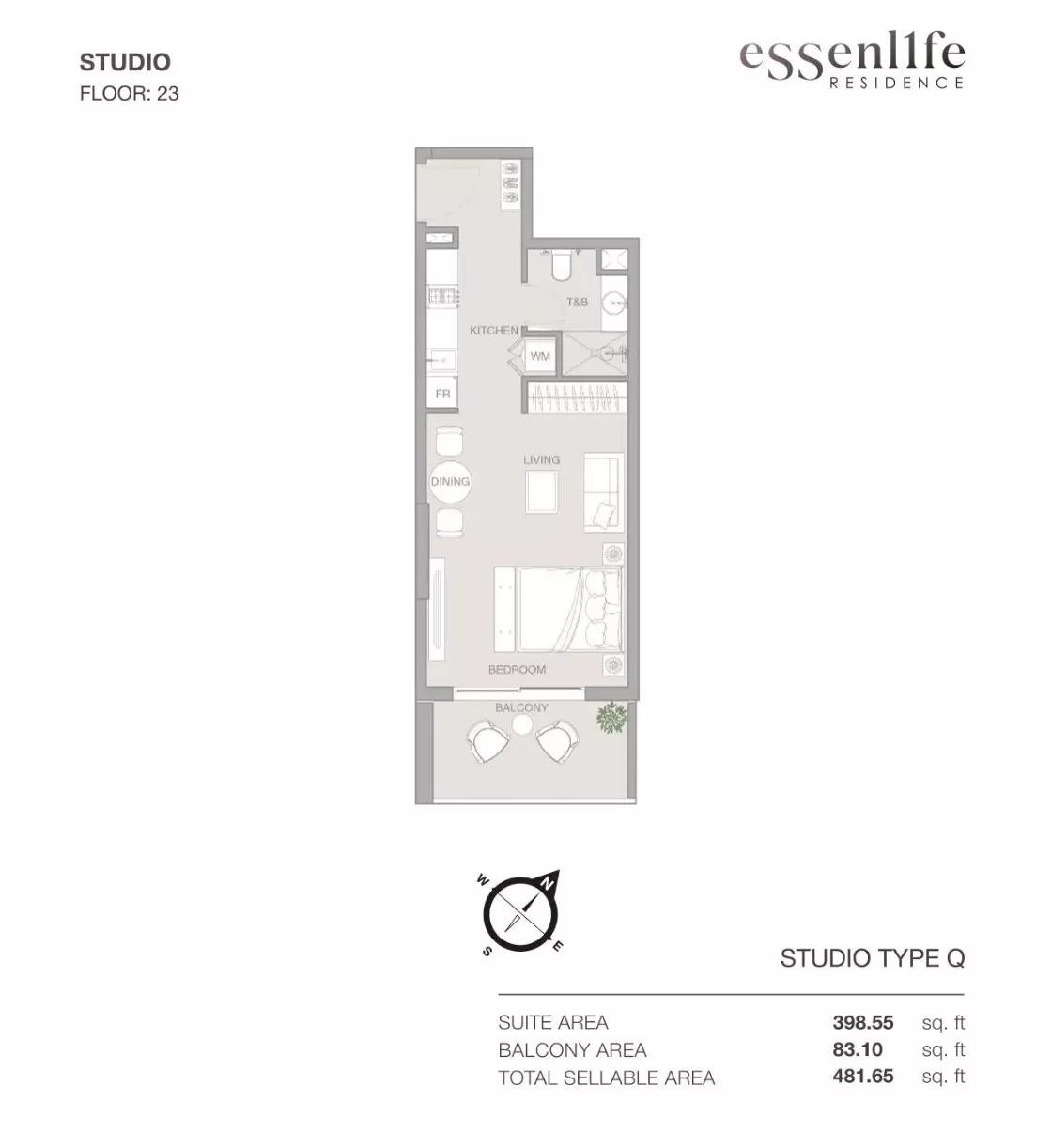 Essenlife offers a variety of thoughtfully designed apartments to suit different needs and lifestyles. The available unit types range from studio apartments to spacious four-bedroom homes. Studio apartments start at 752,000 AED and offer sizes between 435 to 488 sq ft, ideal for individuals or young professionals seeking efficient living spaces. One-bedroom units are priced from 1.2 million AED, with areas ranging from 793 to 1,540 sq ft, offering more room for comfort and functionality. Two-bedroom apartments are also available from 1.2 million AED, sized between 800 and 1,255 sq ft, suitable for small families or couples. Three-bedroom units are priced from 2 million AED and have a uniform size of 1,364 sq ft, providing balanced space and privacy. For larger households, four-bedroom apartments start at 2.3 million AED, with sizes ranging from 1,525 to 1,762 sq ft, offering ample space for family living. Each unit combines modern design with efficient layouts, catering to diverse buyer preferences.