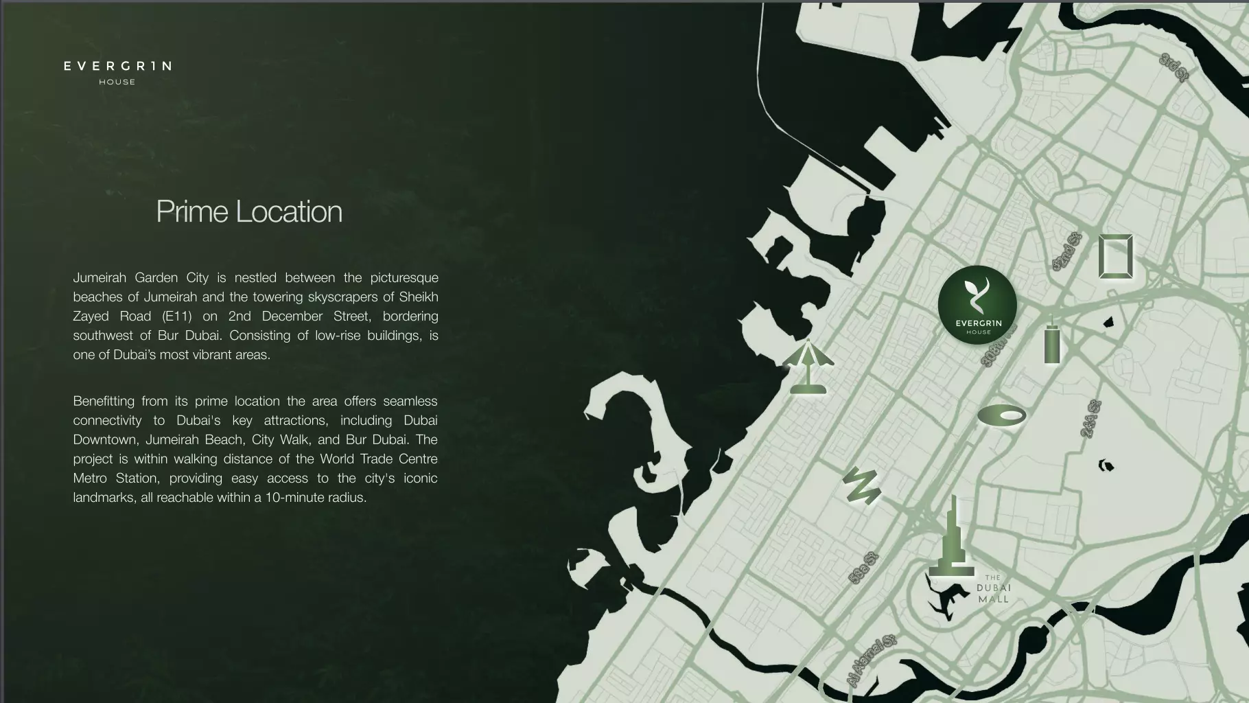 Evergr1n House is located in Dubai, Al Satwa, Jumeirah Garden City, offering a prime address with excellent connectivity.