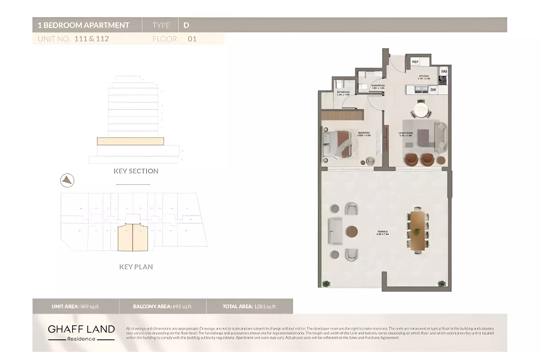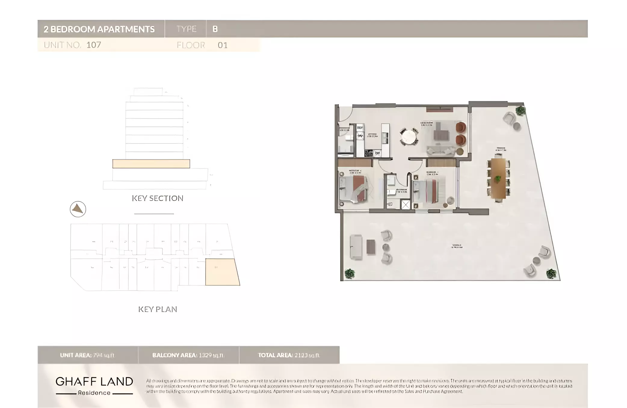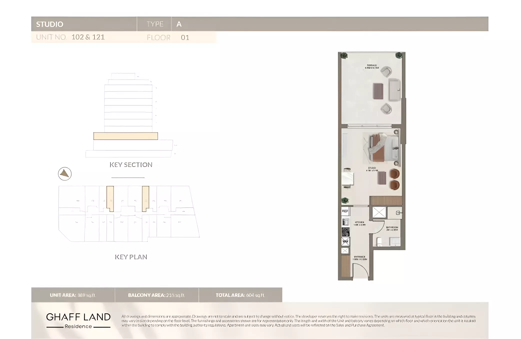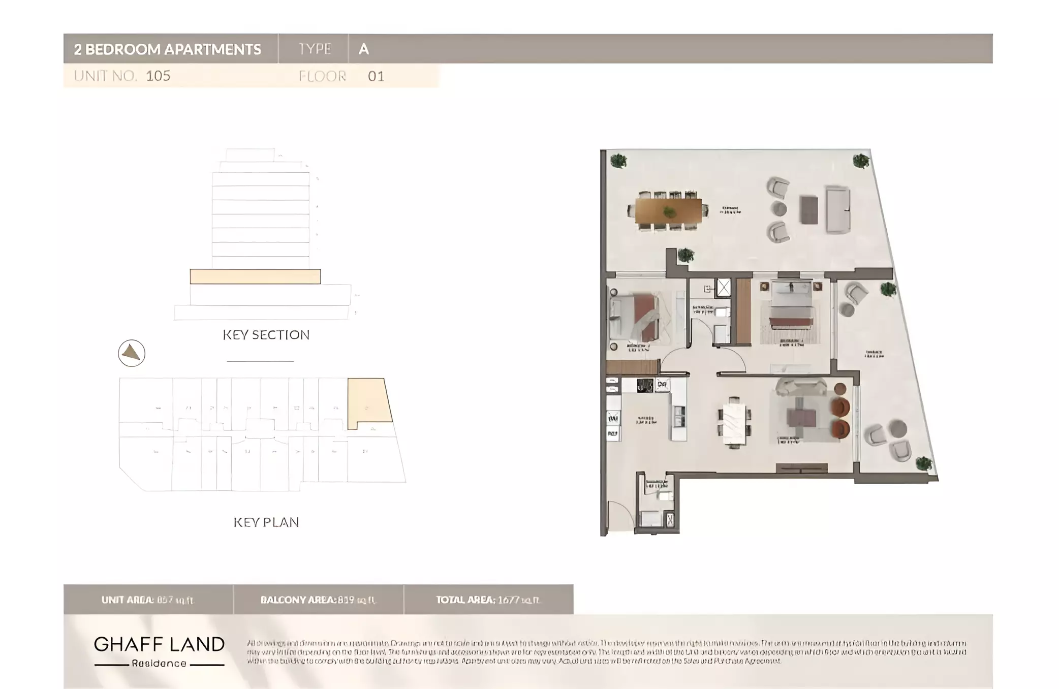 Ghaff Land Residence offers a range of housing options, primarily apartments and duplex units: Studio apartments starting from 590K AED, with sizes ranging from 604 sqft. 1 Bedroom apartments from 890K AED, with sizes between 1114 - 1361 sqft. 2 Bedroom apartments starting from 1.1M AED, with sizes ranging from 1677 - 2264 sqft. 2 Bedroom duplexes from 2.1M AED, with a size of 2012 sqft. These options cater to different needs, whether you're looking for a compact living space or a more spacious duplex home.
