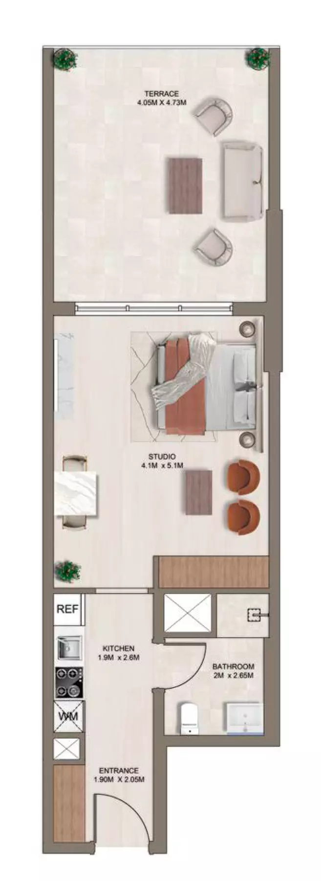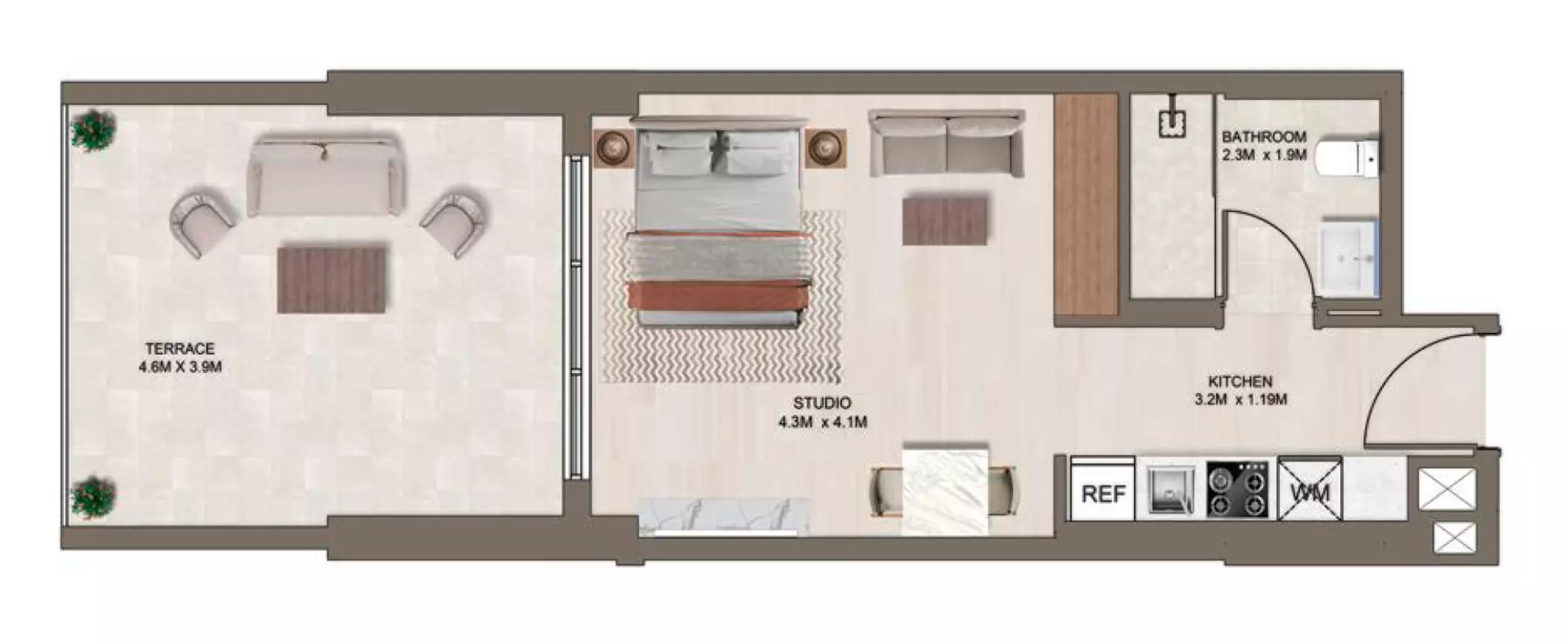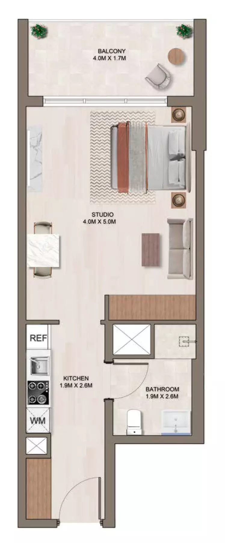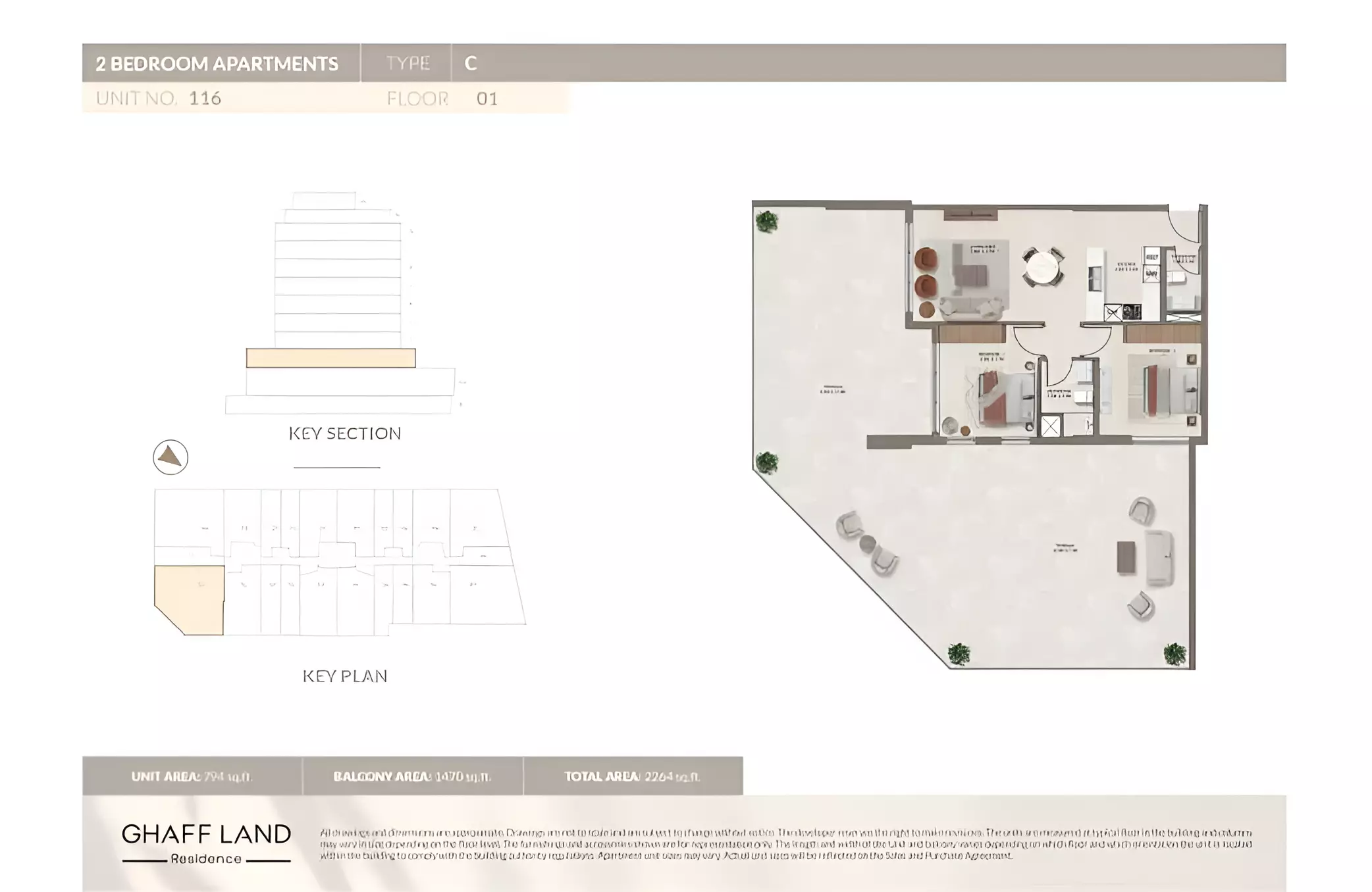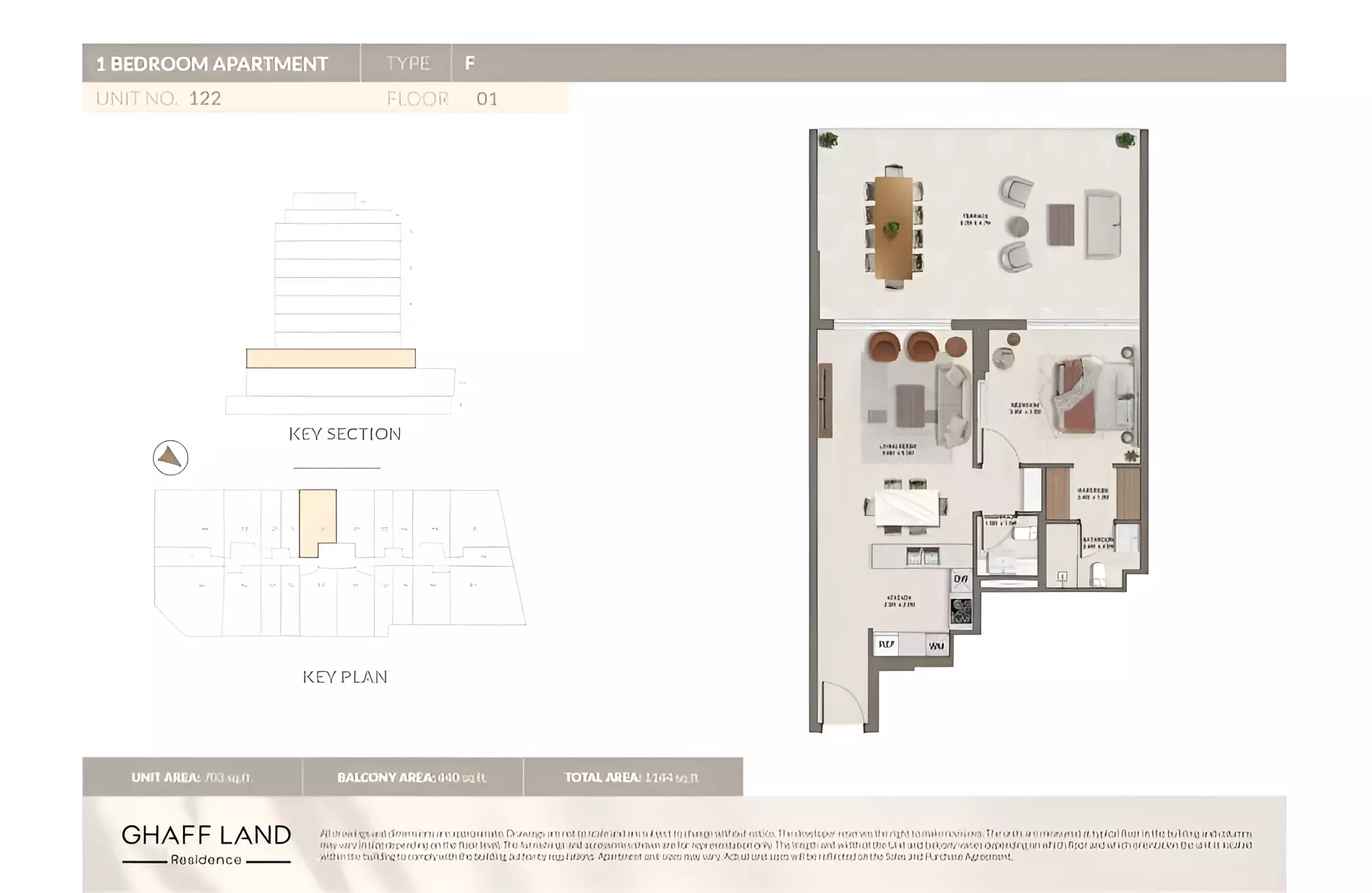Ghaff Land Residence offers a range of housing options, primarily apartments and duplex units: Studio apartments starting from 590K AED, with sizes ranging from 604 sqft. 1 Bedroom apartments from 890K AED, with sizes between 1114 - 1361 sqft. 2 Bedroom apartments starting from 1.1M AED, with sizes ranging from 1677 - 2264 sqft. 2 Bedroom duplexes from 2.1M AED, with a size of 2012 sqft. These options cater to different needs, whether you're looking for a compact living space or a more spacious duplex home.