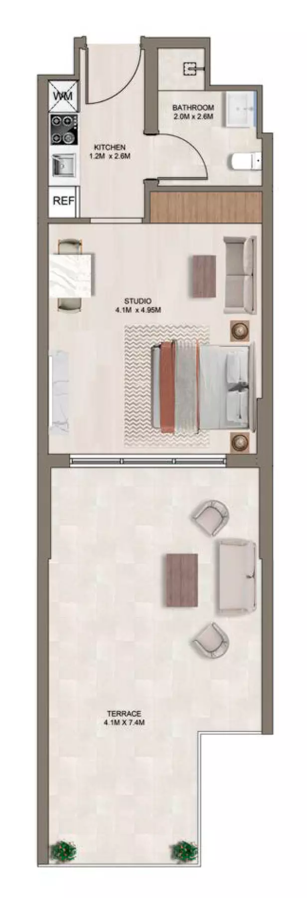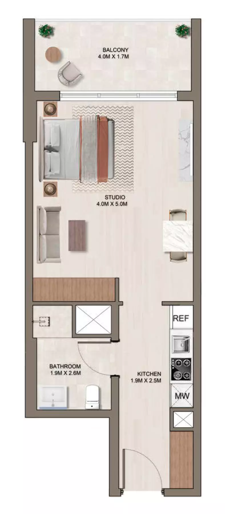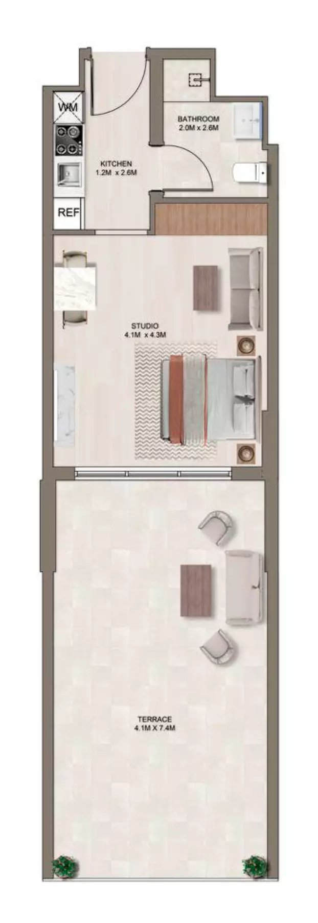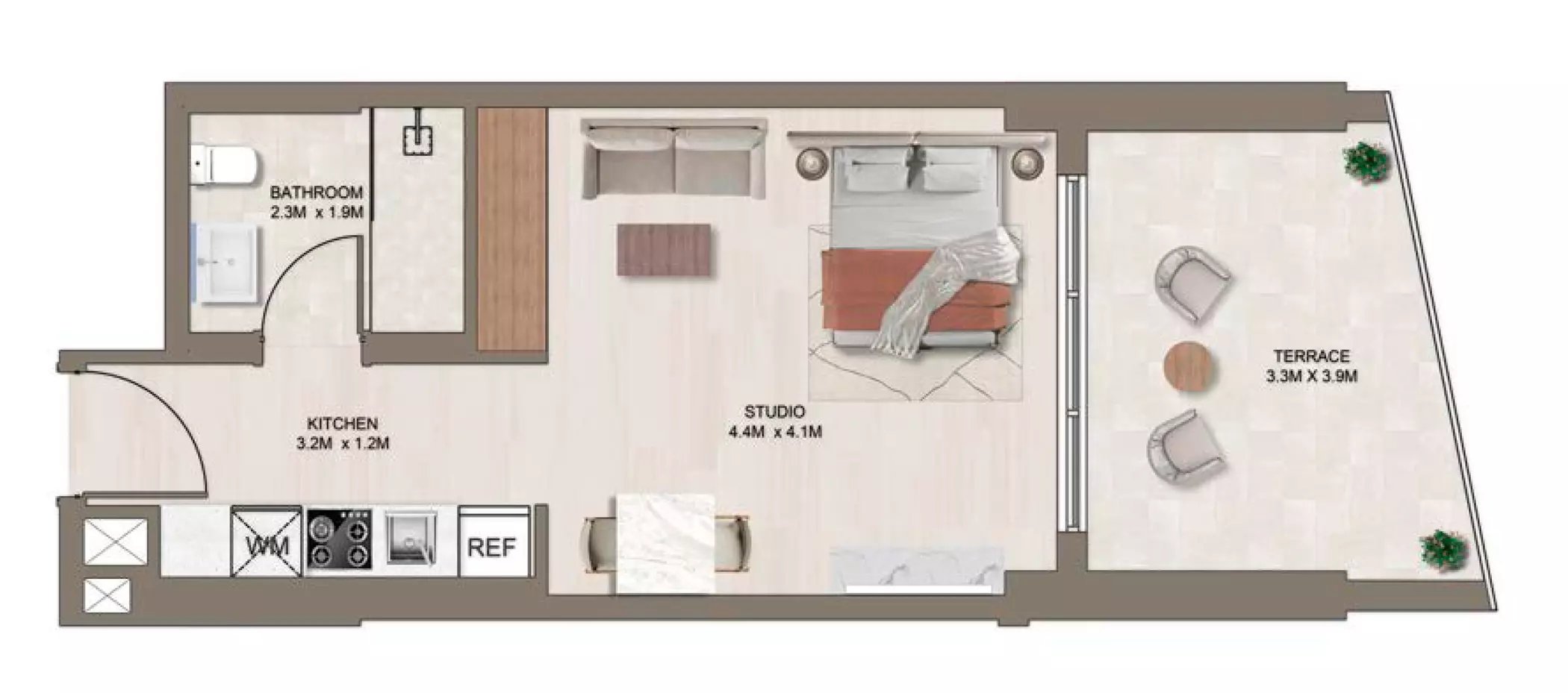 Ghaff Land Residence offers a range of housing options, primarily apartments and duplex units: Studio apartments starting from 590K AED, with sizes ranging from 604 sqft. 1 Bedroom apartments from 890K AED, with sizes between 1114 - 1361 sqft. 2 Bedroom apartments starting from 1.1M AED, with sizes ranging from 1677 - 2264 sqft. 2 Bedroom duplexes from 2.1M AED, with a size of 2012 sqft. These options cater to different needs, whether you're looking for a compact living space or a more spacious duplex home.