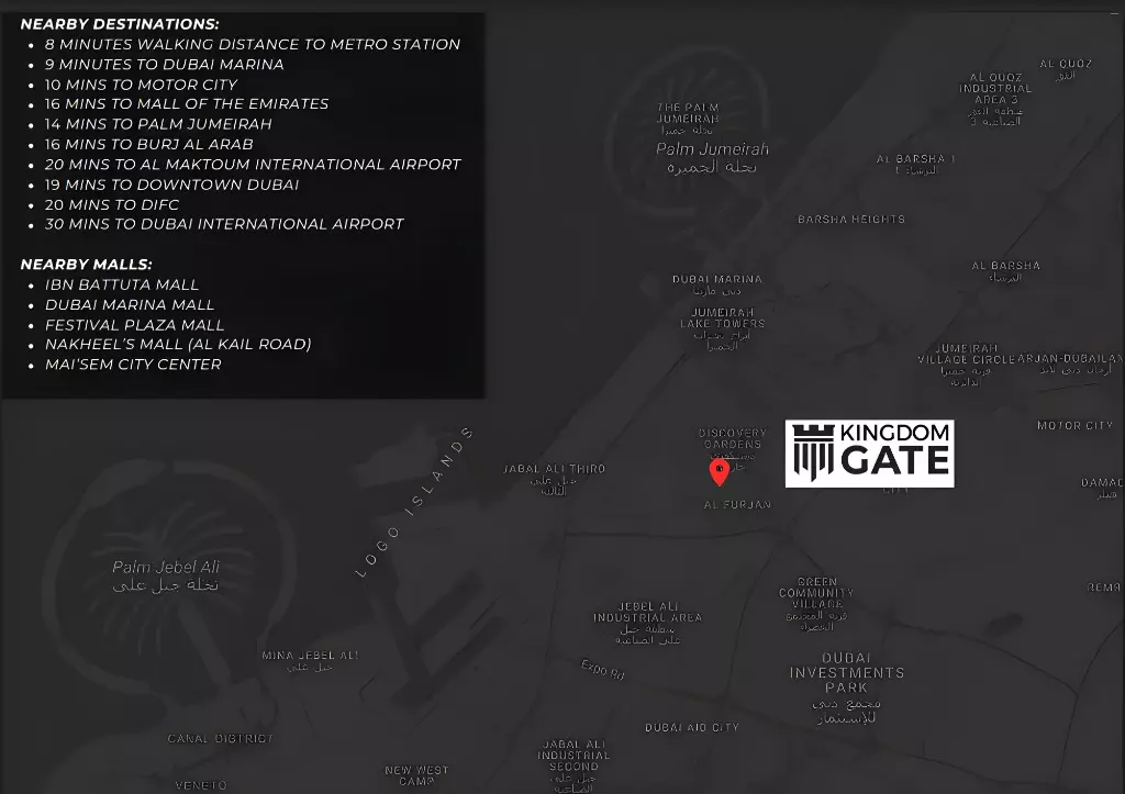 Kingdom Gate is located in Al Furjan, Dubai, a well-connected residential area near major highways and essential city amenities.