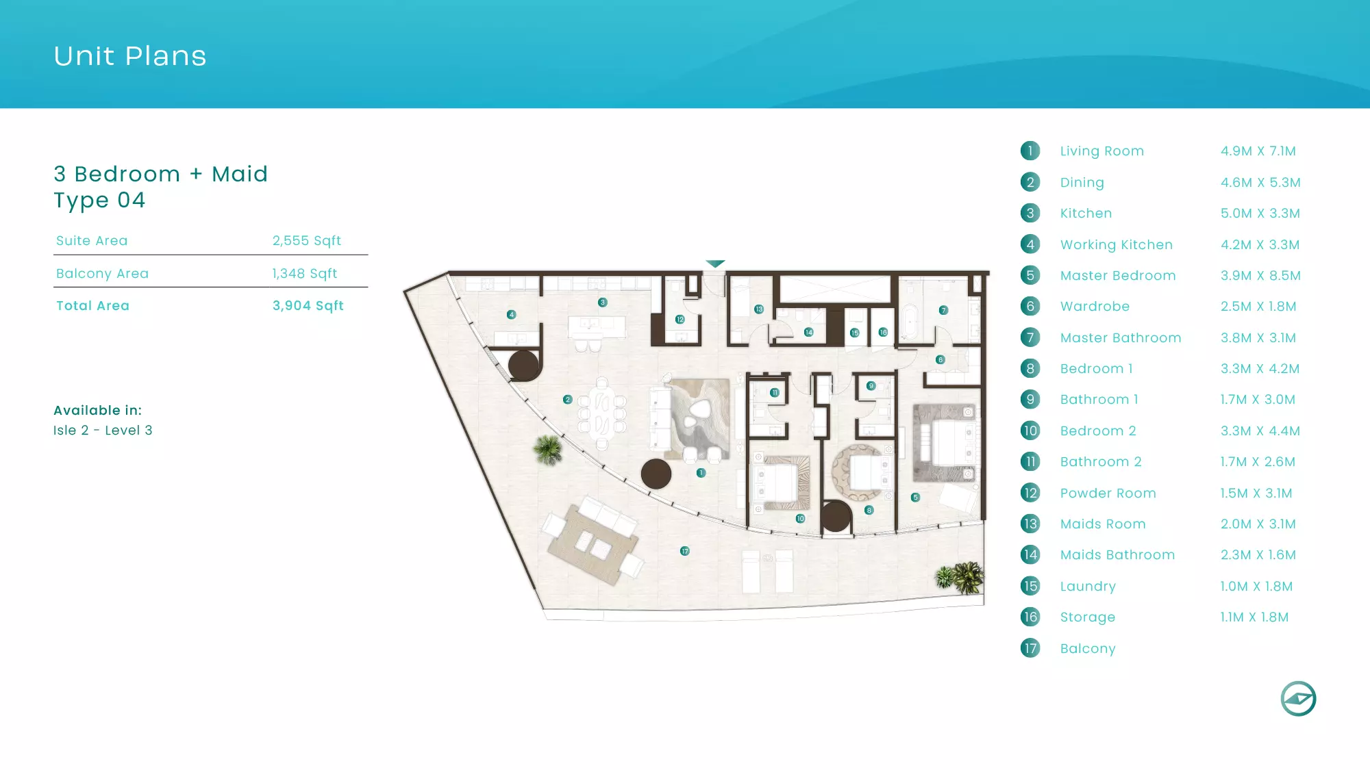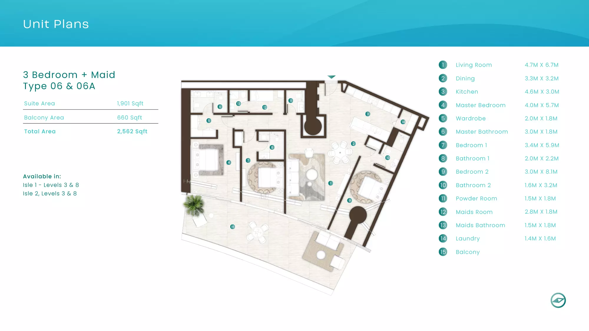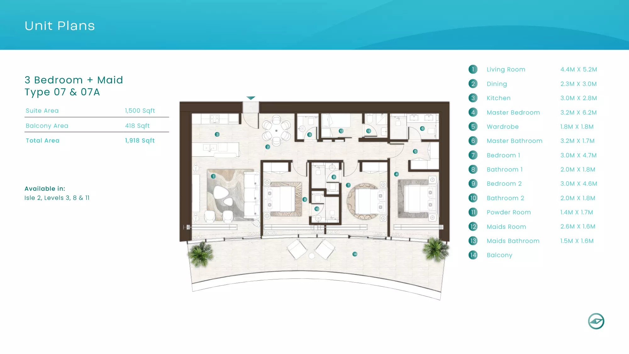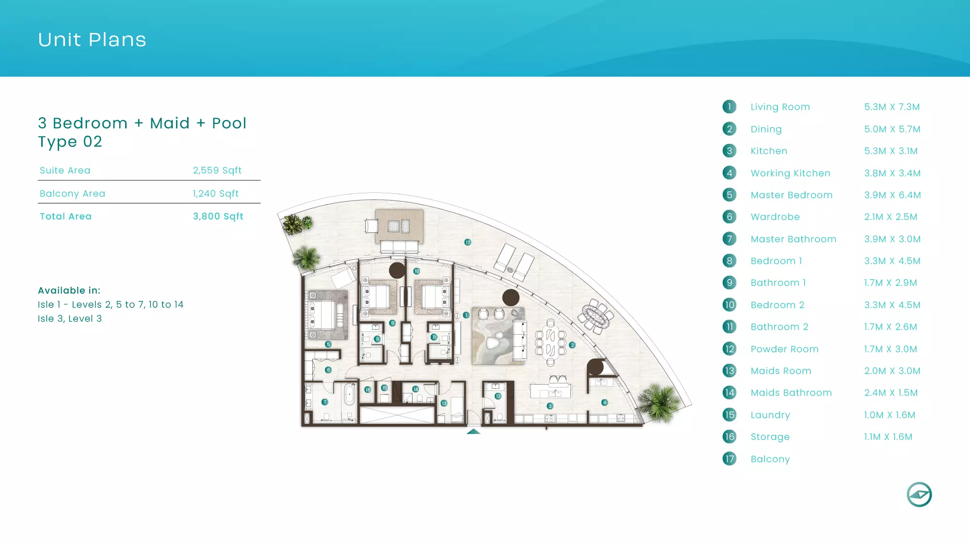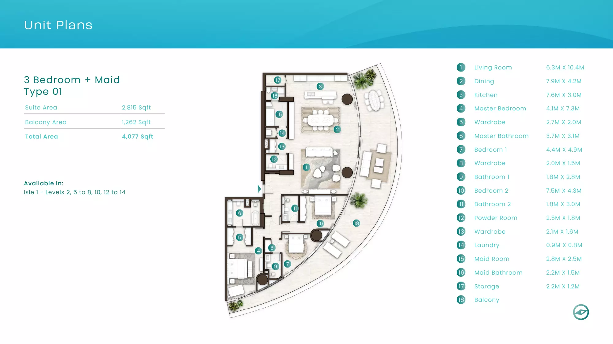 La Mer by Elie Saab offers luxurious apartments in various configurations: 1 Bed apartments, with sizes ranging from 1,019 to 2,026 sqft, starting from 1.9M AED. 2 Bed apartments, with sizes between 1,108 to 2,638 sqft, starting from 3.1M AED. 3 Bed apartments starting from 5.2M AED (specific sizes not mentioned). 4 Bed apartments with a size of 3,337 sqft. These properties are designed with high-end finishes and offer a premium lifestyle in the sought-after location of Al Marjan Island, Ras Al Khaimah.