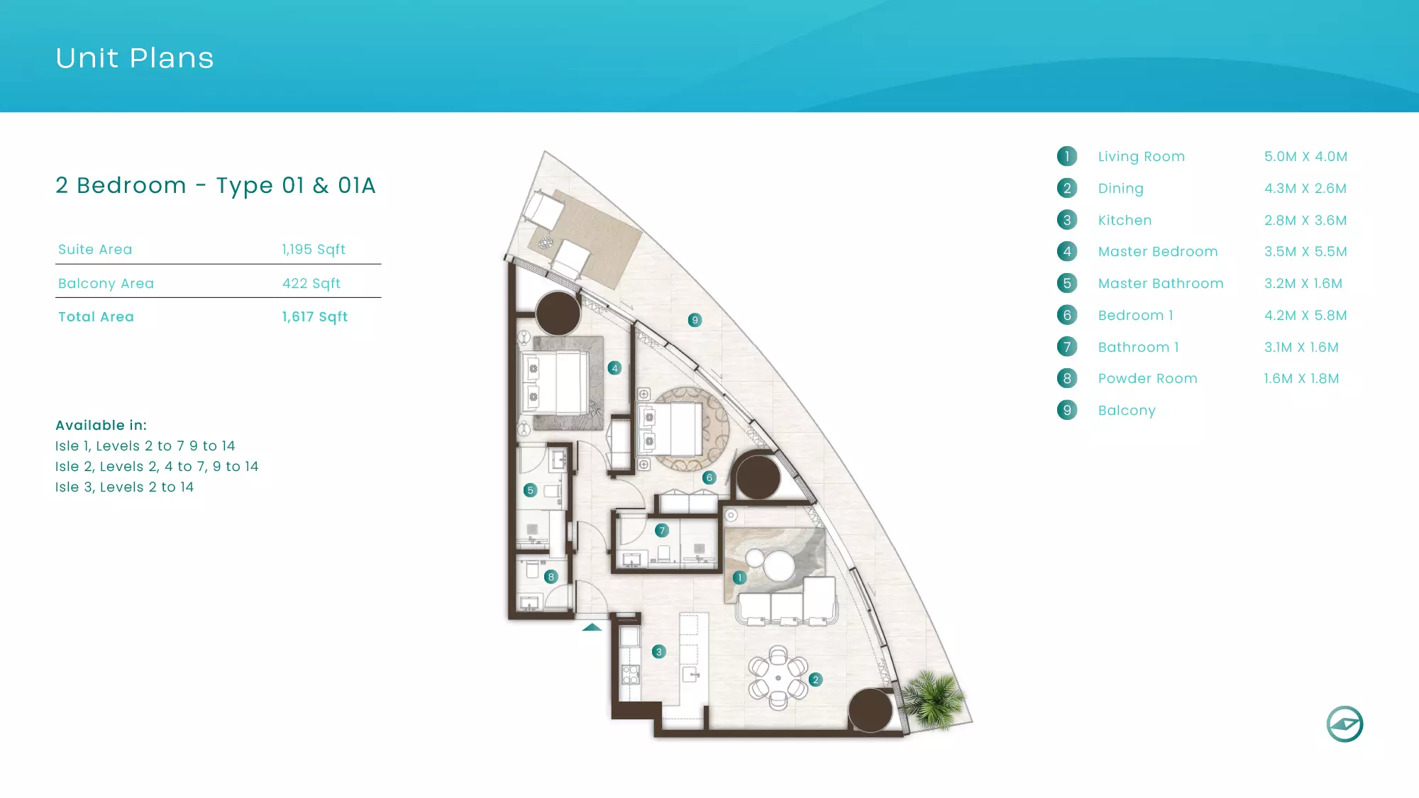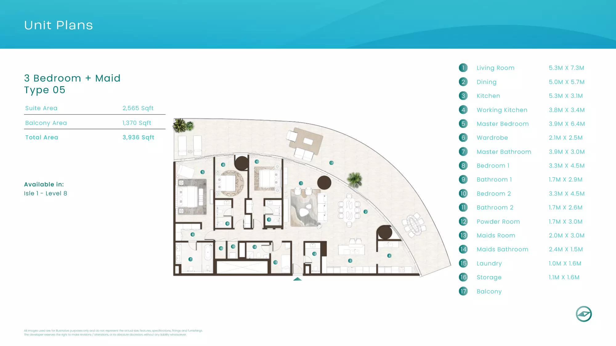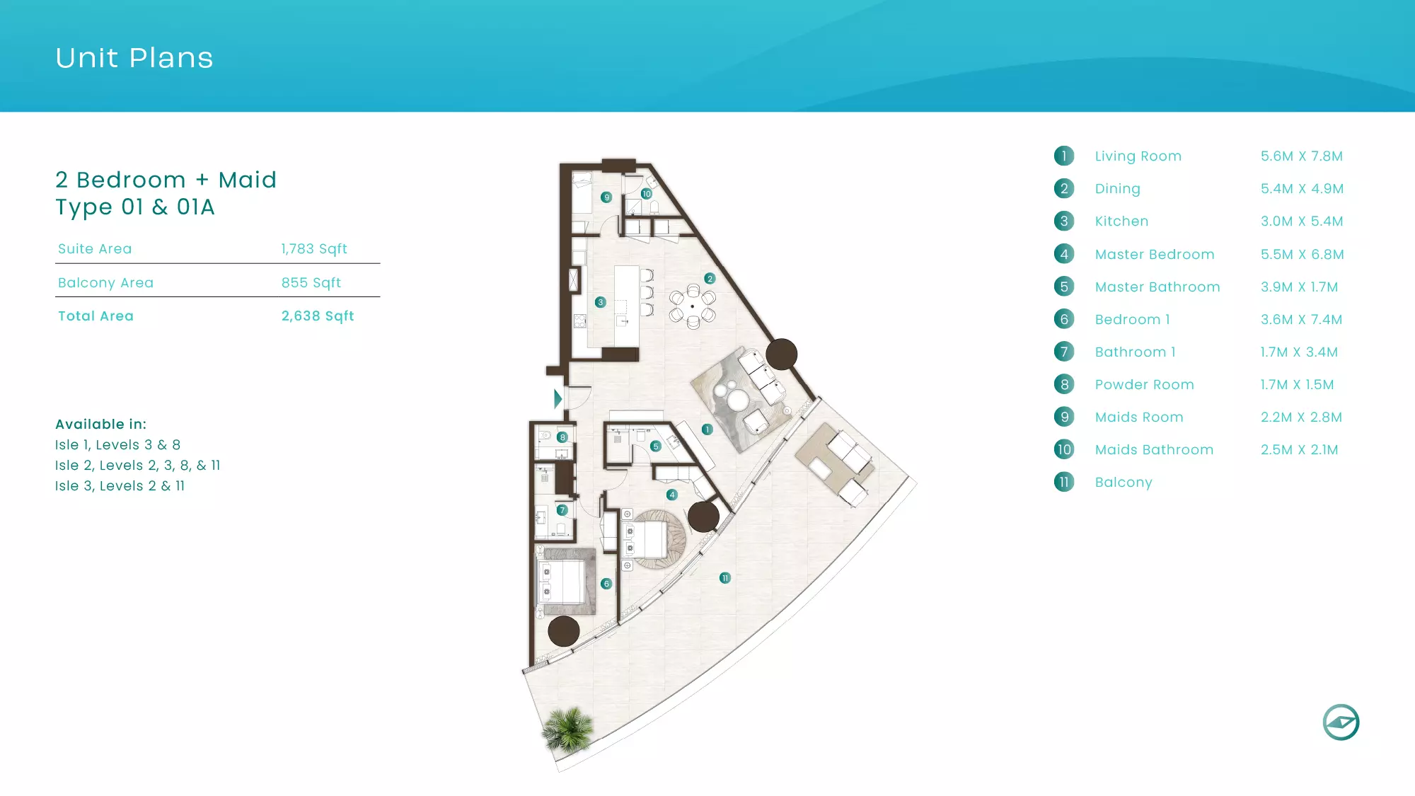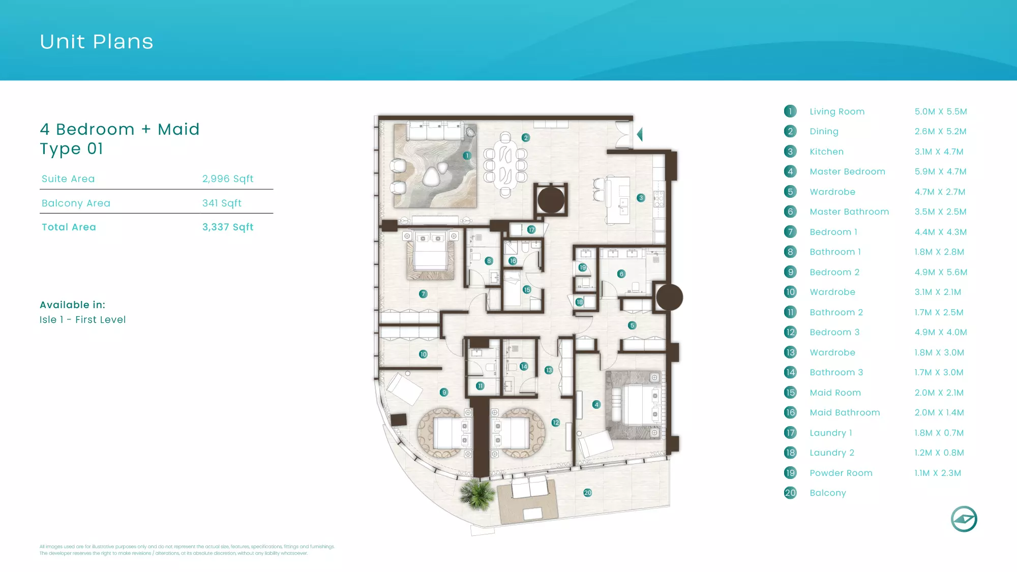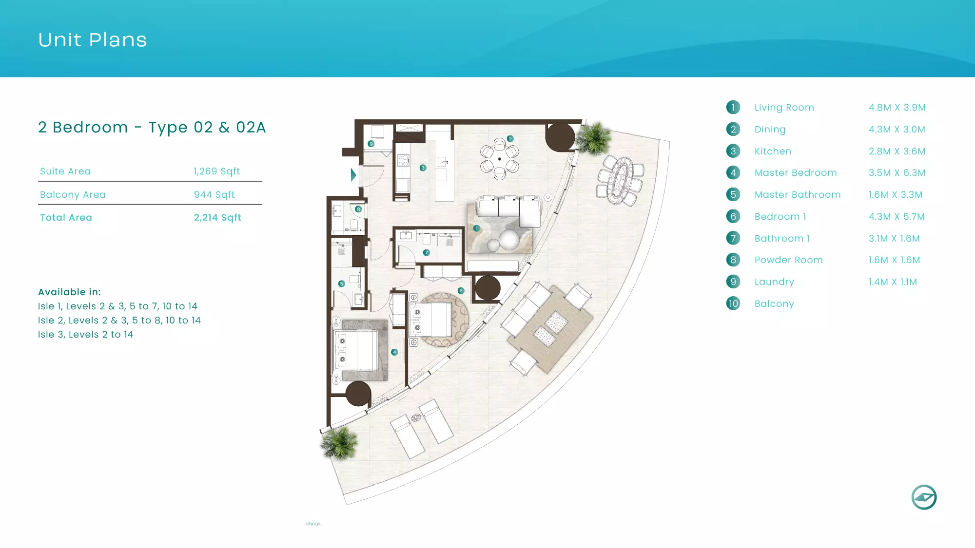 La Mer by Elie Saab offers luxurious apartments in various configurations: 1 Bed apartments, with sizes ranging from 1,019 to 2,026 sqft, starting from 1.9M AED. 2 Bed apartments, with sizes between 1,108 to 2,638 sqft, starting from 3.1M AED. 3 Bed apartments starting from 5.2M AED (specific sizes not mentioned). 4 Bed apartments with a size of 3,337 sqft. These properties are designed with high-end finishes and offer a premium lifestyle in the sought-after location of Al Marjan Island, Ras Al Khaimah.