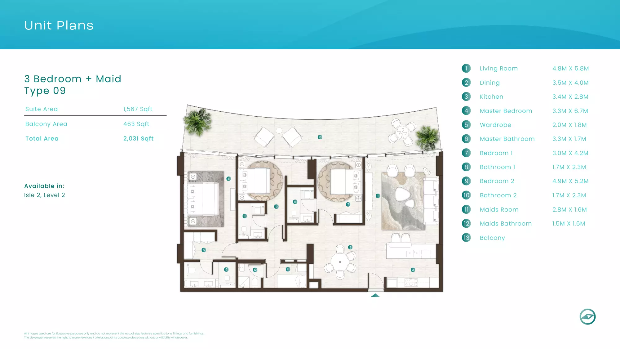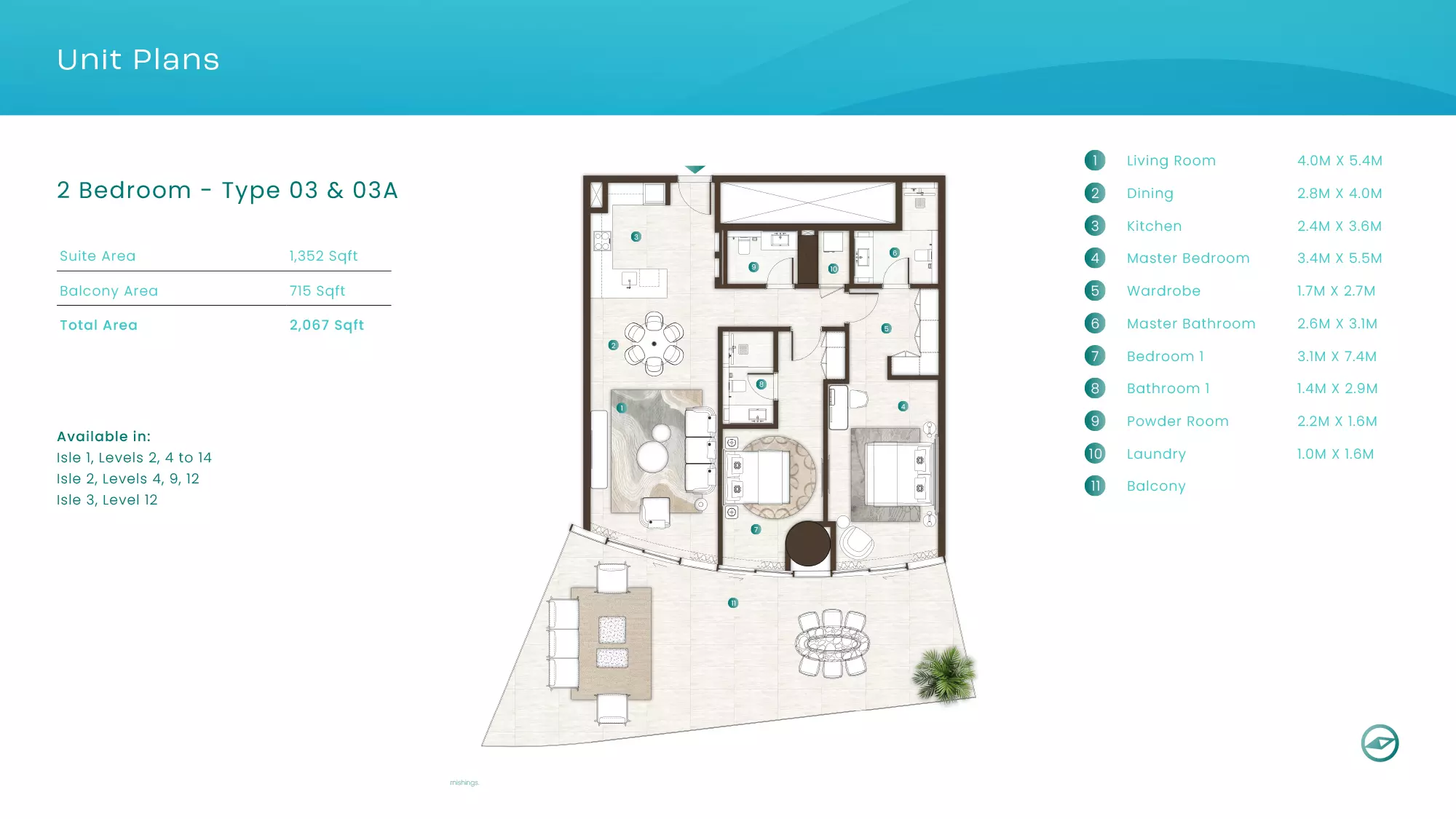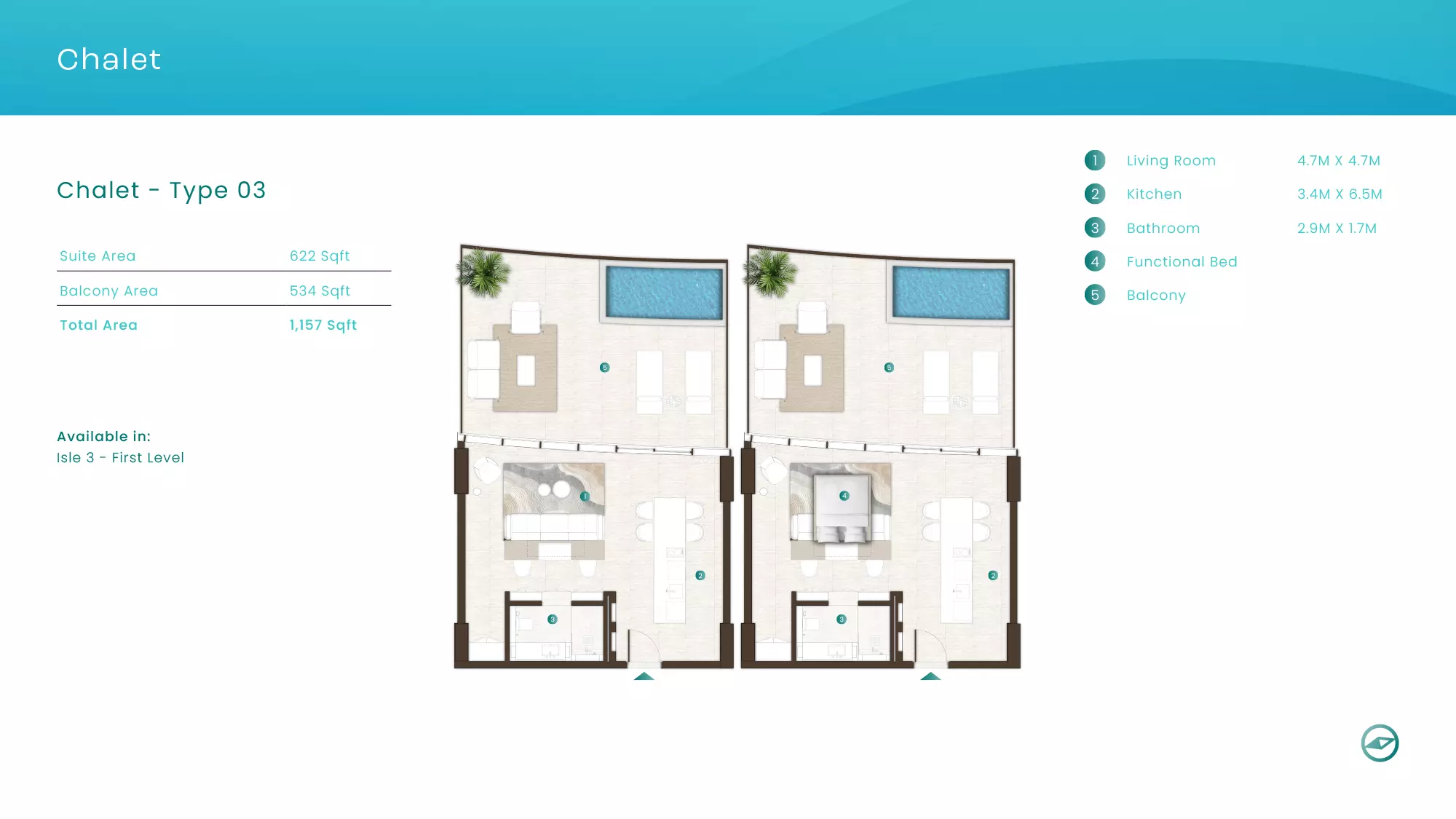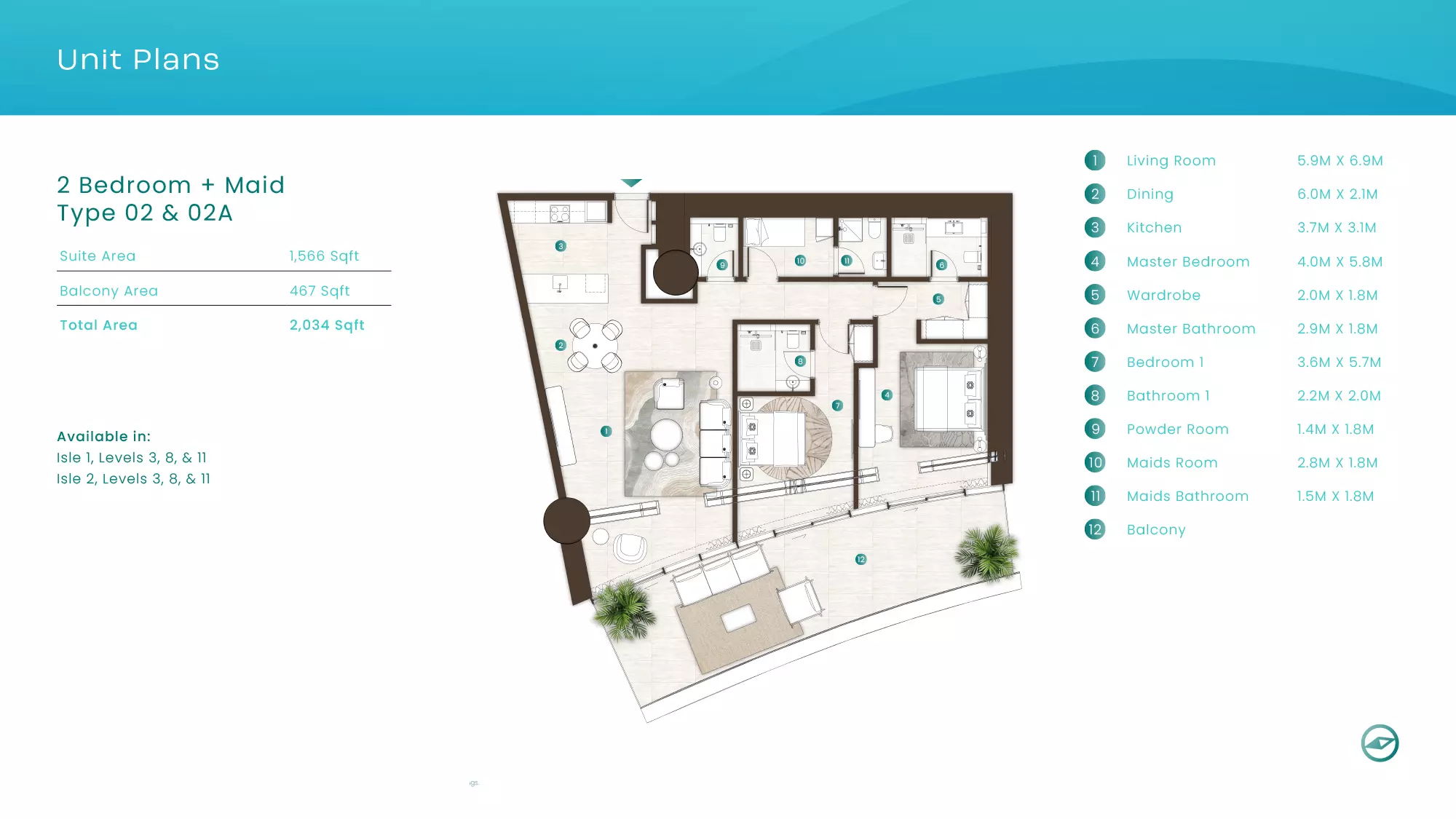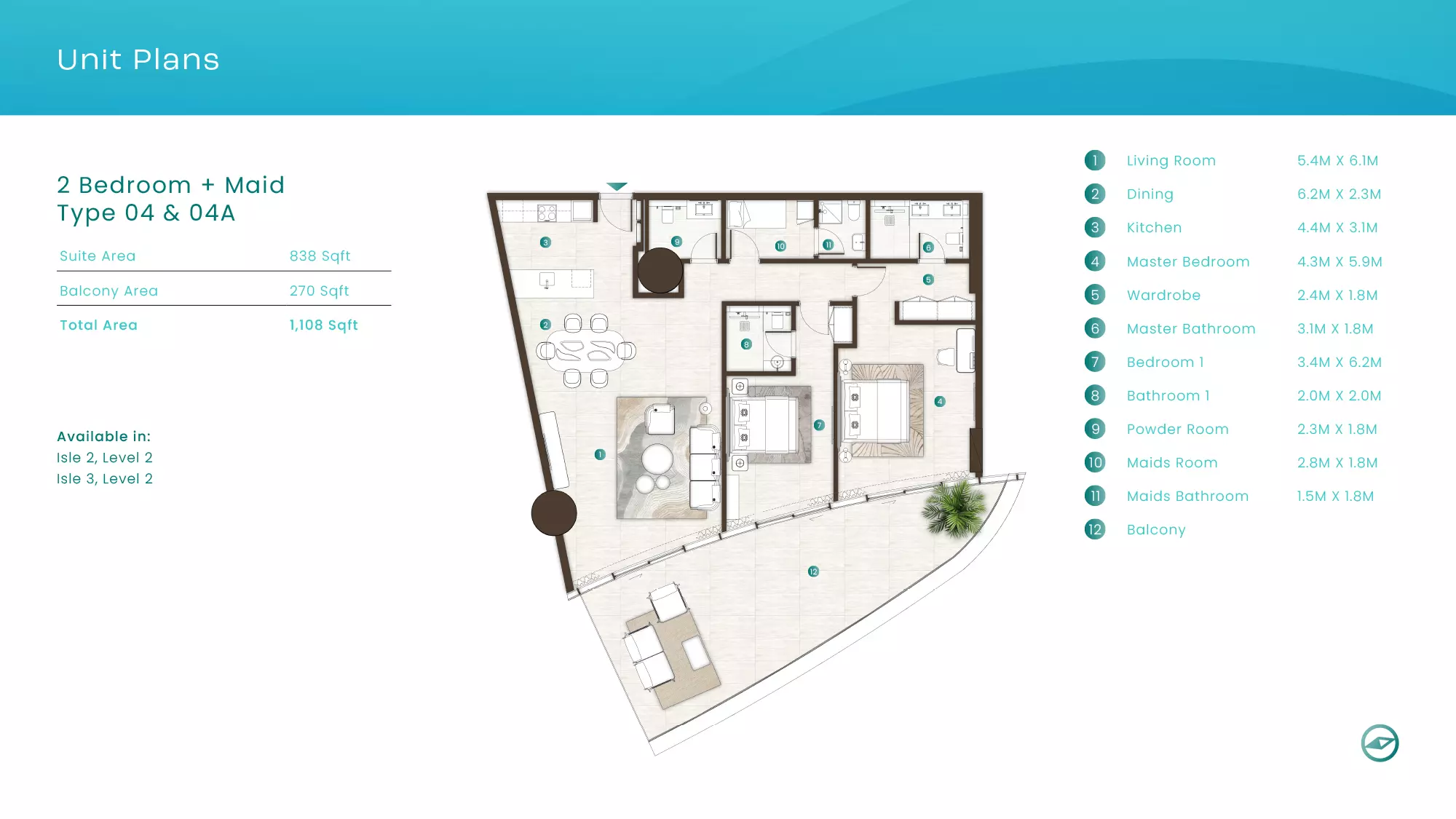 La Mer by Elie Saab offers luxurious apartments in various configurations: 1 Bed apartments, with sizes ranging from 1,019 to 2,026 sqft, starting from 1.9M AED. 2 Bed apartments, with sizes between 1,108 to 2,638 sqft, starting from 3.1M AED. 3 Bed apartments starting from 5.2M AED (specific sizes not mentioned). 4 Bed apartments with a size of 3,337 sqft. These properties are designed with high-end finishes and offer a premium lifestyle in the sought-after location of Al Marjan Island, Ras Al Khaimah.