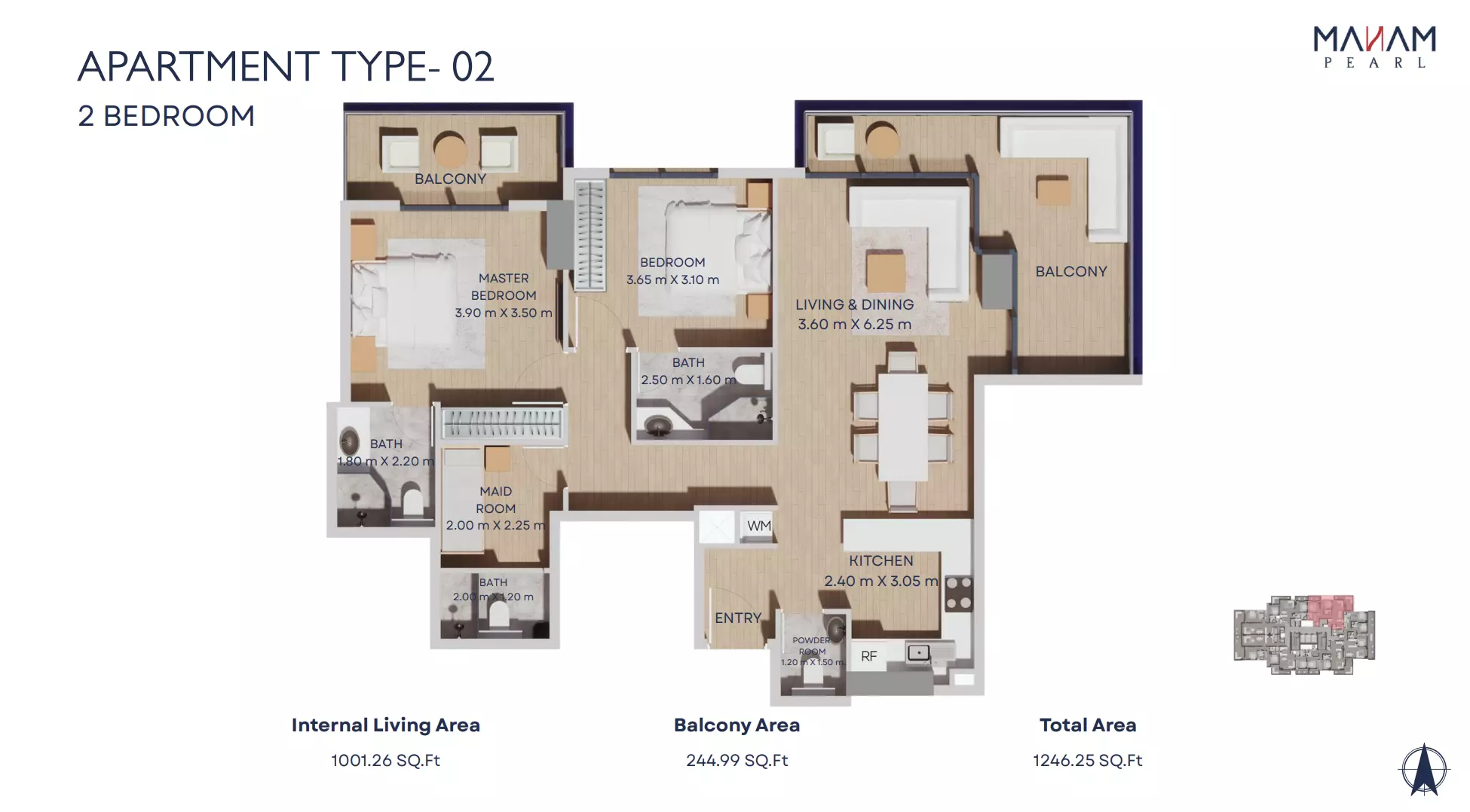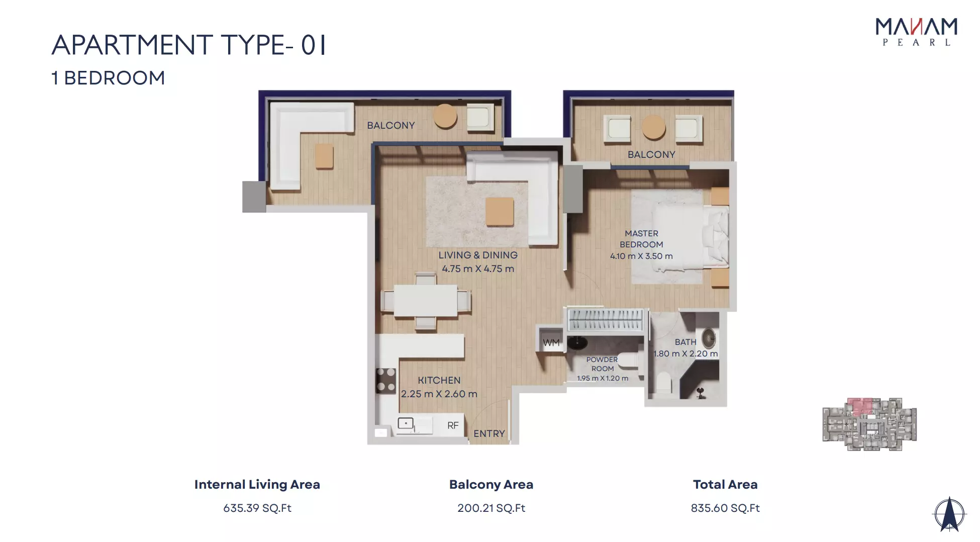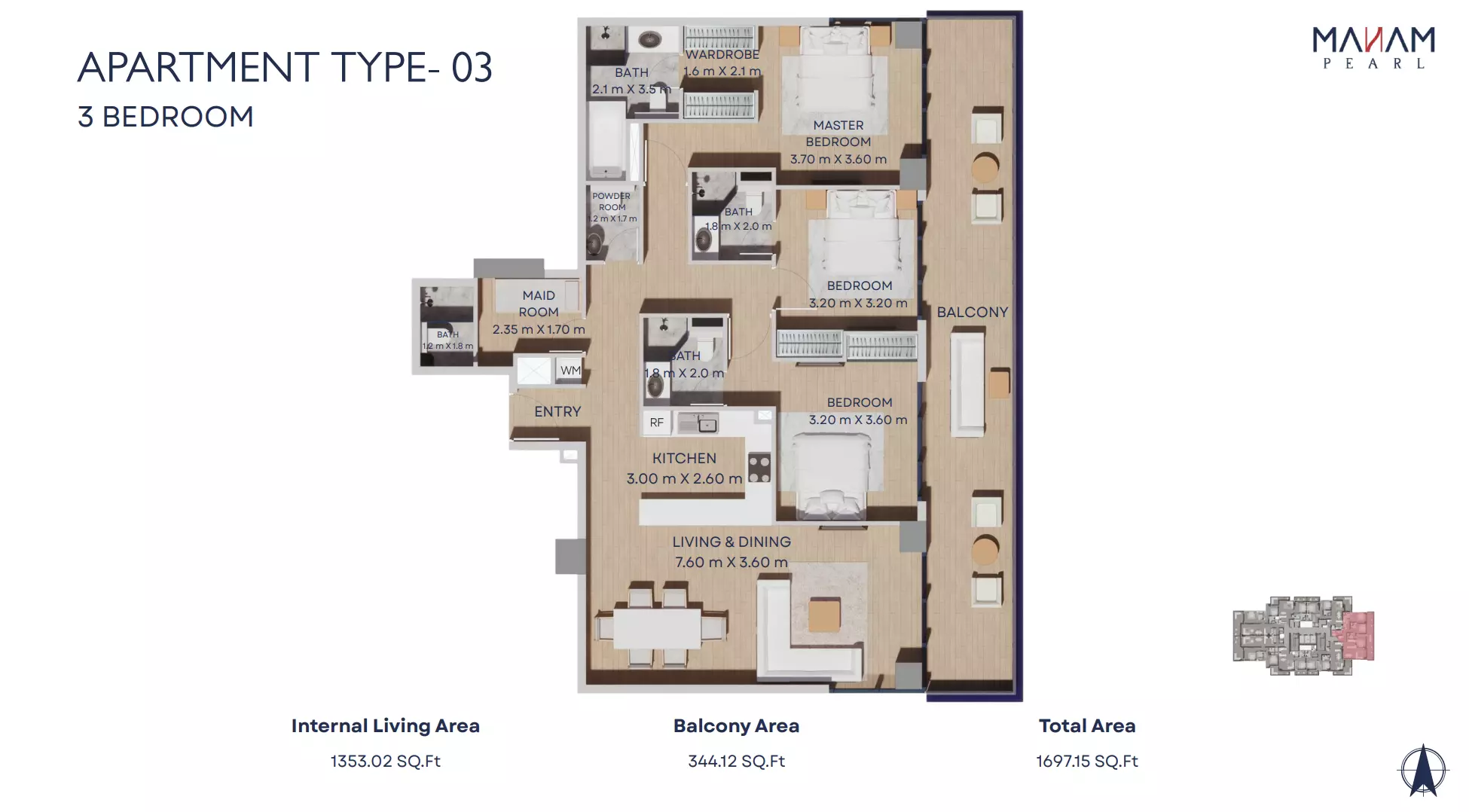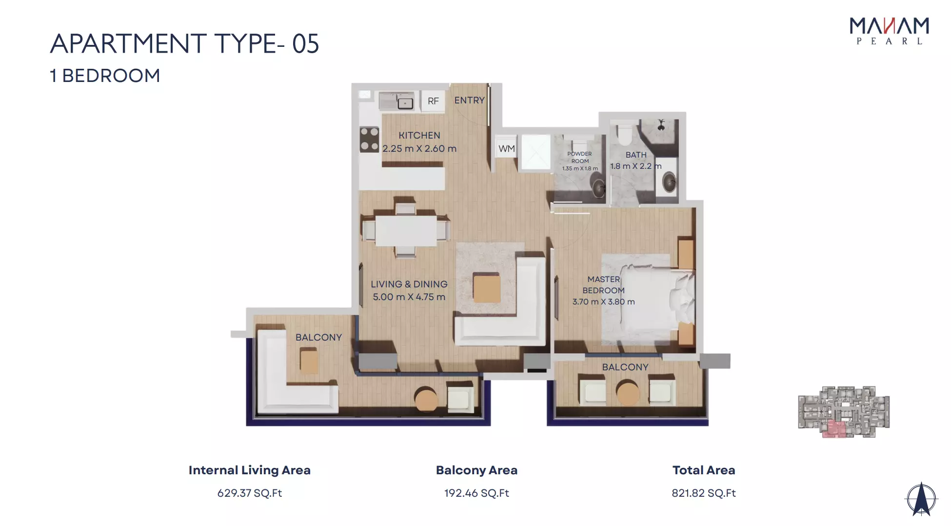 Manam Pearl offers a range of spacious apartment units designed for modern living. The housing options include one-bedroom, two-bedroom, and three-bedroom apartments. One-bedroom units start from AED 1.1 million and range in size from 821 to 1,092 square feet. Two-bedroom apartments are priced from AED 1.7 million, with sizes between 1,228 and 2,398 square feet. Three-bedroom units begin at AED 2.4 million and offer expansive living spaces ranging from 1,697 to 3,181 square feet. Each unit is designed with high-quality finishes, functional layouts, and ample natural light, making Manam Pearl an appealing option for end-users and investors alike.