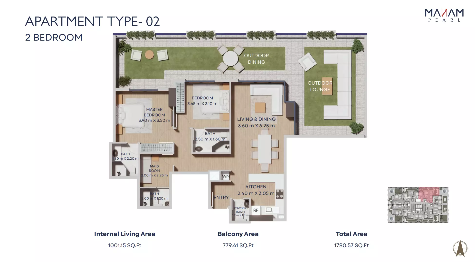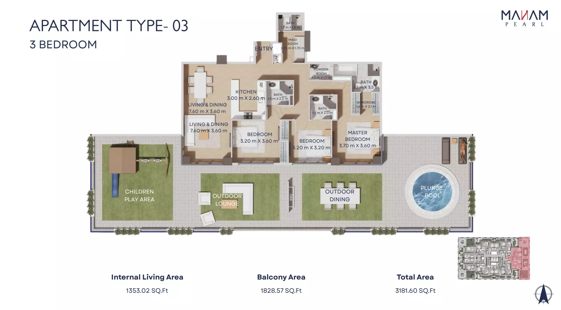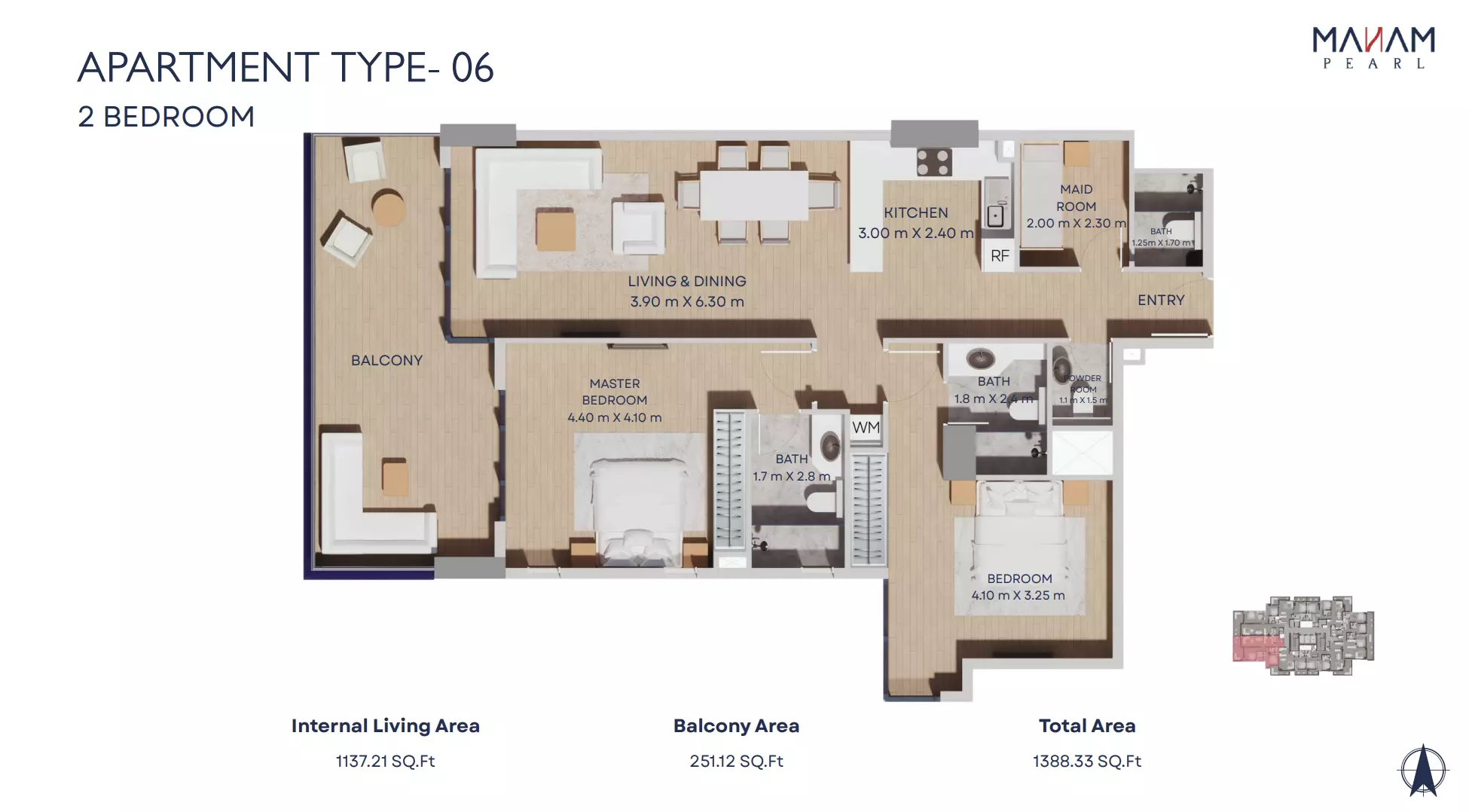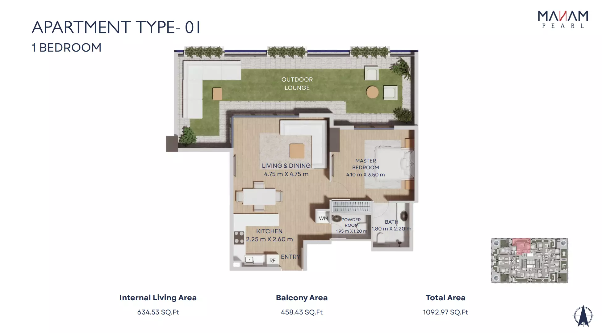 Manam Pearl offers a range of spacious apartment units designed for modern living. The housing options include one-bedroom, two-bedroom, and three-bedroom apartments. One-bedroom units start from AED 1.1 million and range in size from 821 to 1,092 square feet. Two-bedroom apartments are priced from AED 1.7 million, with sizes between 1,228 and 2,398 square feet. Three-bedroom units begin at AED 2.4 million and offer expansive living spaces ranging from 1,697 to 3,181 square feet. Each unit is designed with high-quality finishes, functional layouts, and ample natural light, making Manam Pearl an appealing option for end-users and investors alike.