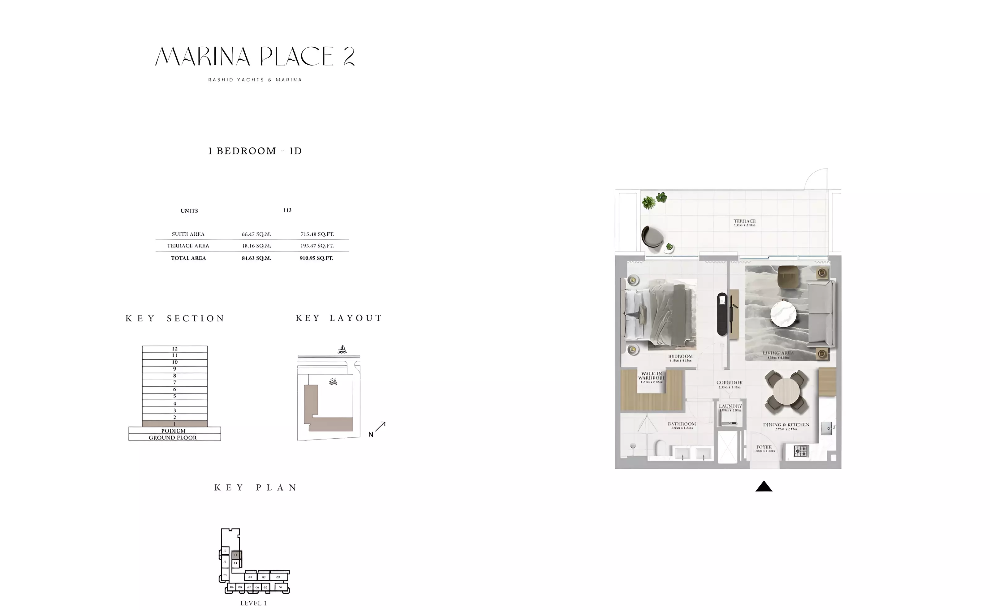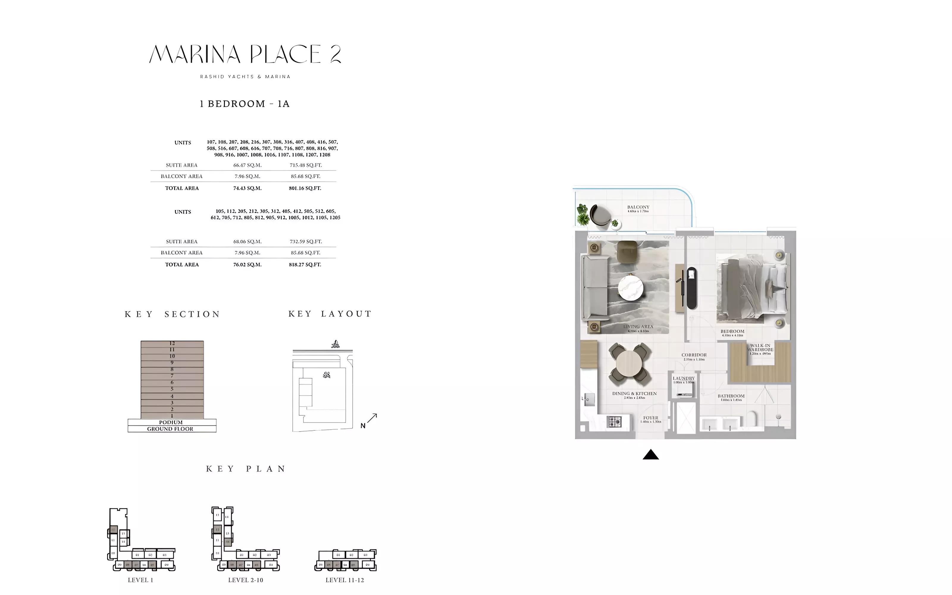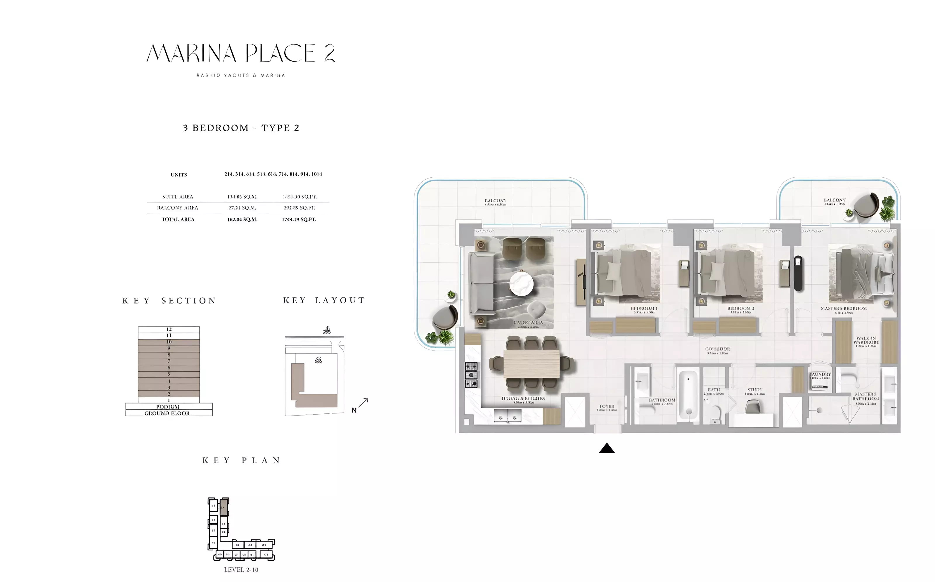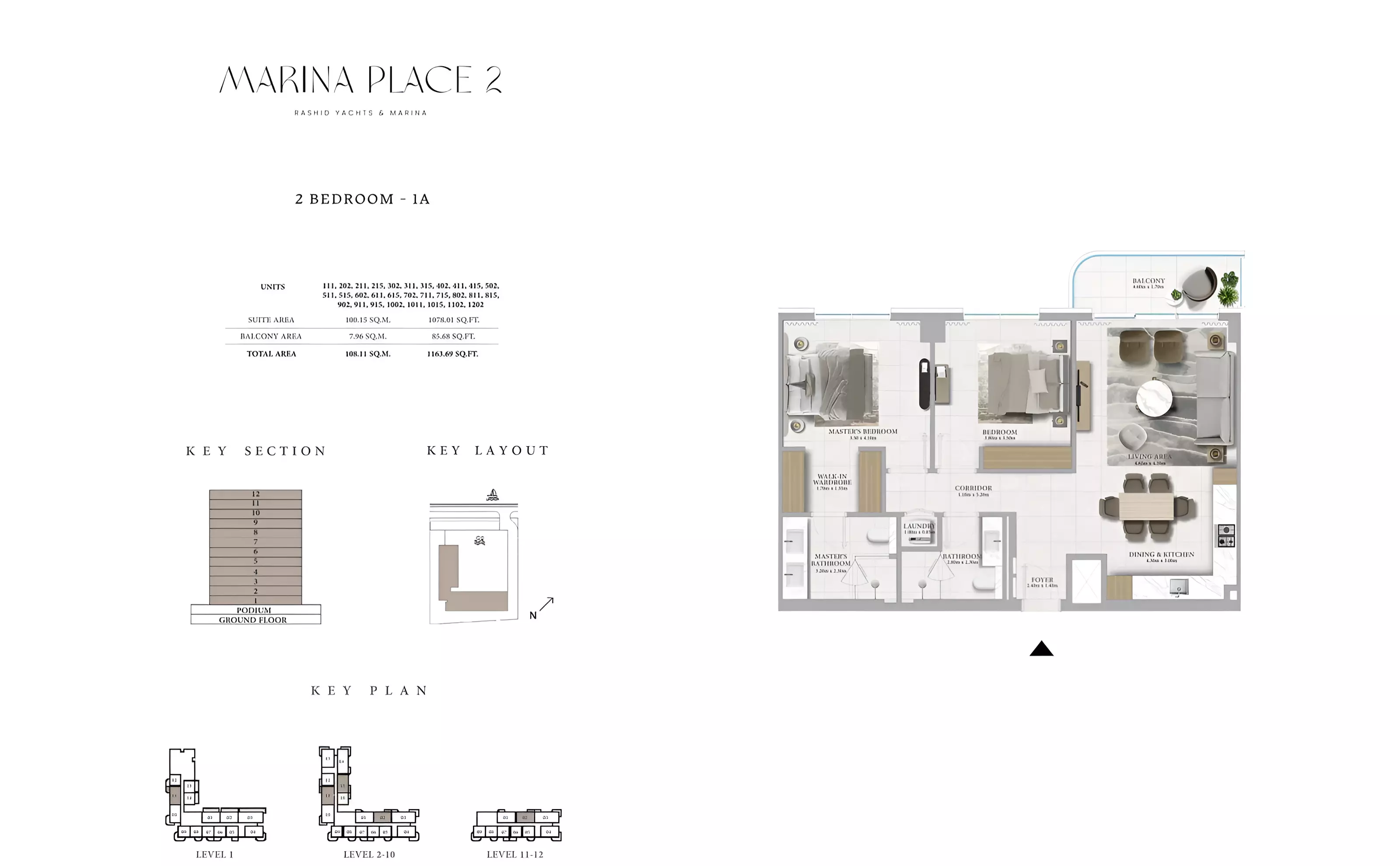 Marina Place Phase 2 offers a variety of modern apartments and townhouses: • 1 Bedroom Apartments: Sizes ranging from 801 to 910 sqft. • 2 Bedroom Apartments: Sizes ranging from 1,163 to 1,402 sqft. • 3 Bedroom Apartments: Sizes ranging from 1,718 to 1,954 sqft. • 3 Bedroom Townhouses: Sizes ranging from 2,543 to 2,557 sqft.