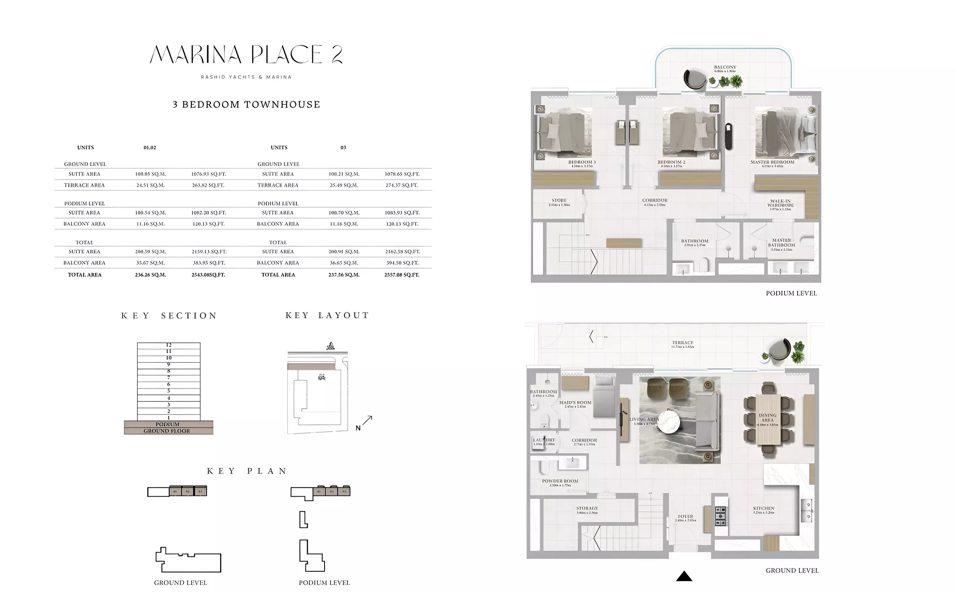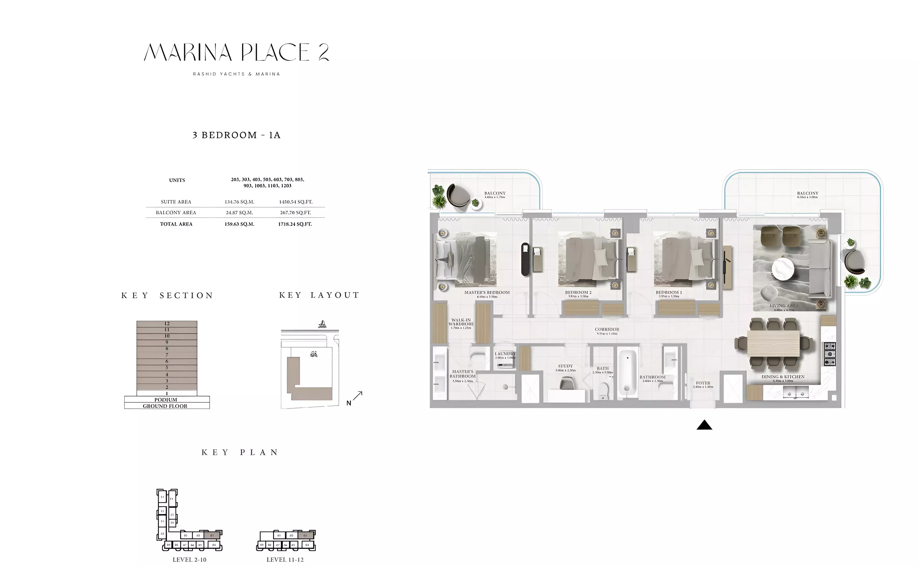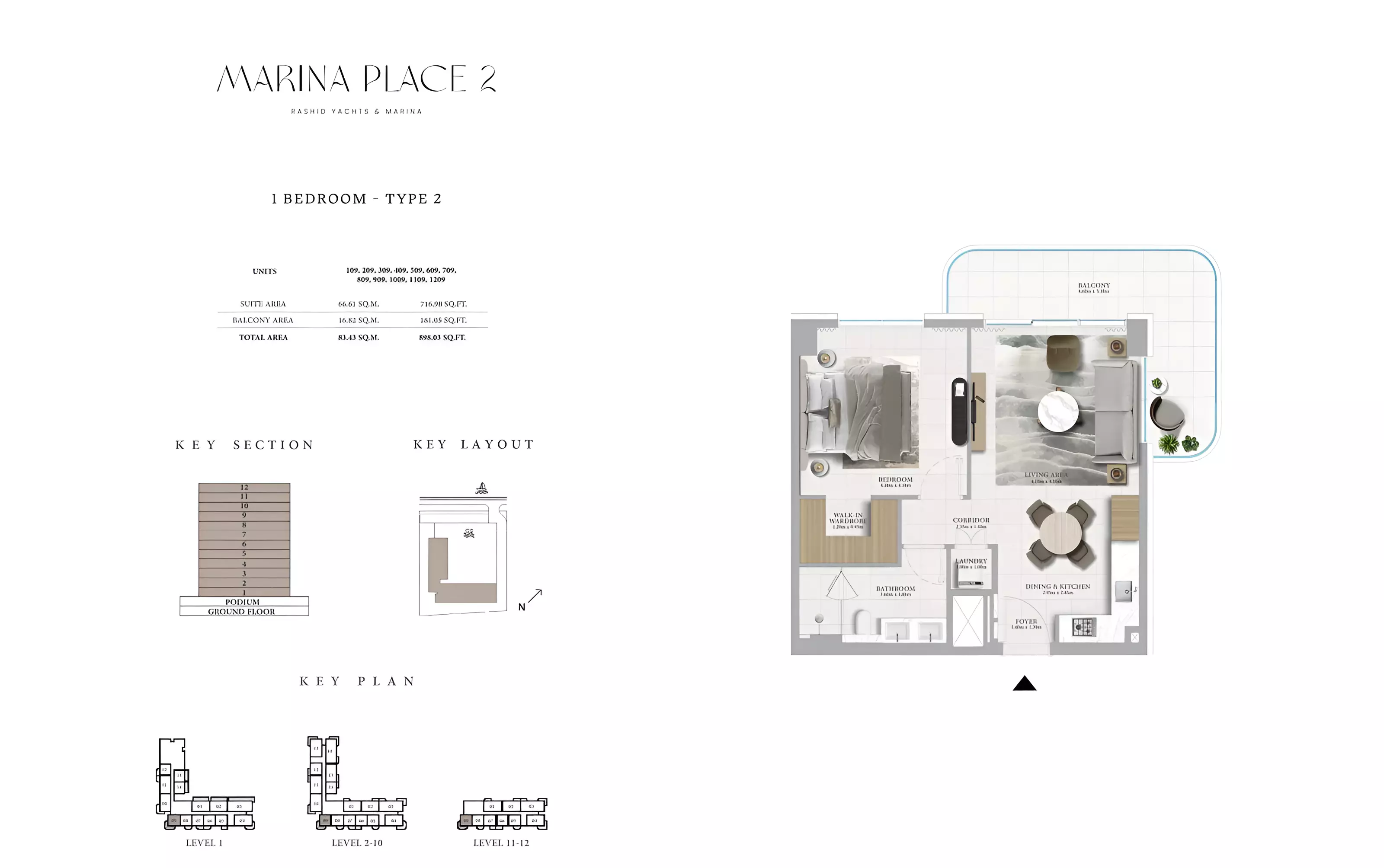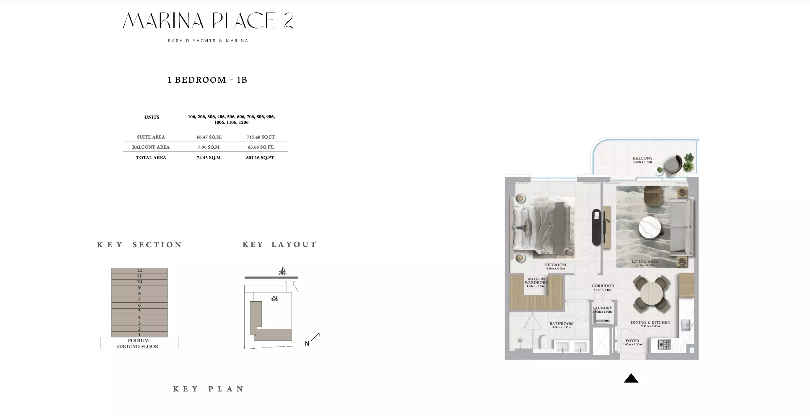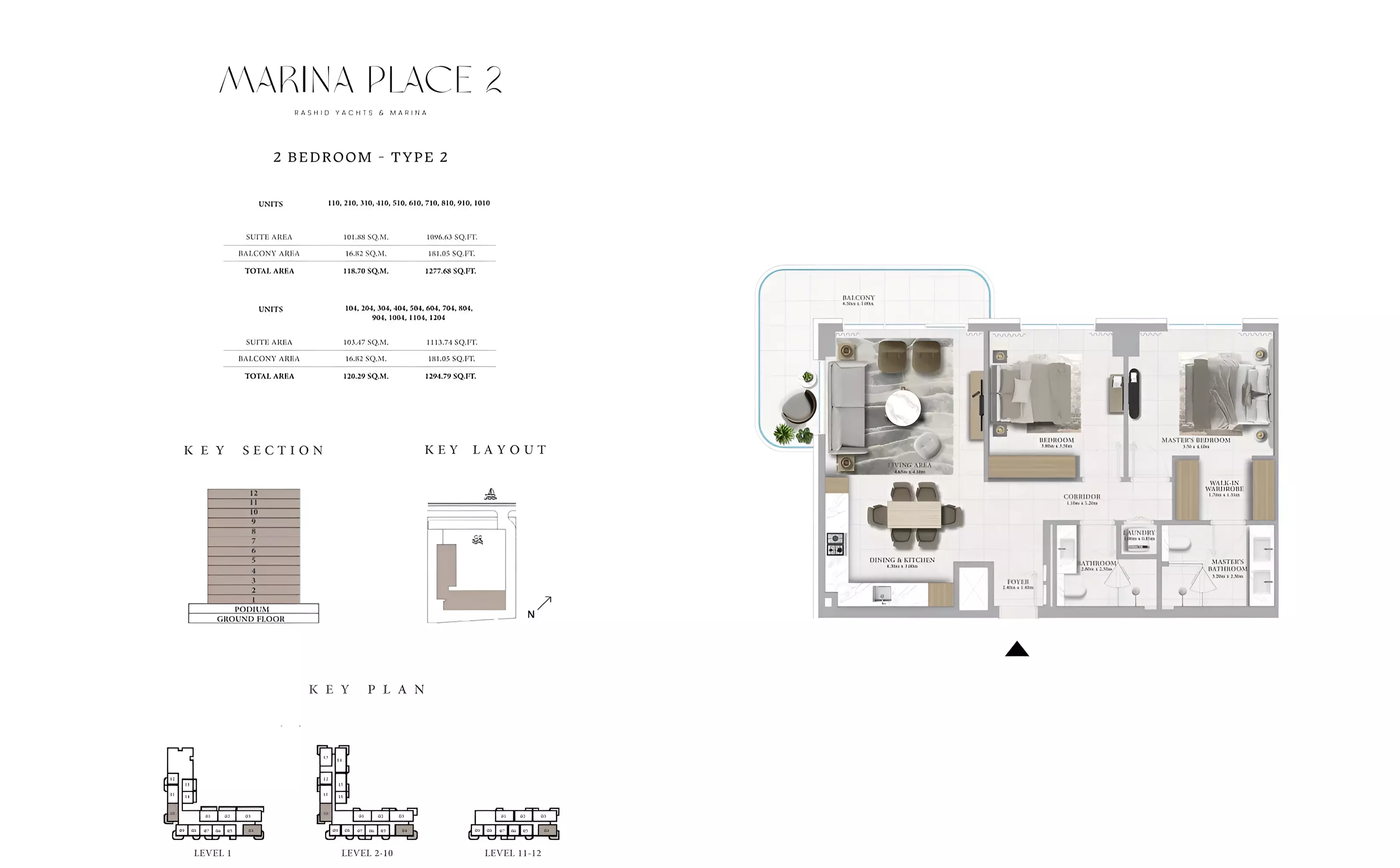 Marina Place Phase 2 offers a variety of modern apartments and townhouses: • 1 Bedroom Apartments: Sizes ranging from 801 to 910 sqft. • 2 Bedroom Apartments: Sizes ranging from 1,163 to 1,402 sqft. • 3 Bedroom Apartments: Sizes ranging from 1,718 to 1,954 sqft. • 3 Bedroom Townhouses: Sizes ranging from 2,543 to 2,557 sqft.