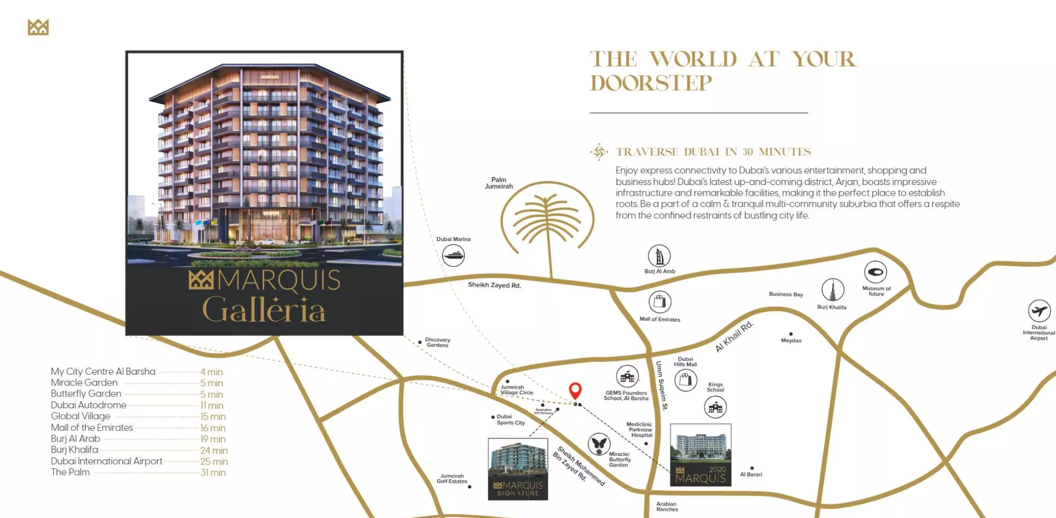 Marquis Galleria offers a strong investment opportunity in a prime Dubai location, promising high returns. Its strategic position in Arjan ensures accessibility to key destinations, making it a smart choice for investors.