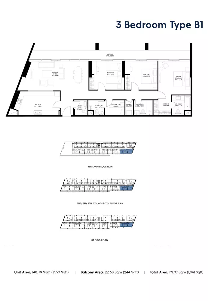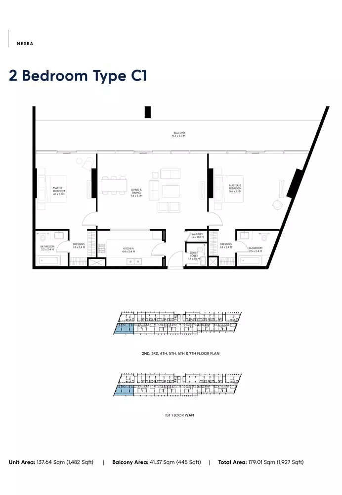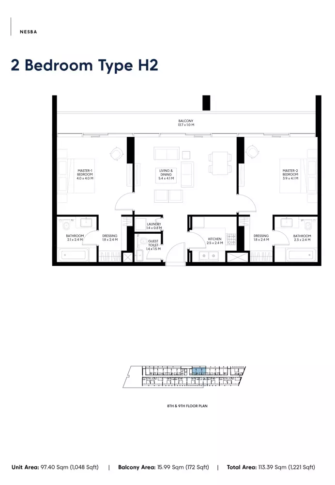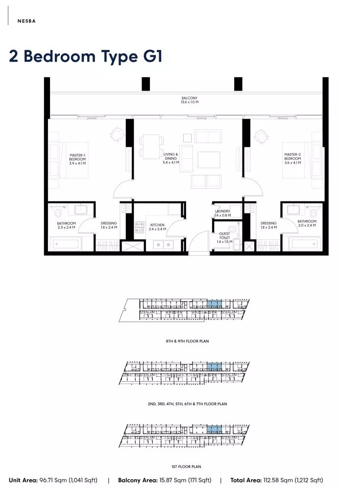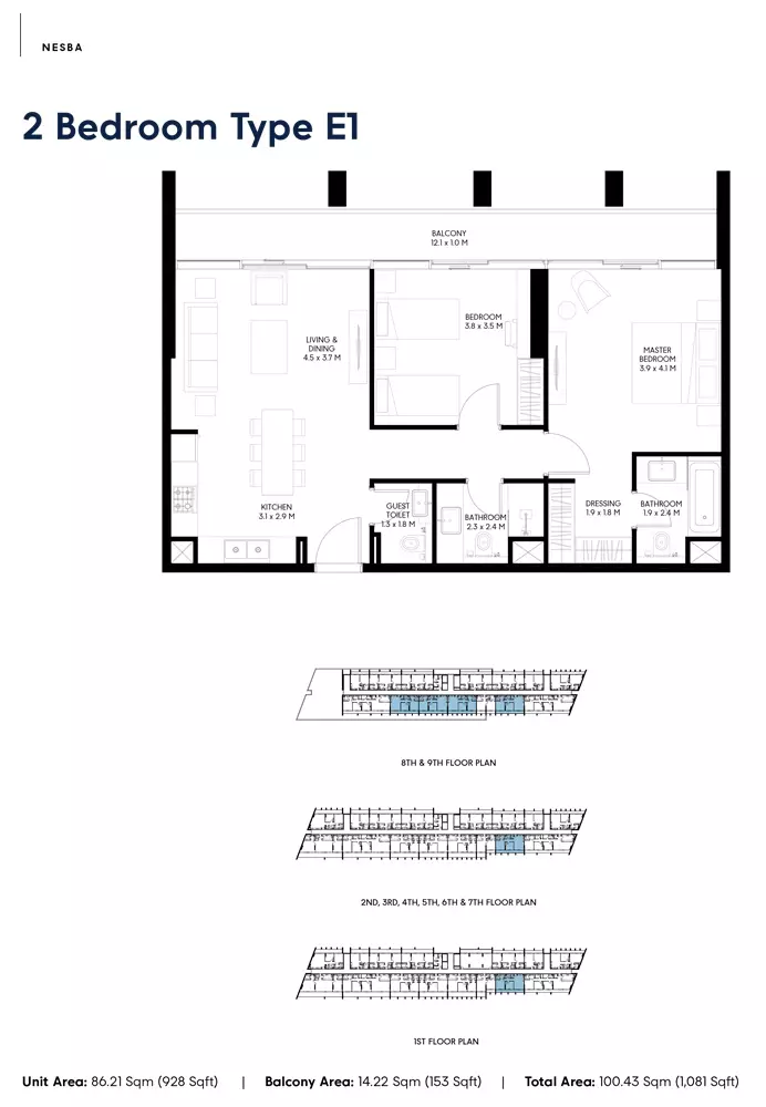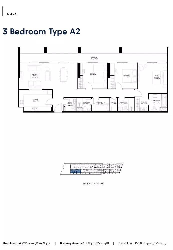 Nesba 3 offers a selection of well-designed apartments with various sizes to cater to different needs. The available housing options include: 1-bedroom apartments, with sizes ranging from 717 to 811 square feet, ideal for individuals or couples seeking a compact living space. 2-bedroom apartments, ranging from 1081 to 1927 square feet, perfect for small families or those needing additional space for work and relaxation. 3-bedroom apartments, sized between 1795 to 2252 square feet, offering more spacious living areas for larger families or those seeking more luxury. These apartments offer modern living spaces within Sharjah’s vibrant Aljada community.