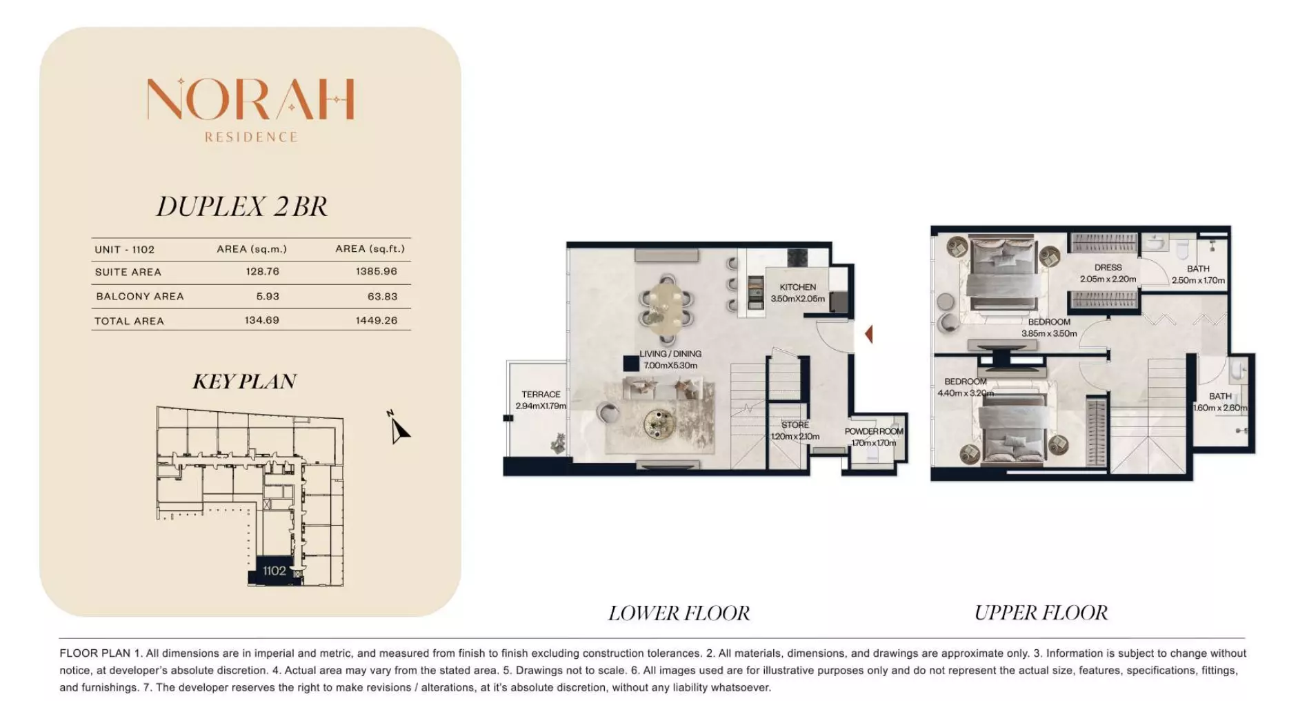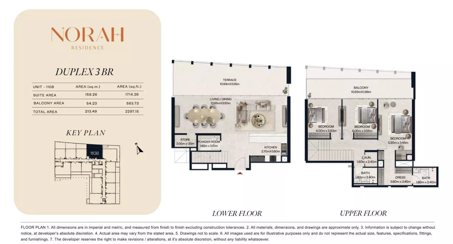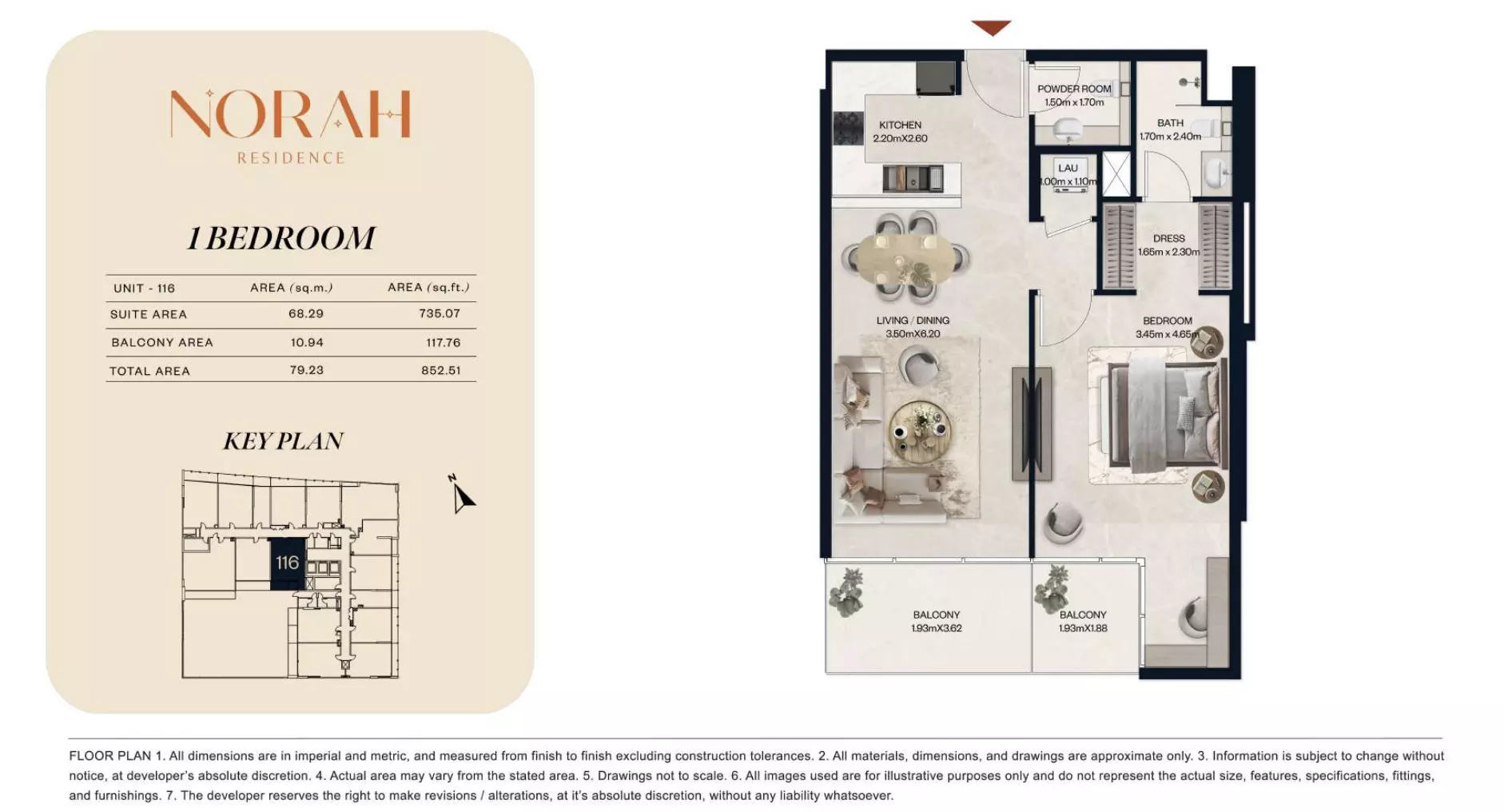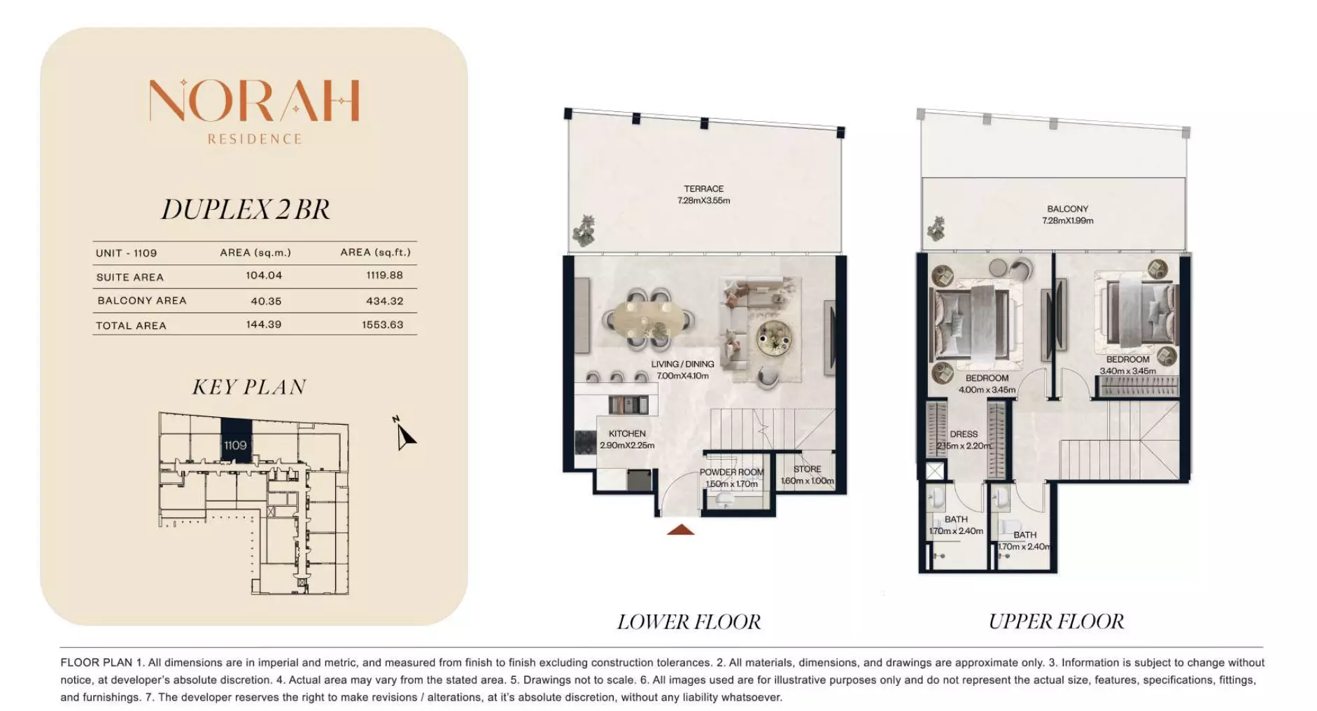 Norah Residence provides a wide range of apartments and duplexes with layouts designed to accommodate different household requirements. The project includes studios starting from AED 650,000, with sizes between 382 and 411 sq. ft., suitable for compact living. One-bedroom apartments are available from AED 1.1 million, offering spaces from 718 to 889 sq. ft. For larger options, two-bedroom apartments are priced from AED 1.8 million, with unit sizes ranging from 1,075 to 1,251 sq. ft. The development also offers two-bedroom duplex units starting at AED 2.2 million, with areas from 1,436 to 1,674 sq. ft. For families seeking even more space, three-bedroom apartments are available from AED 3 million, with expansive layouts ranging from 2,032 to 2,731 sq. ft. This selection ensures flexibility for buyers across various budget and space preferences.