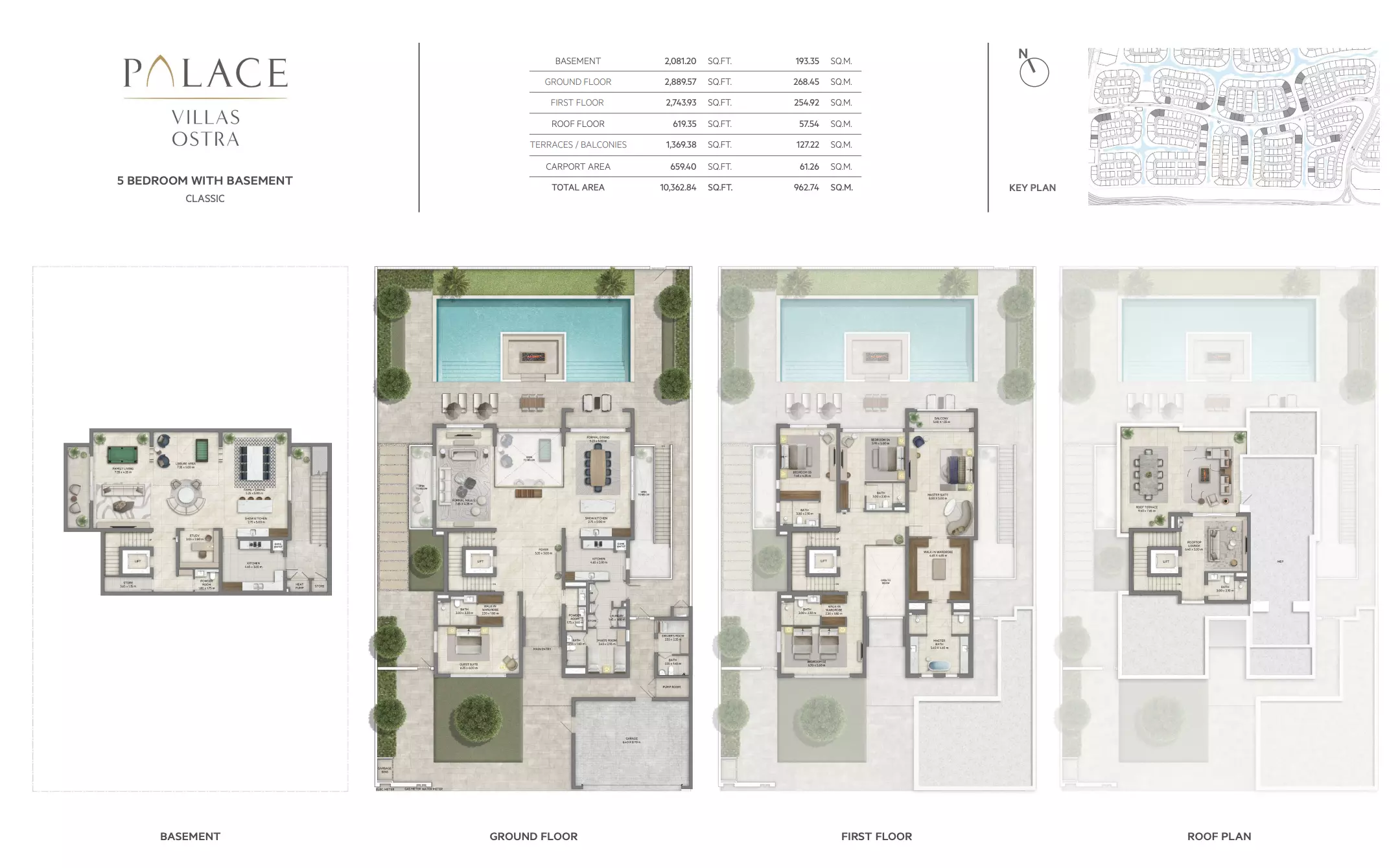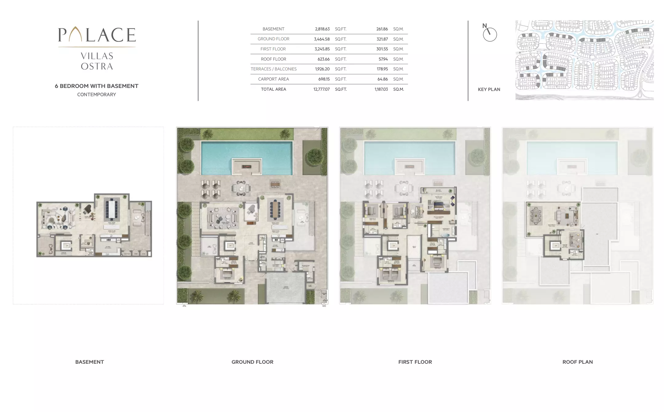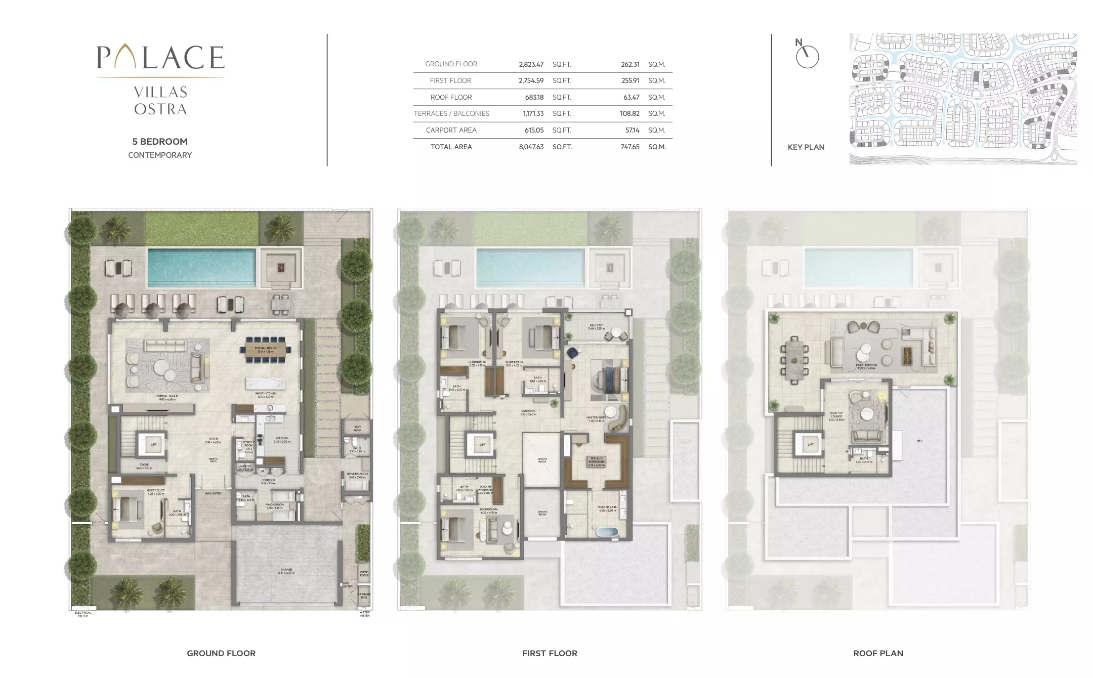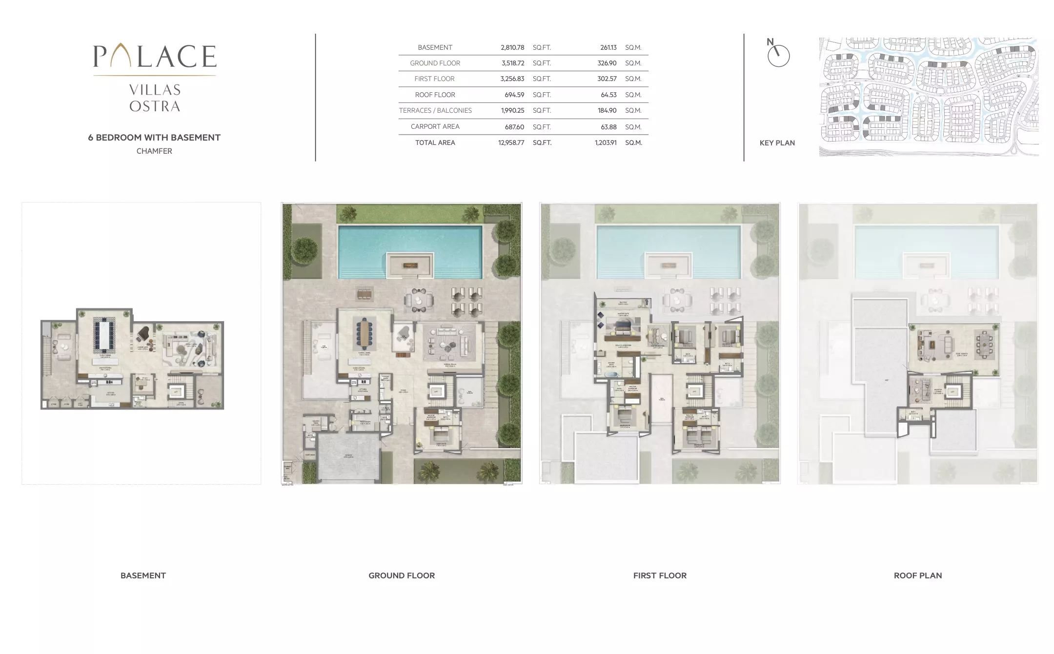 Palace Villas Ostra offers a premium selection of luxury villas designed to meet the needs of high-end buyers seeking space, comfort, and exclusivity. The development includes 4, 5, and 6-bedroom villas, each set on expansive plots with refined architectural finishes. • 4-Bedroom Villas start from AED 13,000,000, with sizes ranging between 7,268 to 7,301 sq ft. • 5-Bedroom Villas are priced from AED 15,000,000, offering living spaces between 7,922 to 11,181 sq ft. • 6-Bedroom Villas begin at AED 24,000,000, with unit sizes from 12,777 to 12,958 sq ft. All villas are designed to deliver seamless indoor-outdoor living, featuring private gardens, pools, and high-end interiors that reflect modern luxury.