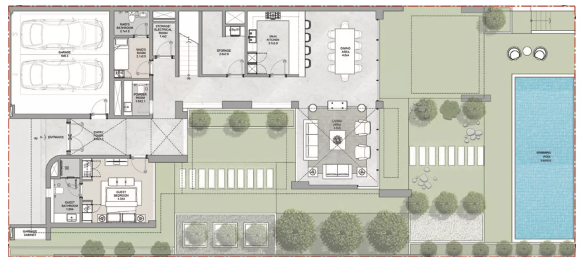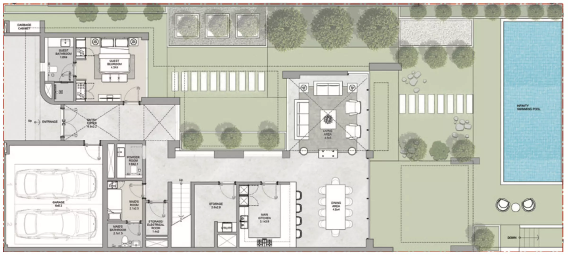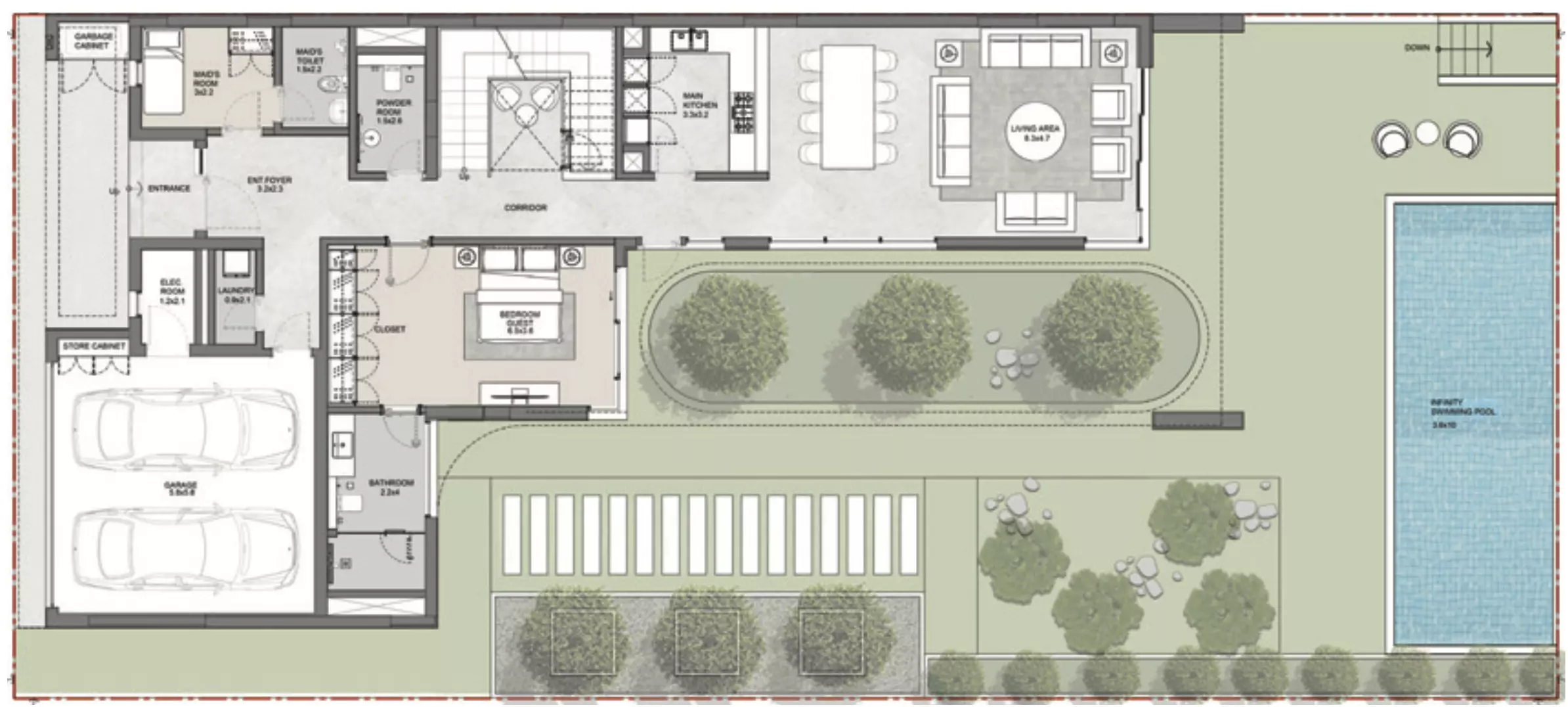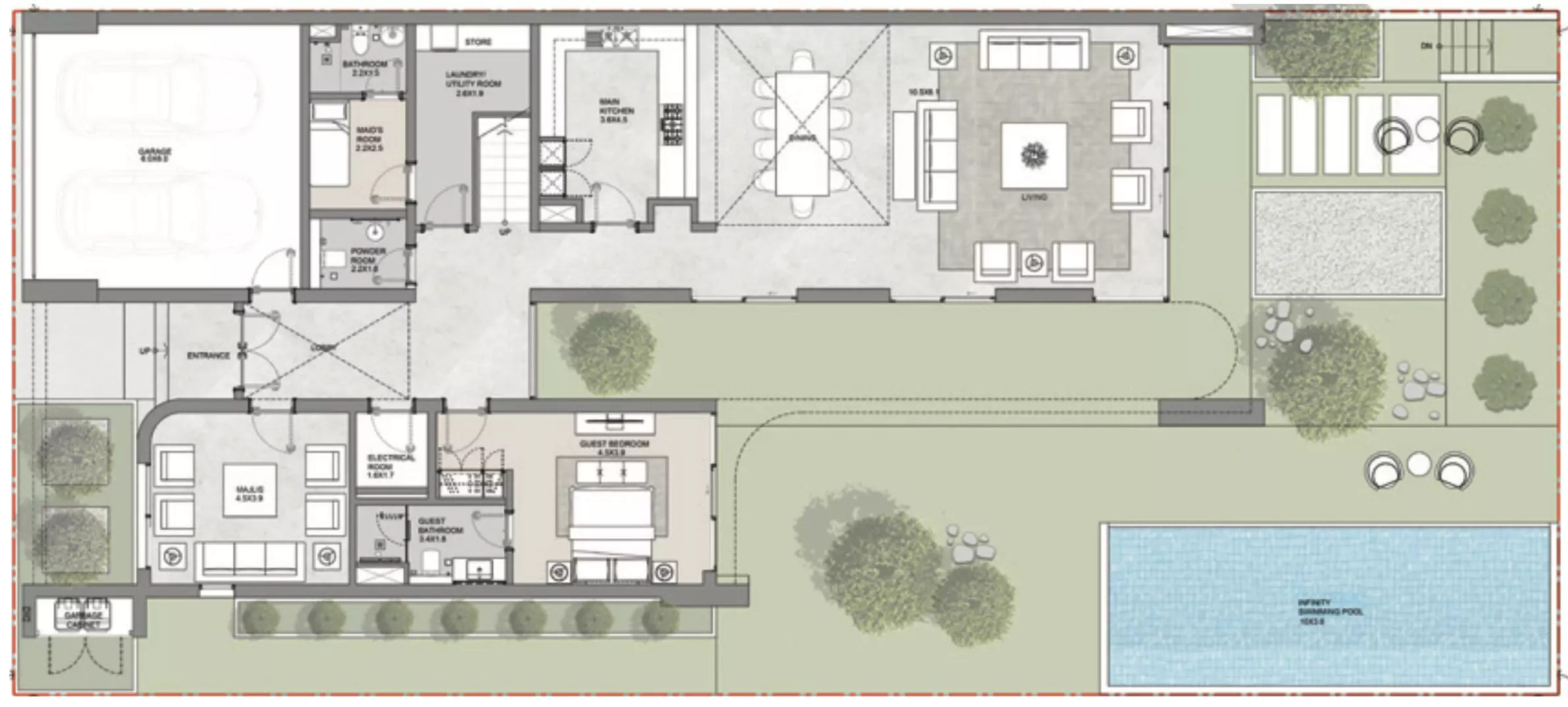 Palm Groove Villas offers 4-bedroom villas, ranging in size from 4,814 to 5,219 sqft. The prices start from 11 million AED. These spacious villas provide luxurious living options with a variety of features designed for comfort and style.