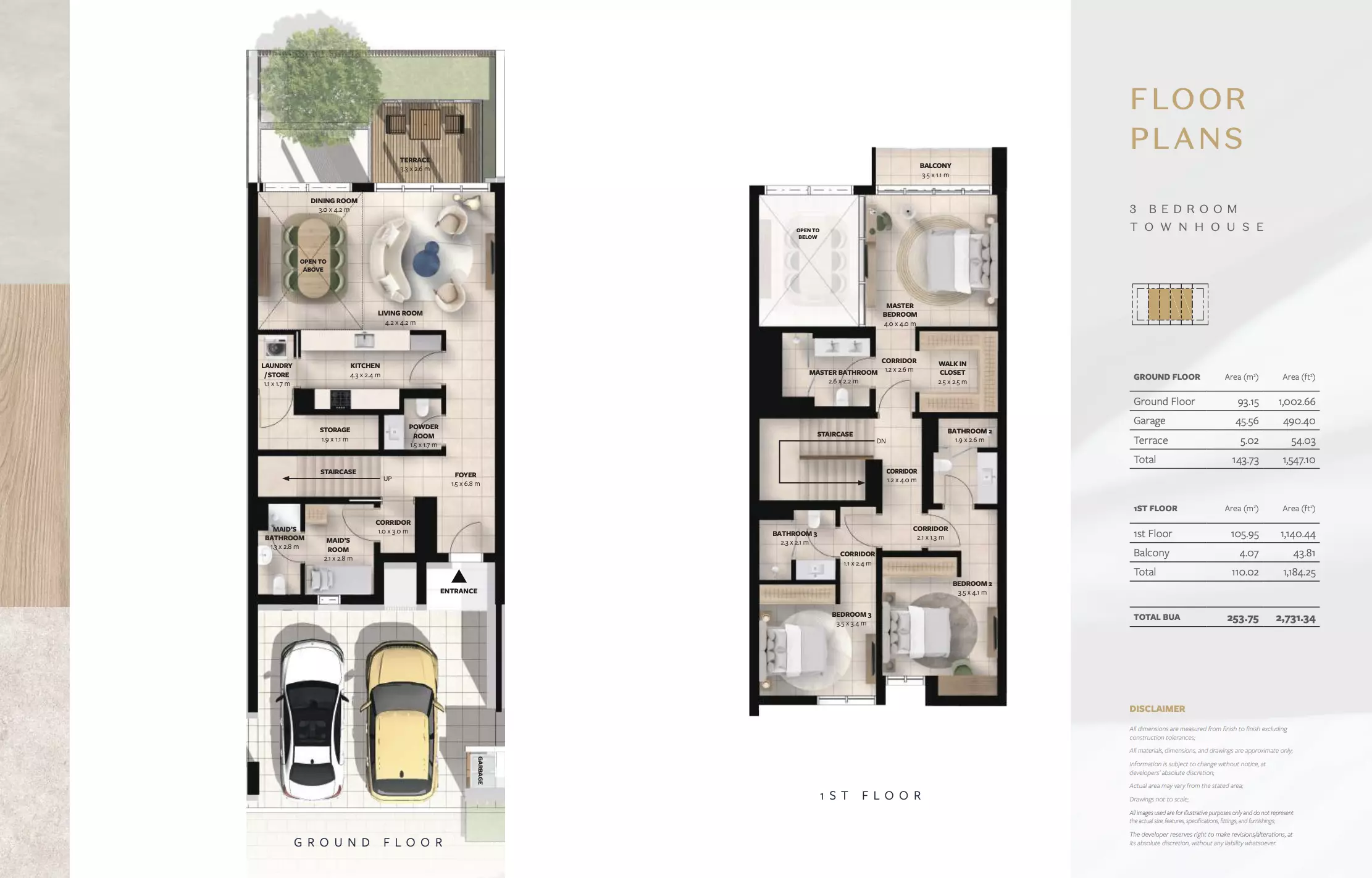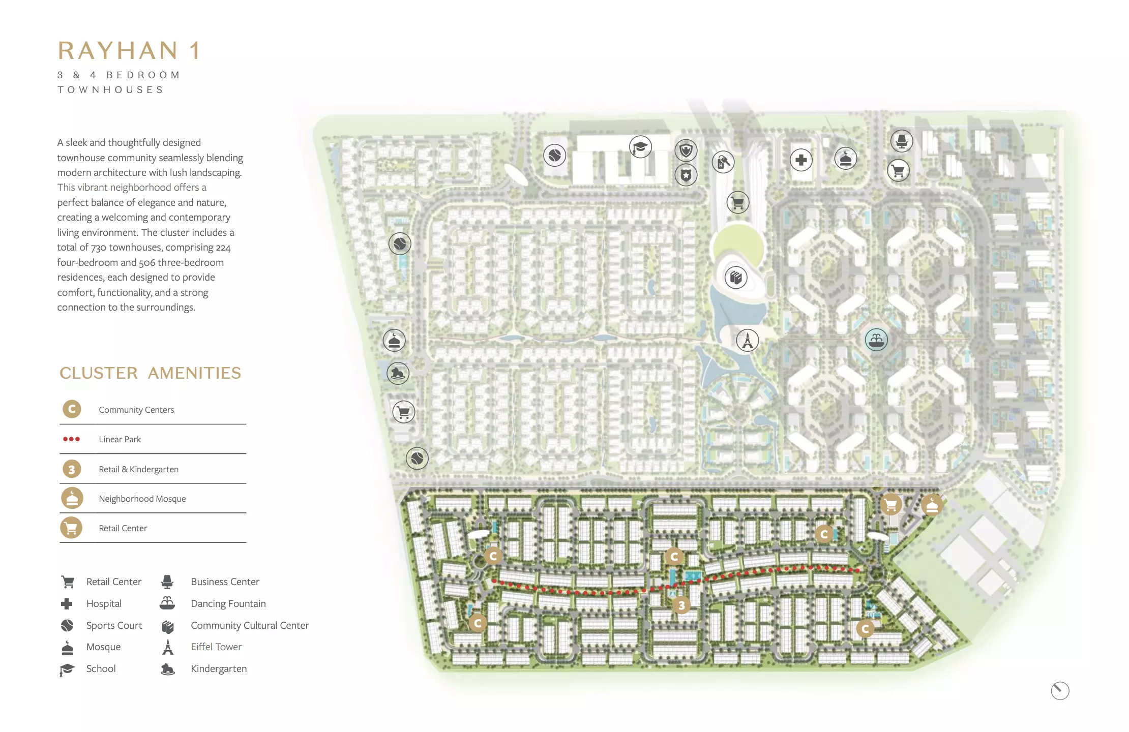 Rayhan offers two main townhouse options for potential buyers, each with specific unit sizes and starting prices. • 3-bedroom townhouse, starting at AED 2,691,100, with a built-up area beginning from 2,731 square feet. This layout is suitable for medium-sized families or individuals seeking extra living space. • 4-bedroom townhouse, which starts at AED 3,063,000 and features a minimum built-up area of 2,943 square feet. These units are designed to accommodate larger households or those who prefer additional rooms for work or leisure. Rayhan’s townhouse units combine modern layouts with ample living space, appealing to a variety of homeowners.