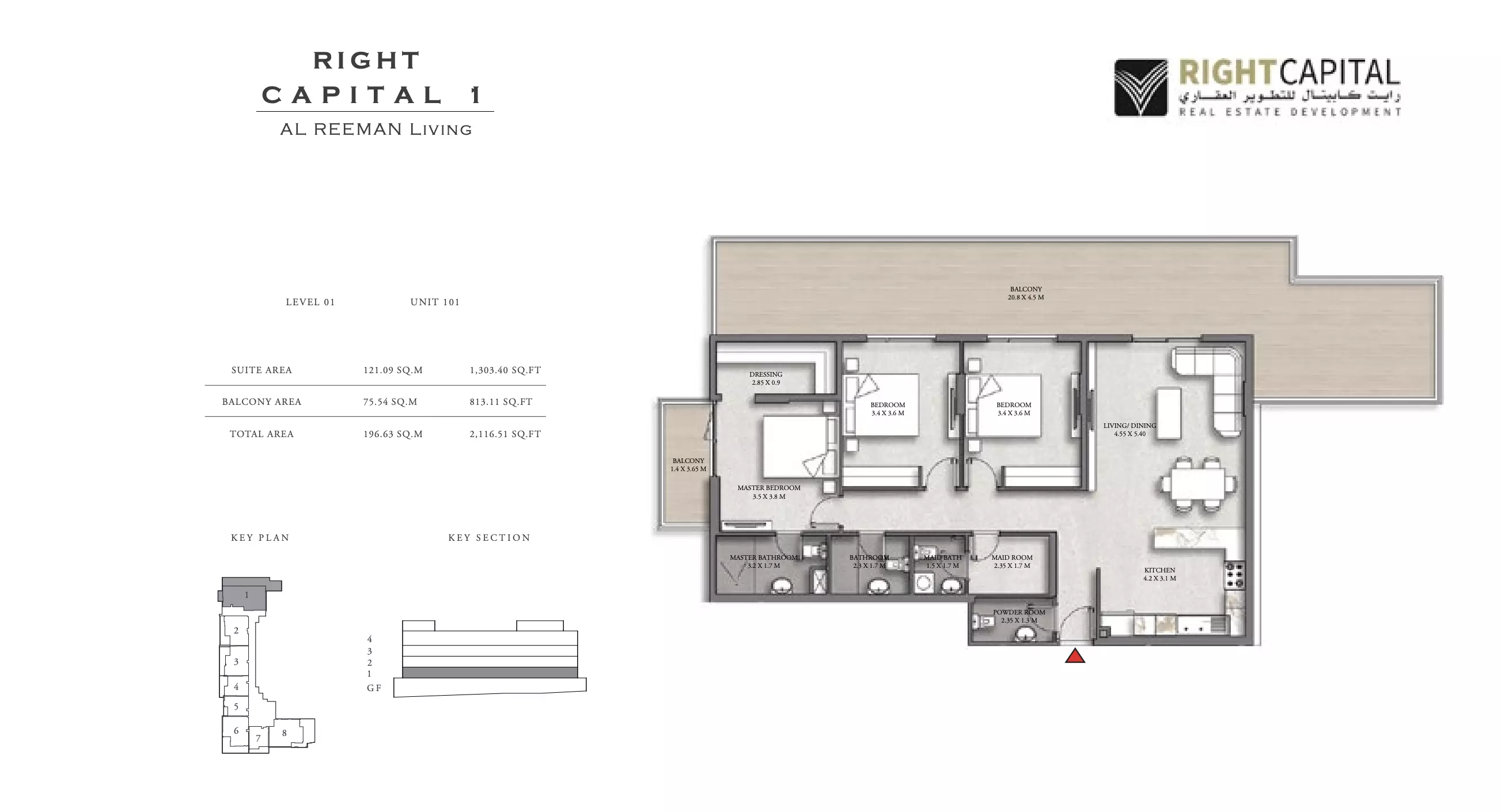 Right Capital 1 offers a selection of well-designed apartments tailored to meet different space and budget needs. The available units include 1-bedroom, 2-bedroom, and 3-bedroom apartments, each offering a practical layout and modern finishes. The 1-bedroom apartments start at 930,000 AED and range in size from 640 to 774 square feet, ideal for individuals or couples seeking efficient, contemporary living spaces. The 2-bedroom apartments start at 2.3 million AED and offer significantly more space, ranging from 2,160 to 3,051 square feet. These units are suitable for small families or investors looking for larger properties in a growing area. The 3-bedroom apartments are sized at 2,116 square feet, providing ample space for families who value comfort and room to grow. Each unit features private balconies, modern kitchens, and high-quality interior finishes, making Right Capital 1 a solid residential and investment choice in Alreeman, Al Shamkha.