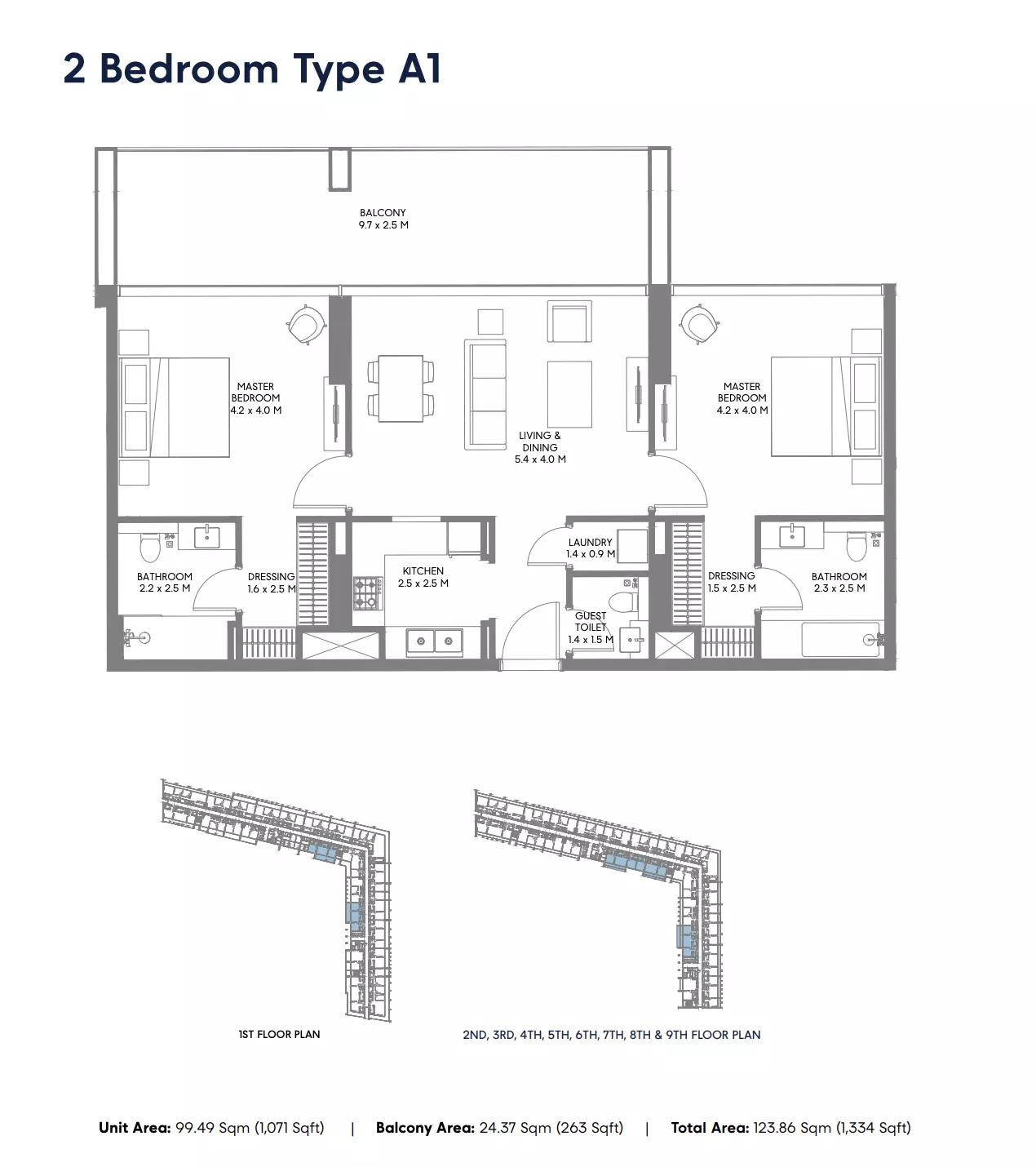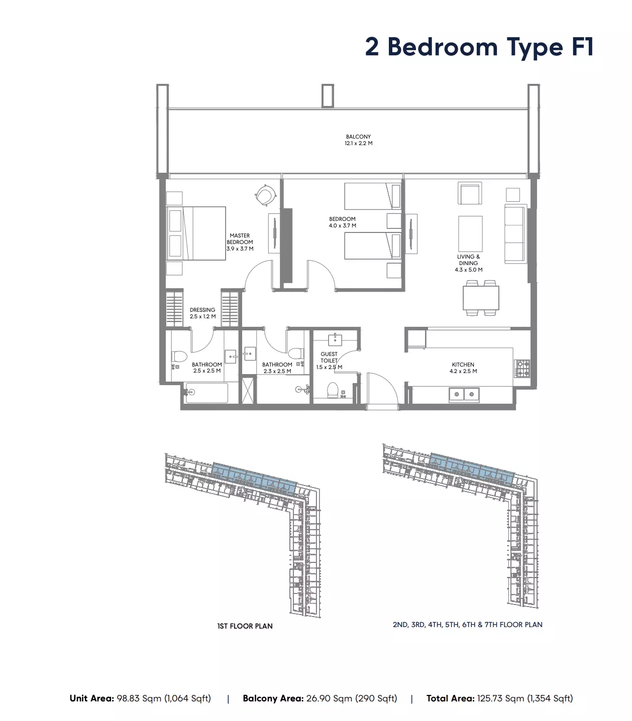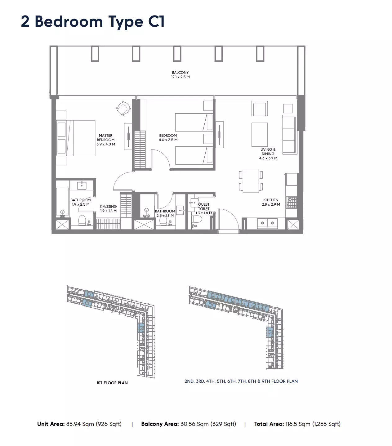 Safa Parkview offers a range of residential units, including one-bedroom, two-bedroom, and three-bedroom apartments. • The one-bedroom units are available from AED 1,582,000 with sizes ranging between 838 and 1,069 square feet. • Two-bedroom units start at AED 1,603,000 million and range in size from 1,255 to 1,929 square feet. For larger living spaces. • Three-bedroom apartments are available starting at AED 2,343,000 million, with unit sizes ranging from 1,948 to 2,811 square feet. These options cater to different lifestyle needs, offering both compact and spacious layouts. Pricing and availability are subject to change based on current market conditions.