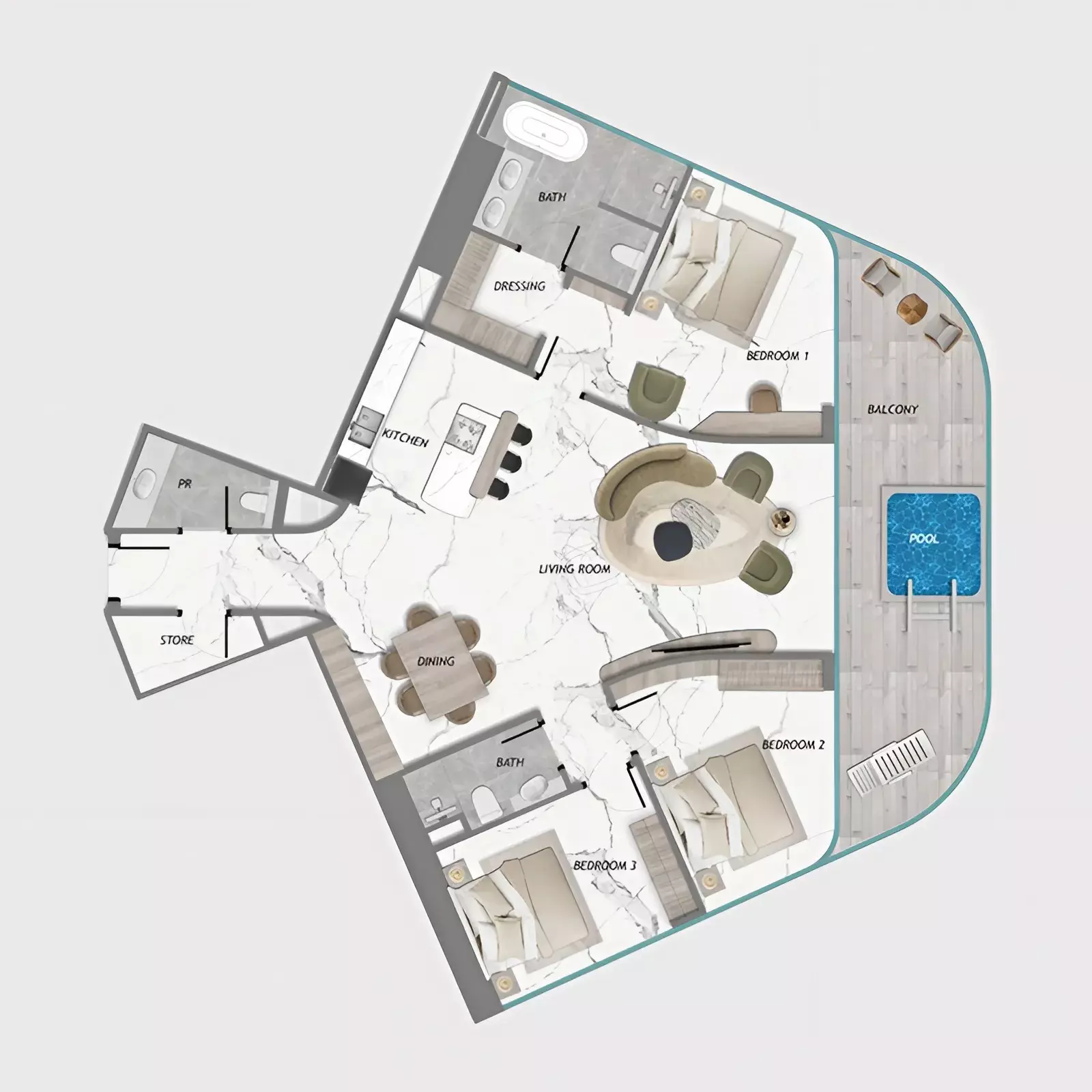 | Type A | 3 bedroom + pool | 1,874.00 | View |